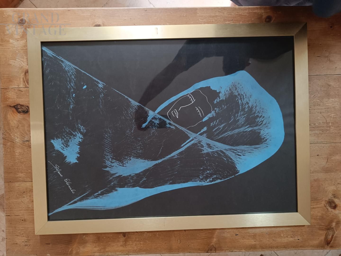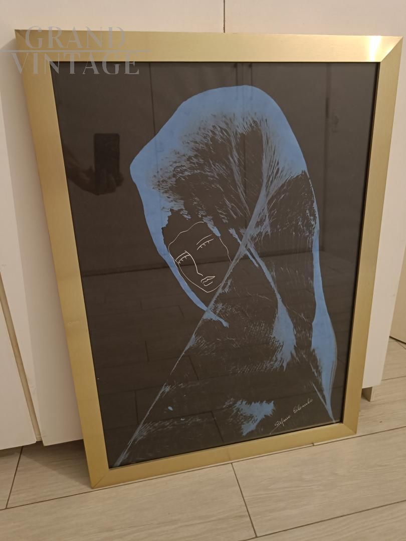 Magnifico dipinto di Stefano Colombo con ritratto di donna in blu su sfondo nero. Sul retro si può trovare un adesivo con certificazione.