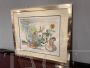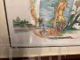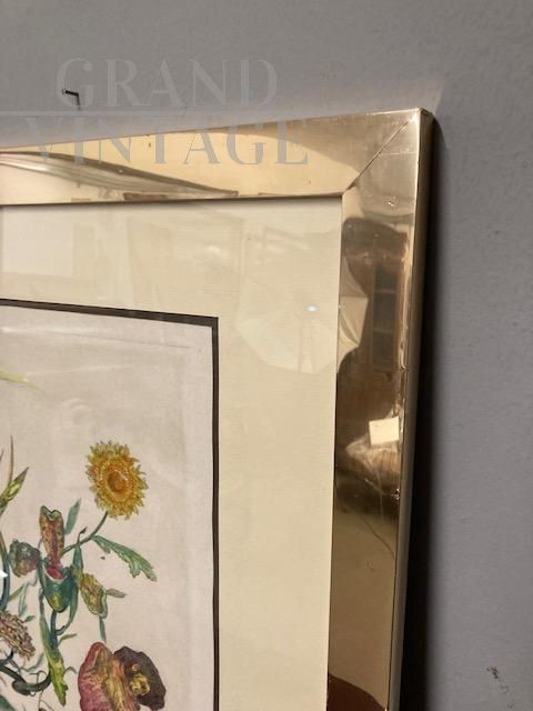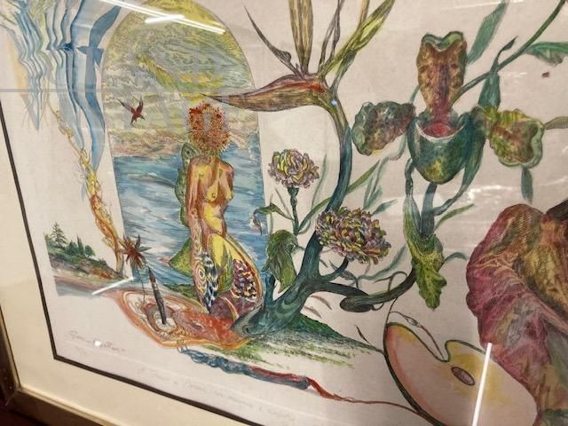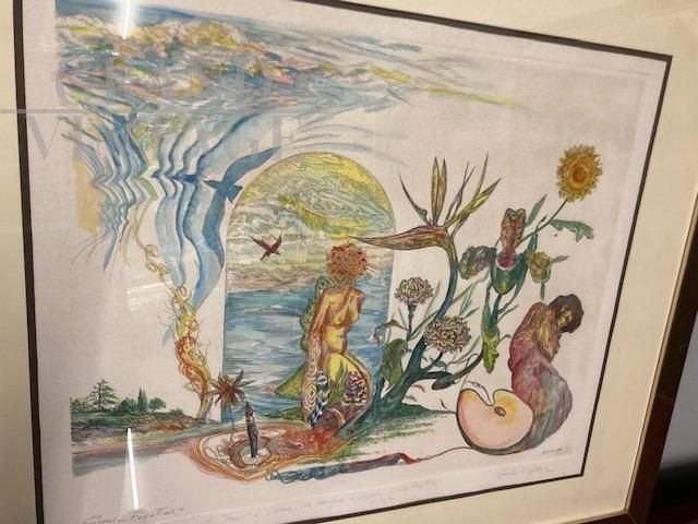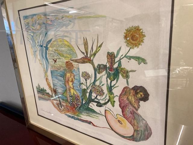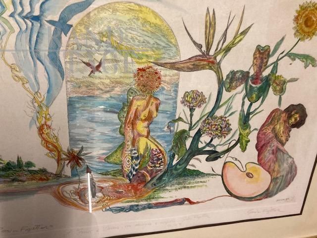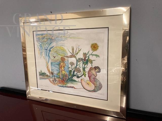 Incisione surrealista acquerellata di Gordon Farghetter del 1976 in cornice ottonata lucida.