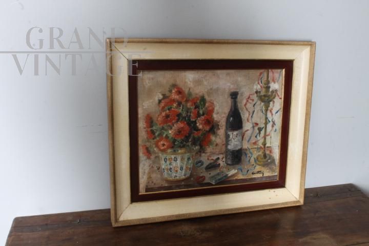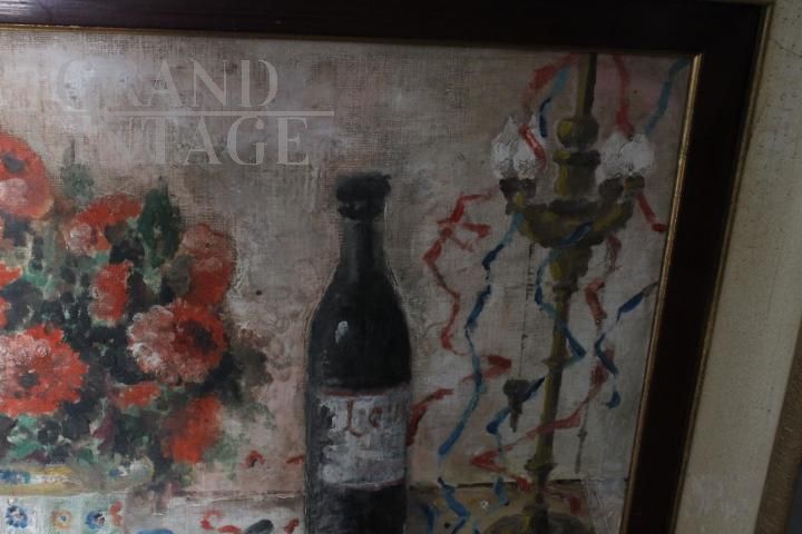 Dipinto antico olio su tela di epoca Liberty, 1930 - 1940, raffigurante natura morta con bottiglia di vino e fiori rossi in vaso, di scuola italiana, firmato in basso a destra. Molto buono lo stato conservativo, non richiede nessun intervento. Olio su tela riportato su tavoletta.