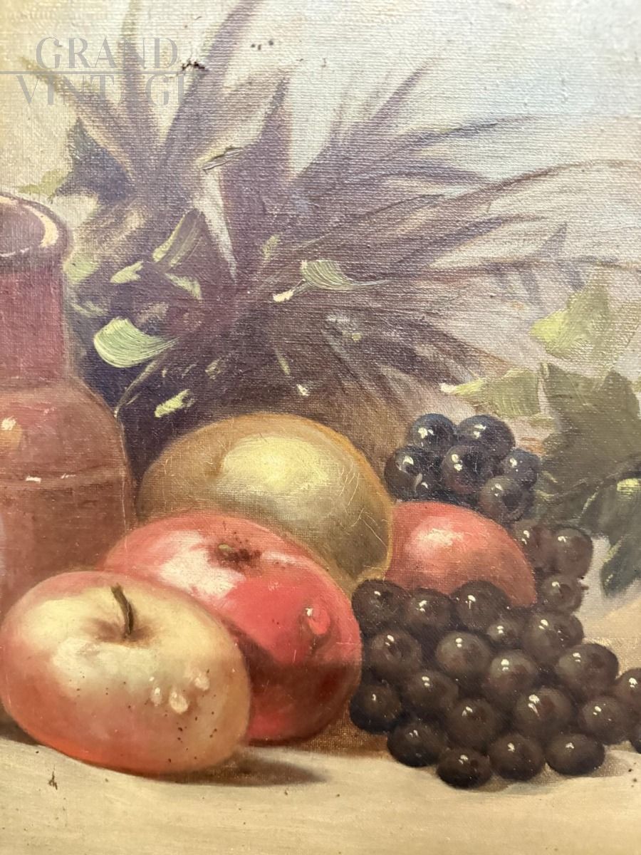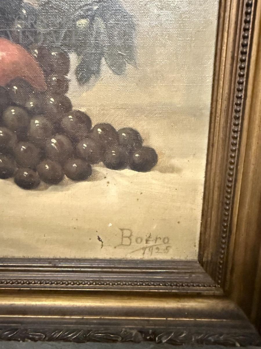 Dipinto di epoca liberty olio su tela raffigurante natura morta con frutta, Italia 1925, 60 x 55cm, firmato e datato in basso a destra, in cornice dorata coeva. Buono stato, bella qualità.
