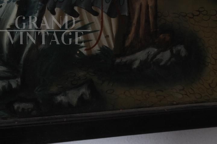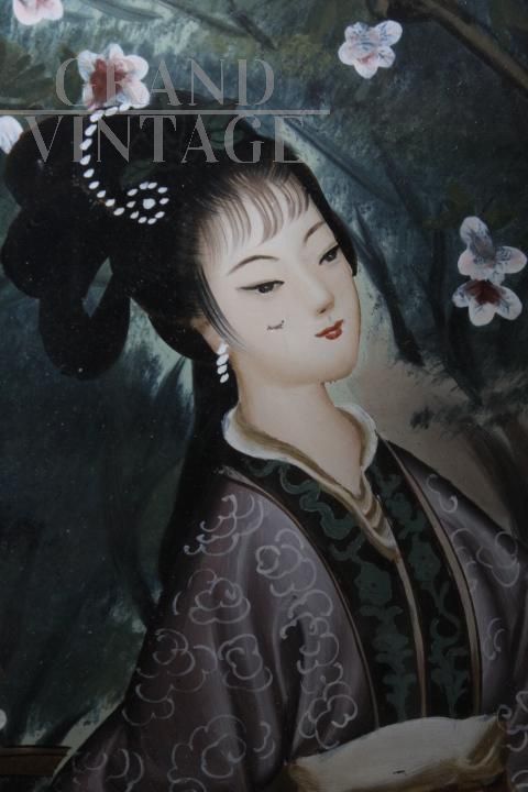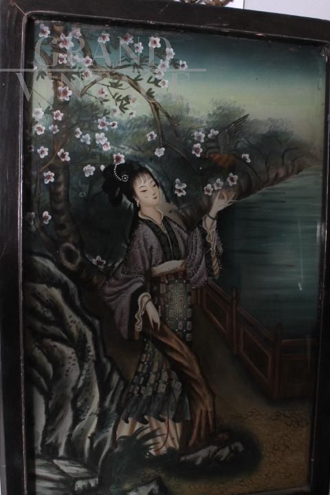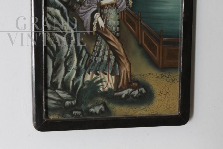 Antico bellissimo dipinto su vetro raffigurante Geisha Giapponese risalente ai primi anni del '900. Bellissima la qualità pittorica. In cornice di legno laccata nera coeva. In buono stato di conservazione.