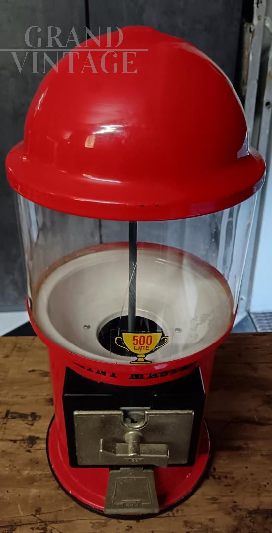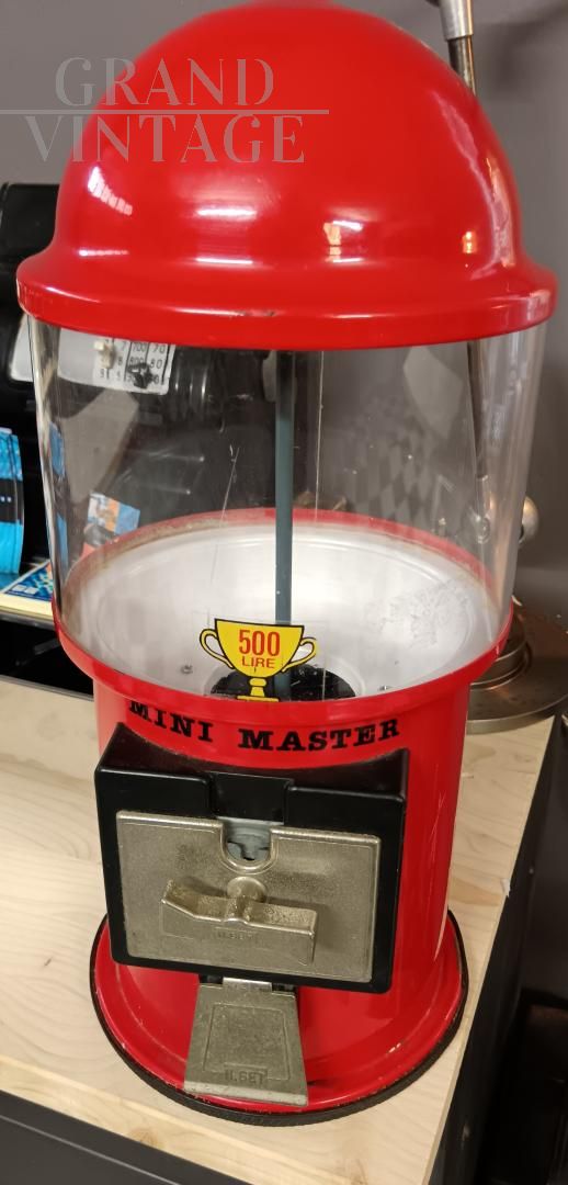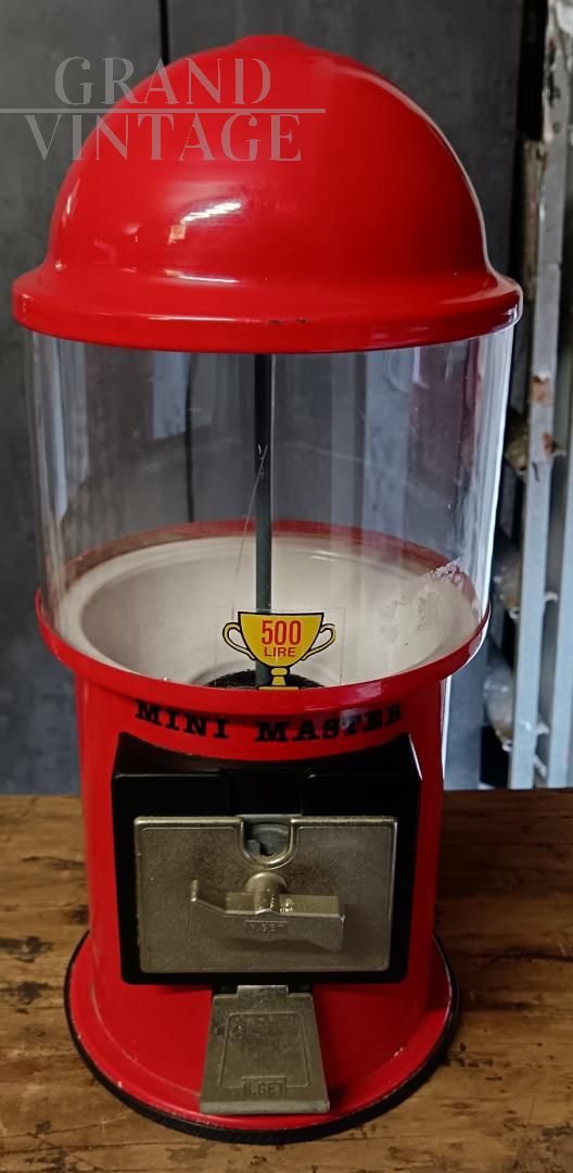Magnifico distributore di caramelle vintage da bancone Mini Master, Italia anni '70, in perfetto stato e funzionante. Insieme all'oggetto verranno fornite anche le monete da 500 lire italiane per far scendere il dolcetto. Il corpo è in metallo rosso, senza difetti, la boule è in plastica di policarbonato.
