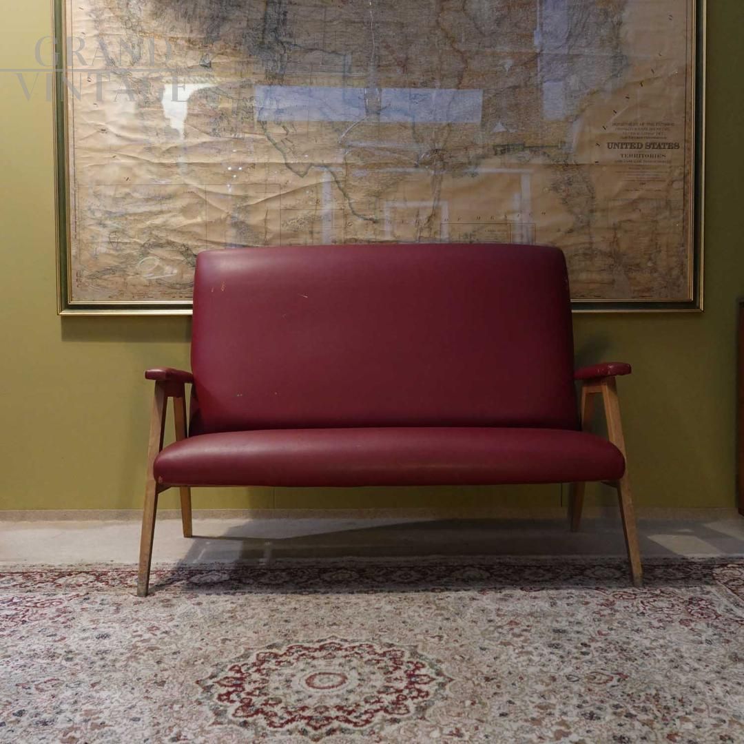 Divano stile anni ’60 con rivestimento in skai bordeux e struttura in legno, un pezzo iconico che richiama il design moderno ed essenziale del dopoguerra. Linee geometriche, materiali resistenti e un’estetica vintage lo rendono perfetto per arredamenti retrò, spazi creativi o set dal gusto mid-century.