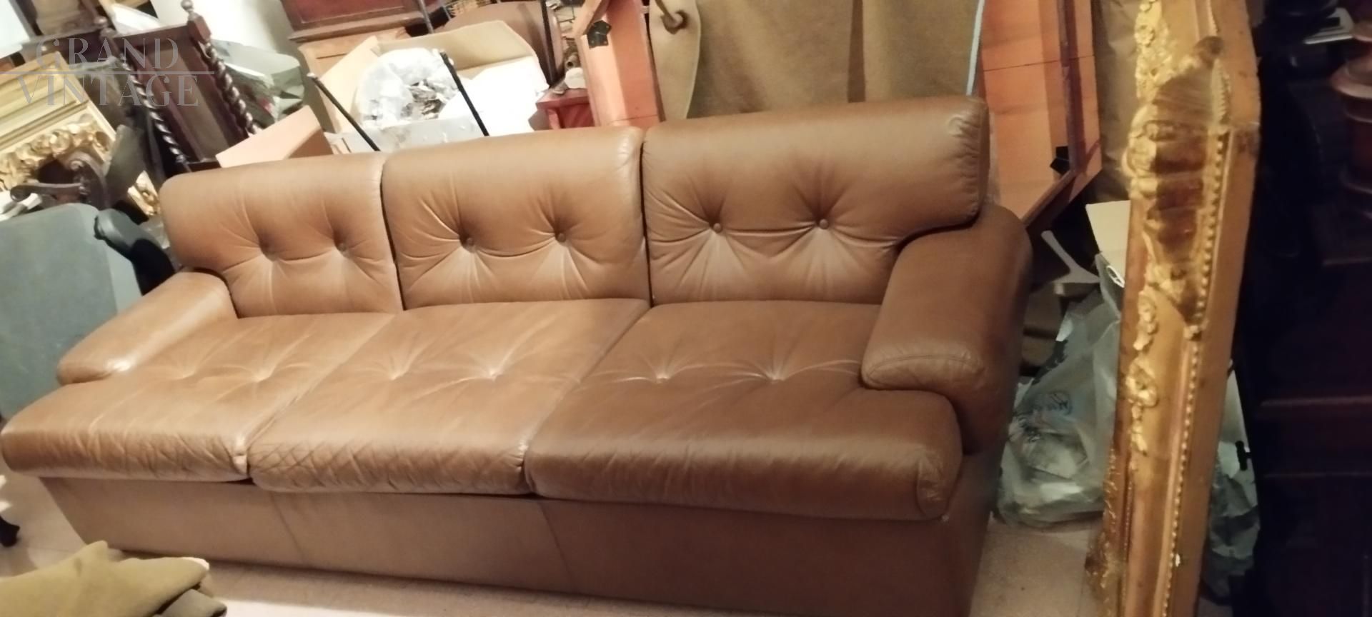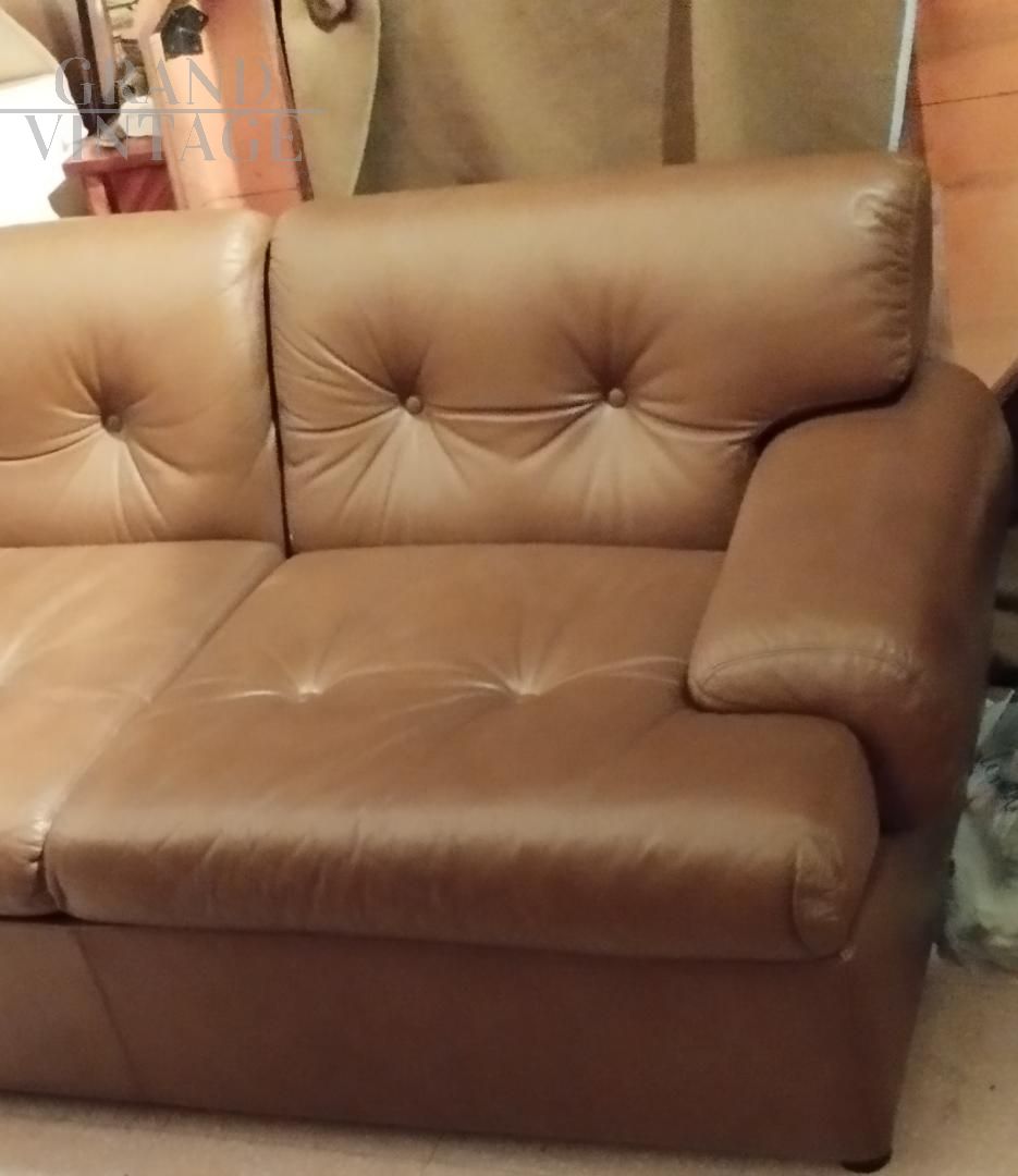 Divano a tre posti in pelle marrone, design di Ranzani per Elam, modernariato italiano anni '70.