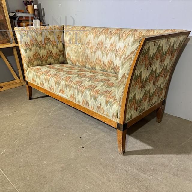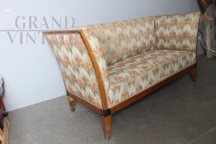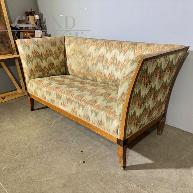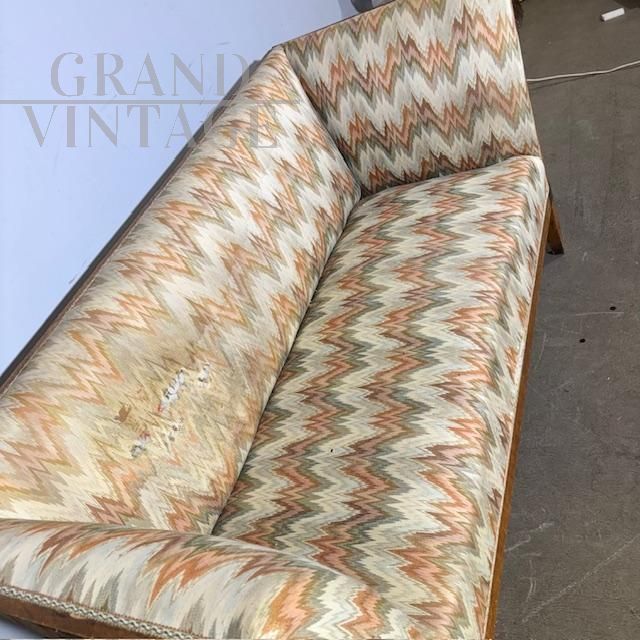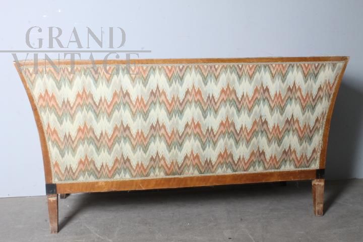 Divano antico del '700 di epoca Luigi XVI realizzato in legno di noce e tessuto con geometrie, perfetto anche da centro, misure 170 x 66 cm. Molto bella la linea. Il divano è da restaurare, come da foto.