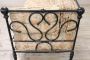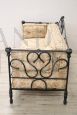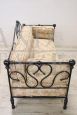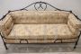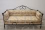 Divano antico in ferro battuto di grandi dimensioni della fine del XIX secolo. Il ferro presenta una raffinata ed elaborata decorazione a riccioli e volute, presente su ogni lato, per cui è possibile posizionare il divano anche al centro della stanza per rendere visibile la bella decorazione dello schienale. Rivestito in raffinato tessuto con decorazione floreale, è in buone condizioni. L'imbottitura della seduta presenta difetti di usura e ha perso la sua consistenza rigida, si consiglia un restauro interno. Prezzo trattabile.