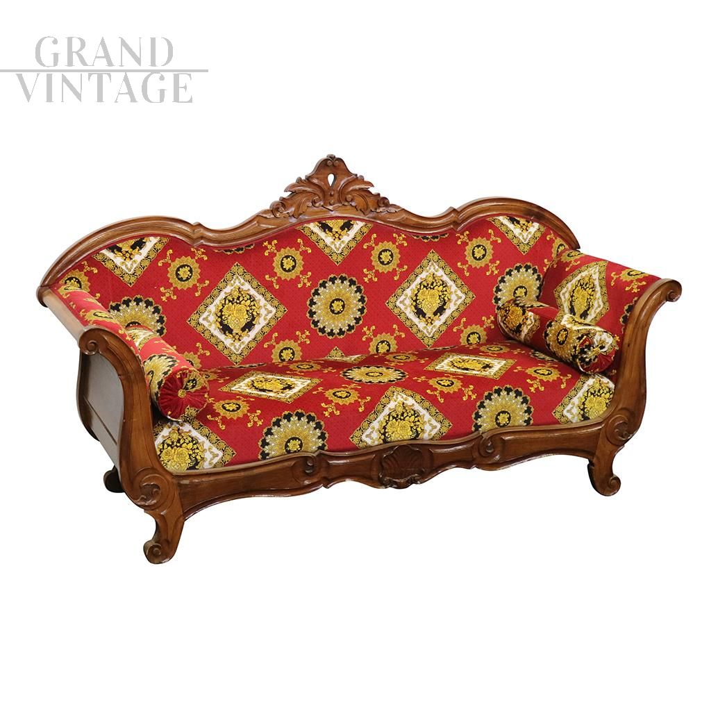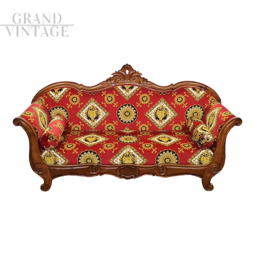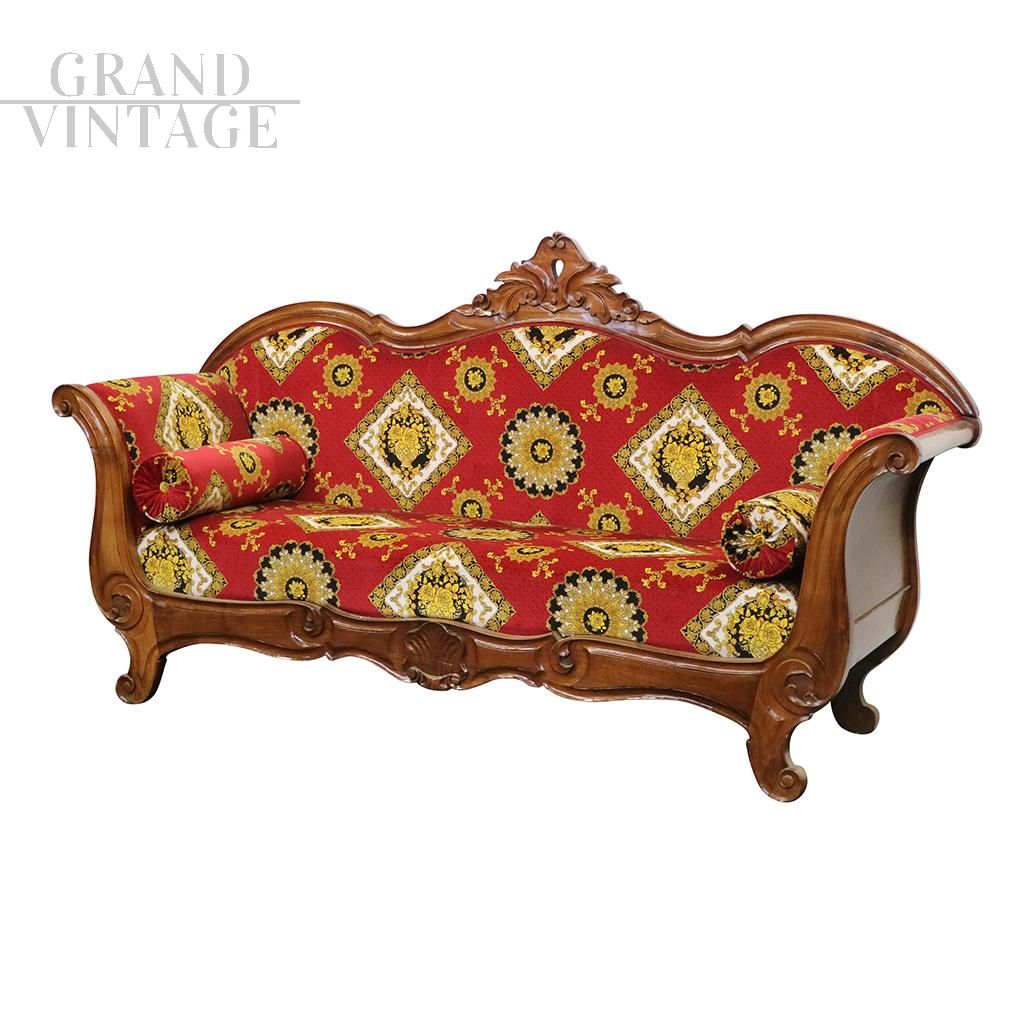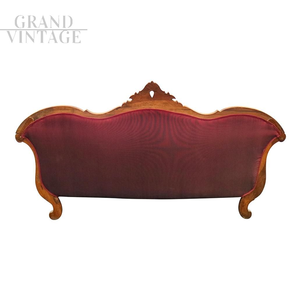 Divano antico di epoca Luigi Filippo di metà '800 con struttura in noce massello intagliato a mano e tappezzeria in tessuto damascato su sfondo rosso. Il divano è stato completamente restaurato e ritappezzato.