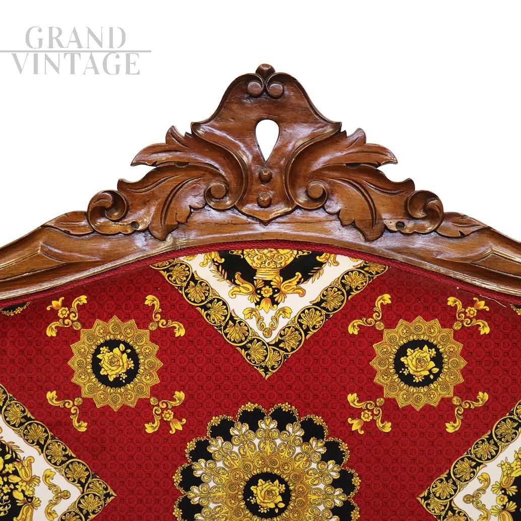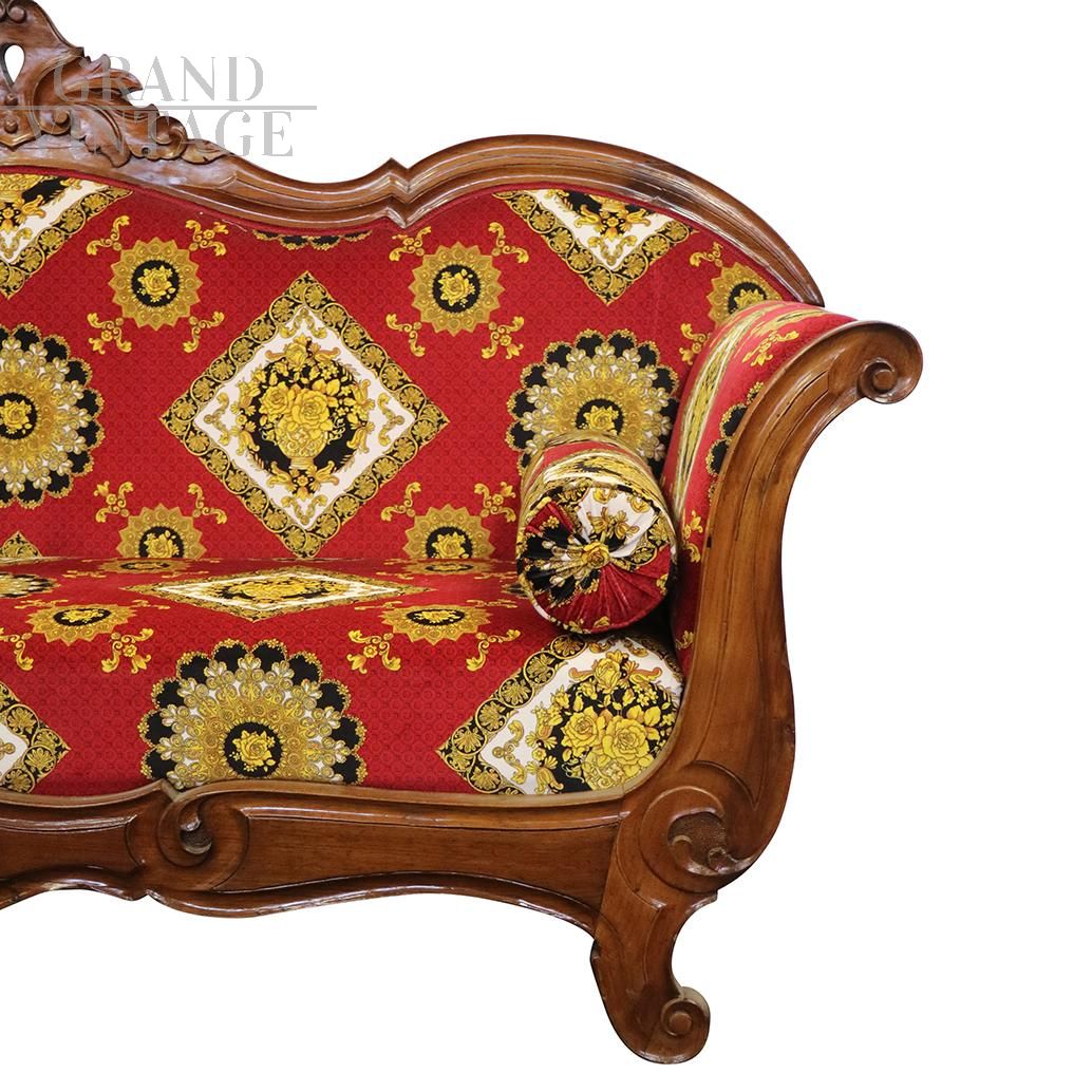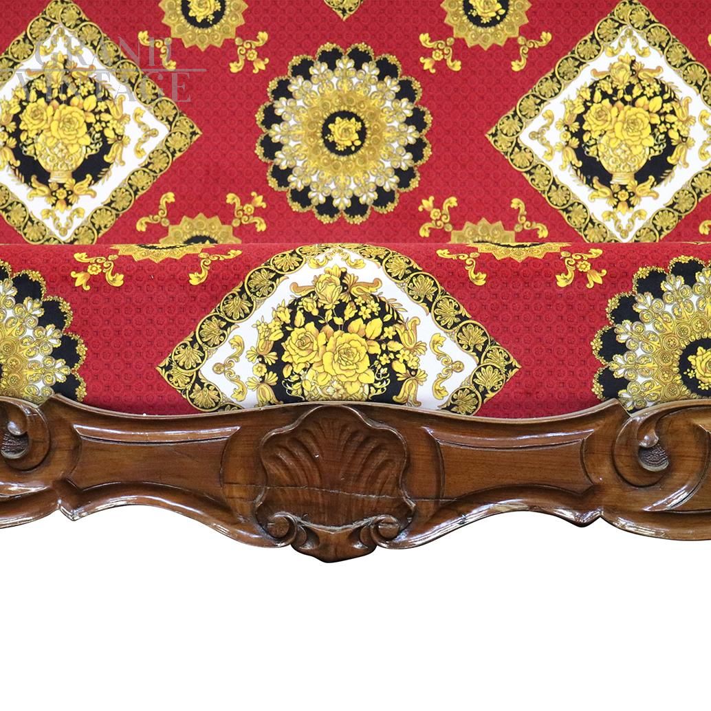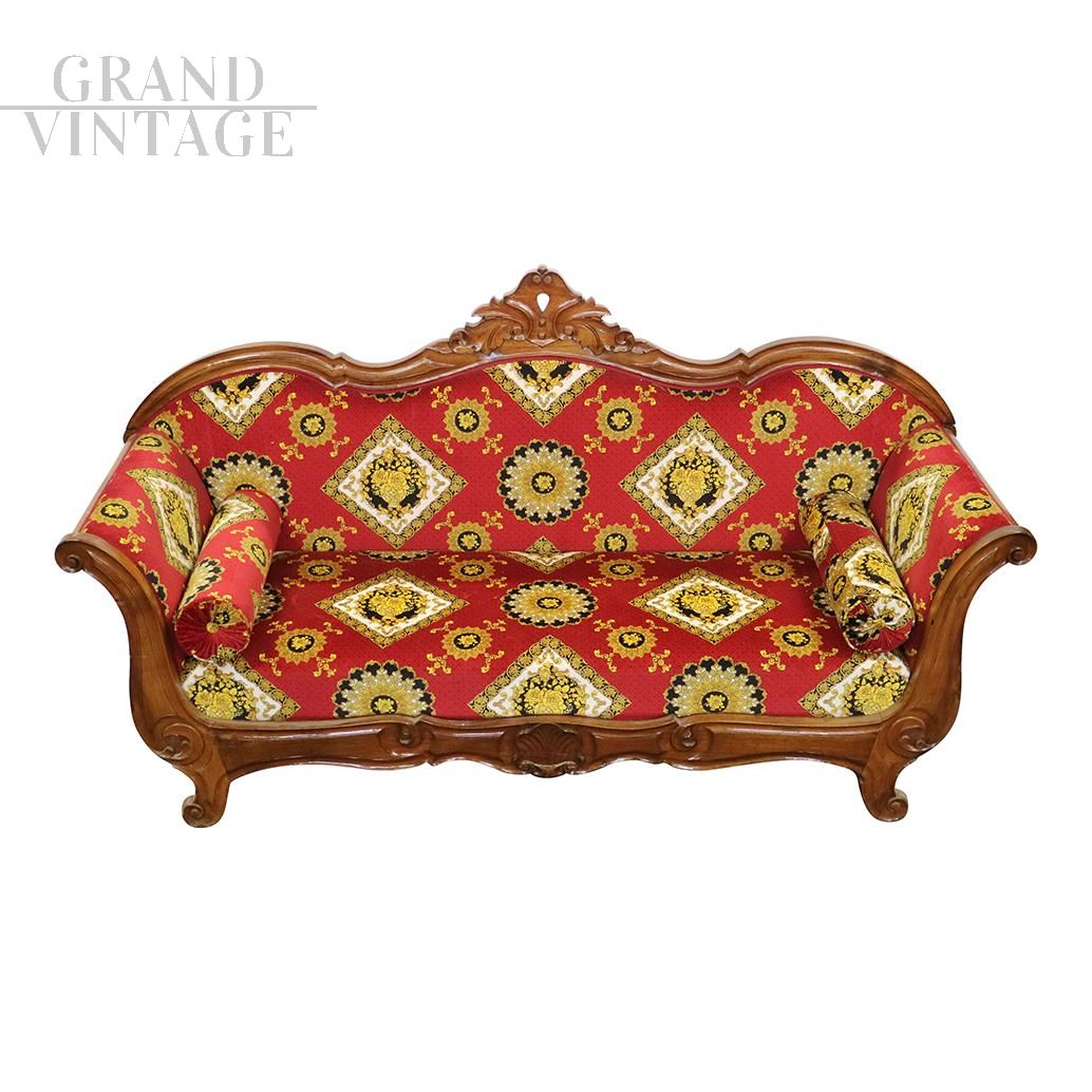 Divano antico di epoca Luigi Filippo di metà '800 con struttura in noce massello intagliato a mano e tappezzeria in tessuto damascato su sfondo rosso. Il divano è stato completamente restaurato e ritappezzato.