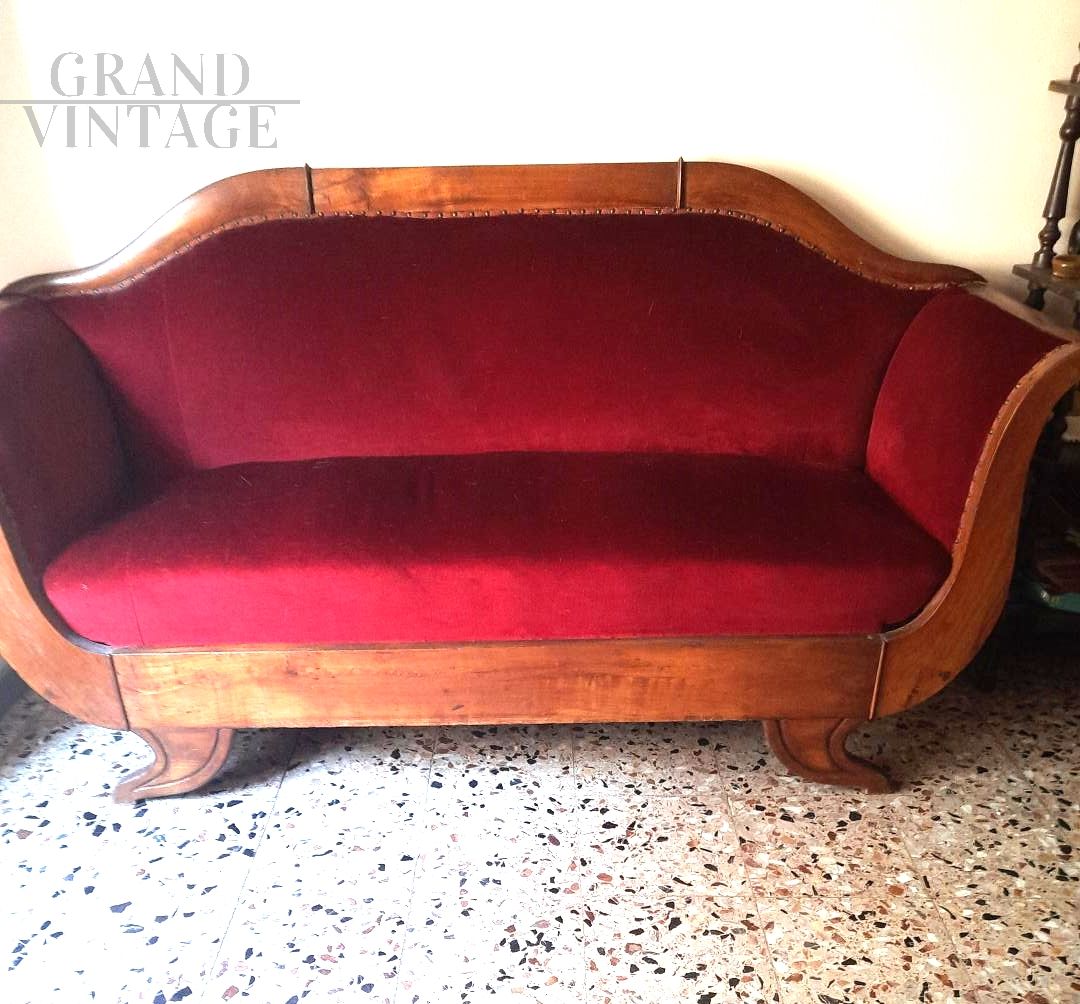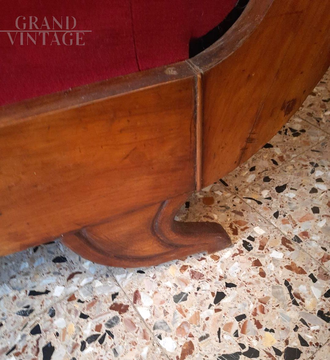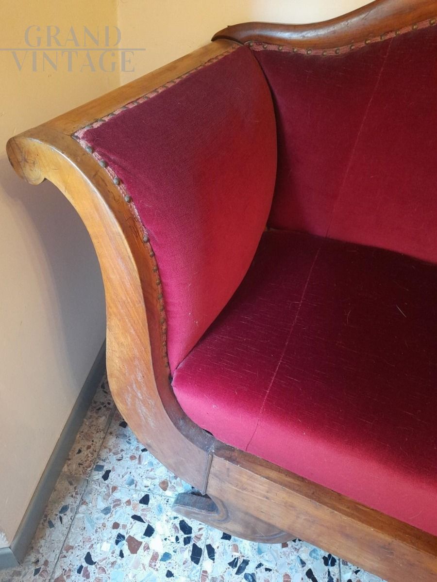 Elegante divano antico Carlo X in legno di noce, rivestito in velluto rosso, in buone condizioni come da foto. Presenta i naturali segni del tempo.