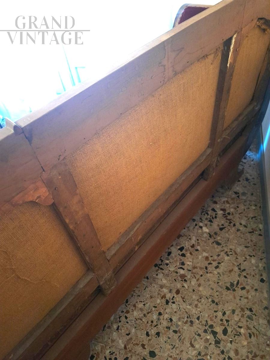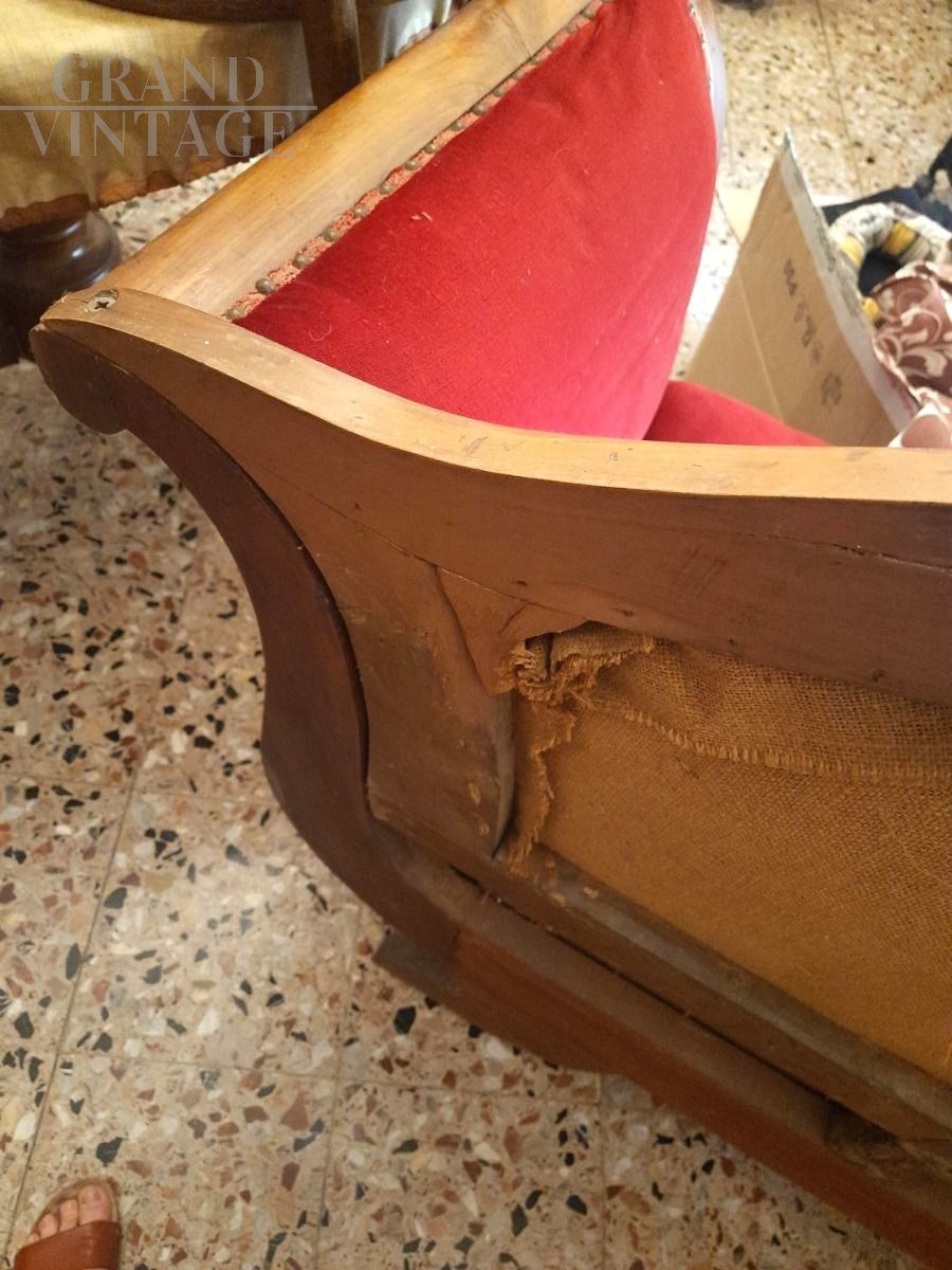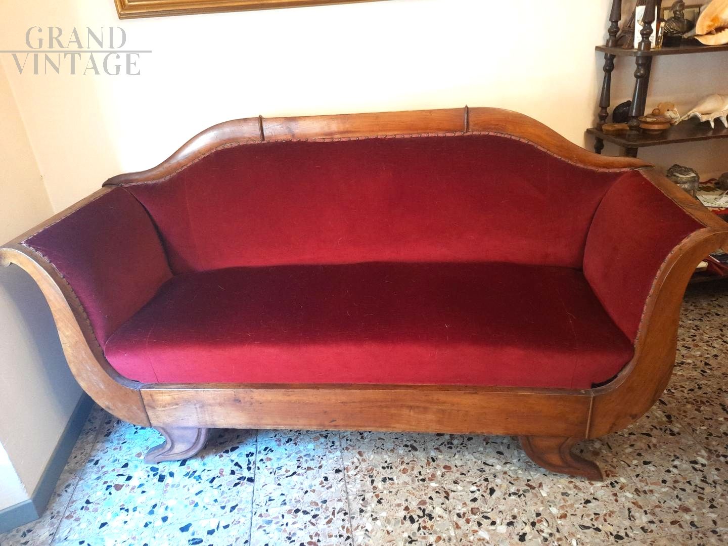 Elegante divano antico Carlo X in legno di noce, rivestito in velluto rosso, in buone condizioni come da foto. Presenta i naturali segni del tempo.