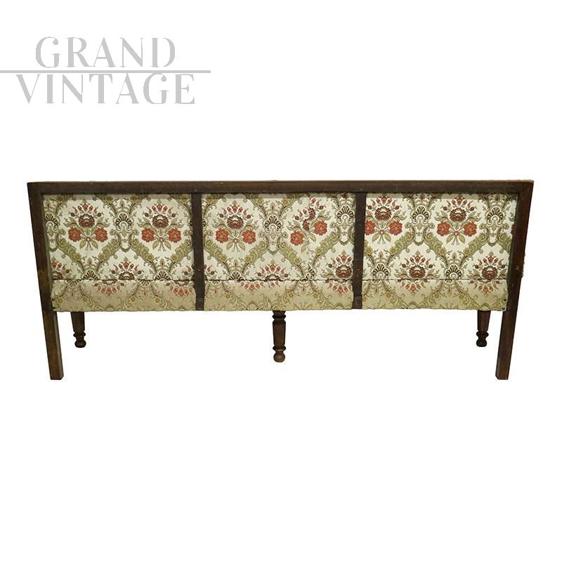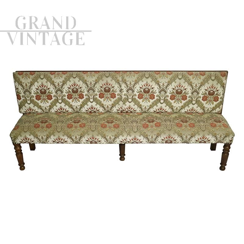 Divano di pregio del XIX secolo con struttura in noce massello e rivestimento dell'imbottitura in tessuto damascato con eleganti motivi floreali. La sua linea geometrica squadrata facilita l'inserimento di questa seduta in ambienti di diversi stili sia moderni che antichi.