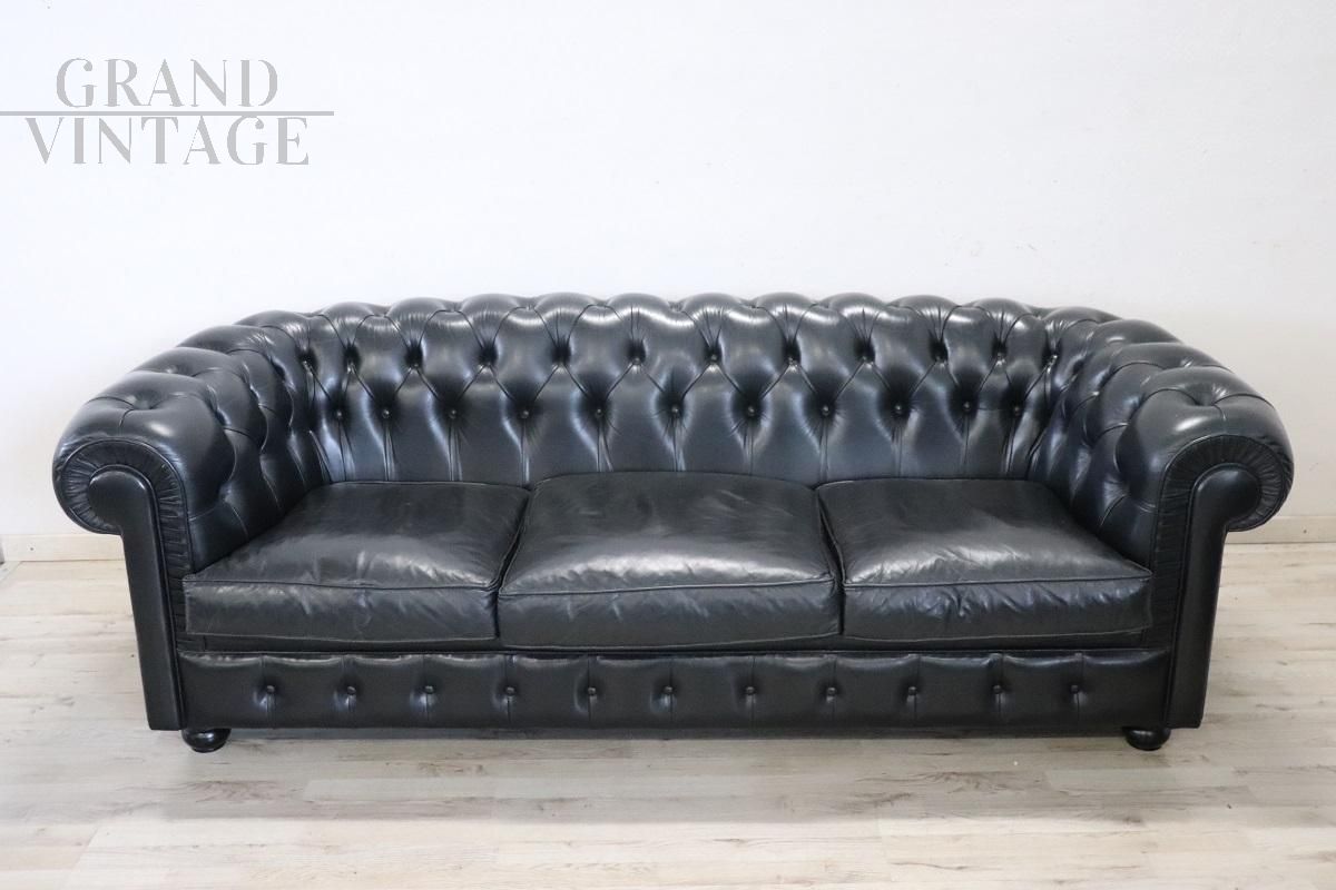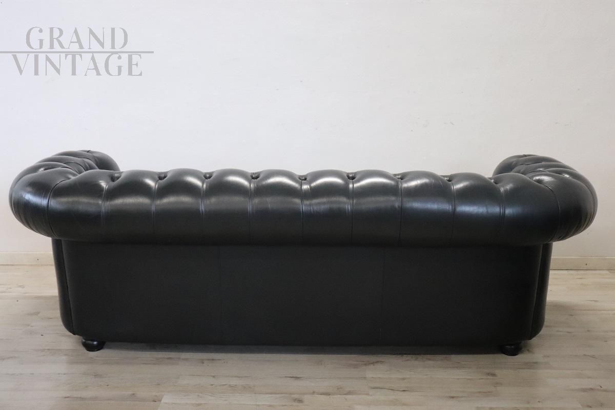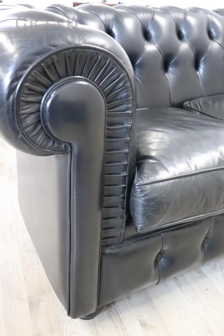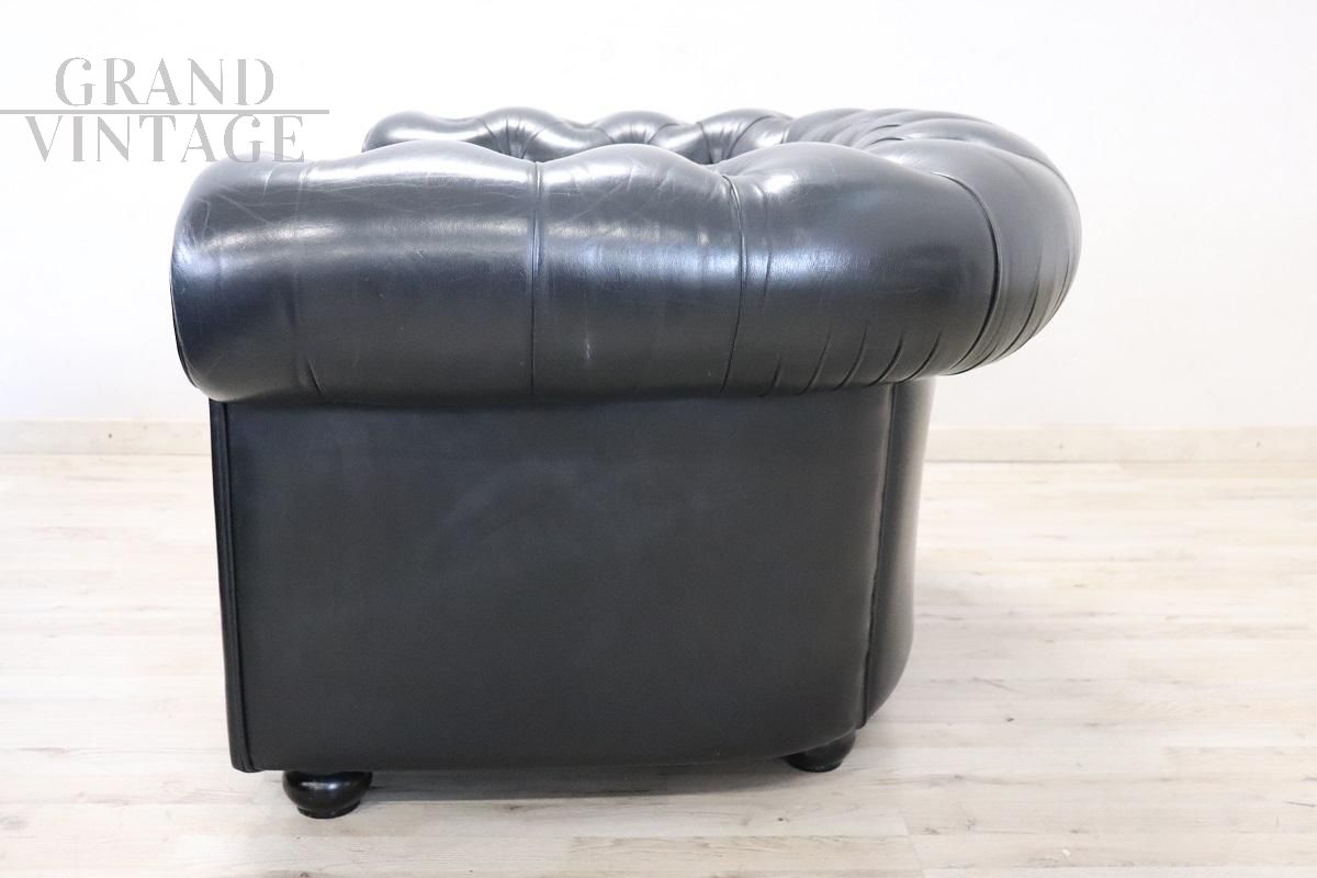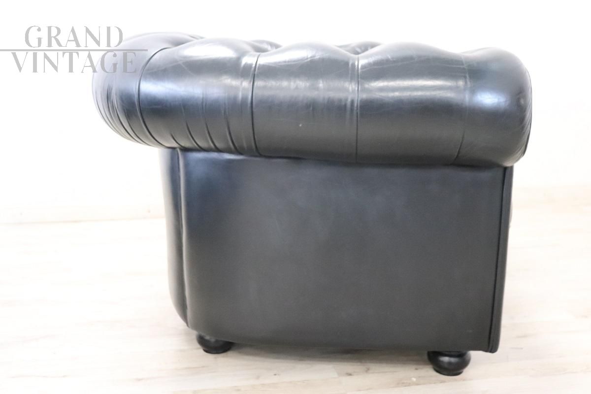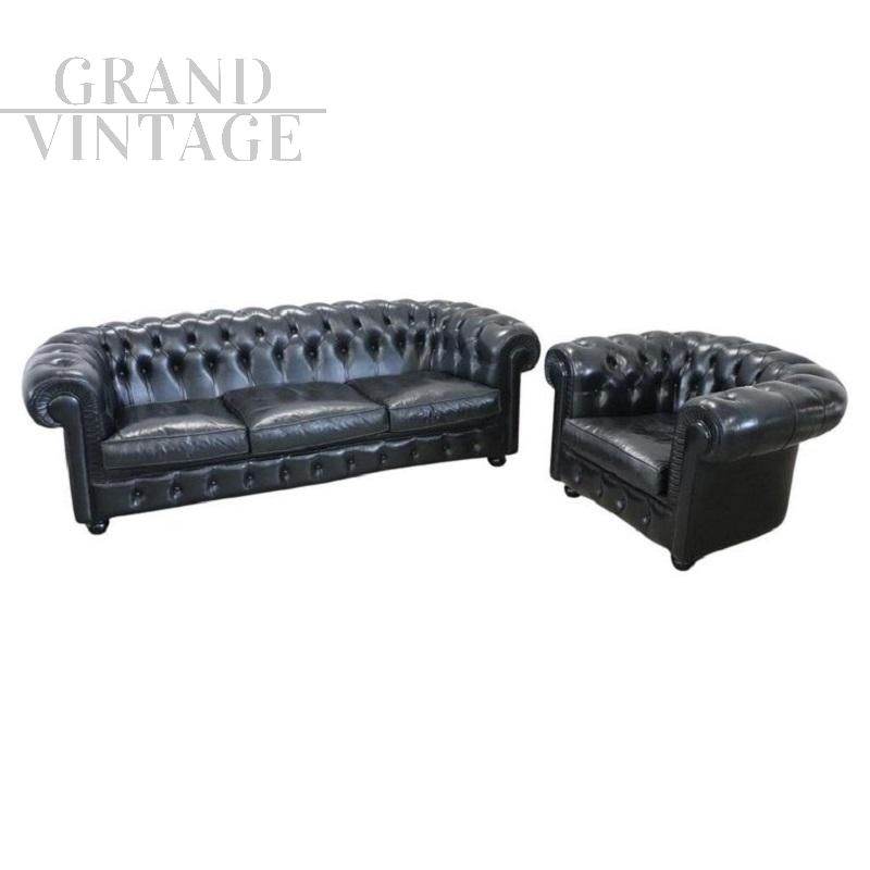 Divano e poltrona in pelle nera in stile Chesterfield, anni '80
