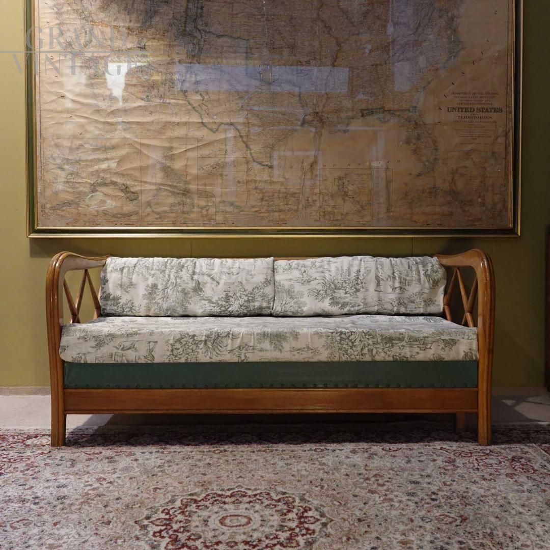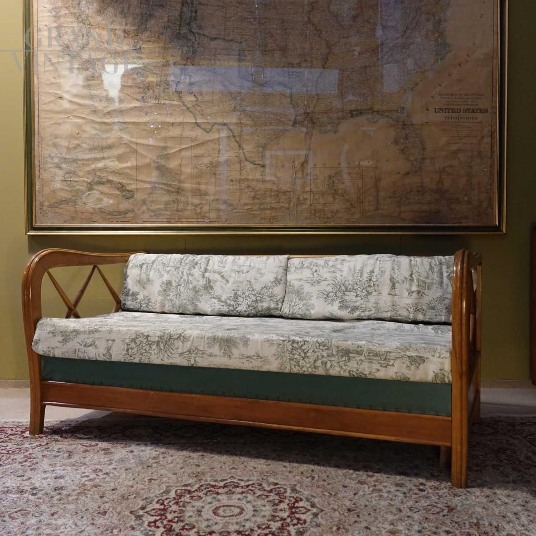 Bellissimo divano vintage nello stile di Paolo Buffa con la classica struttura in legno curvato, rivestito in tessuto toile de jouy, dall’anima rustica e accogliente, perfetto per ricreare atmosfere calde e rilassate. Le linee morbide e i materiali naturali evocano il fascino delle case di campagna, rendendolo ideale per ambienti dallo stile shabby, farmhouse o boho chic.