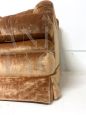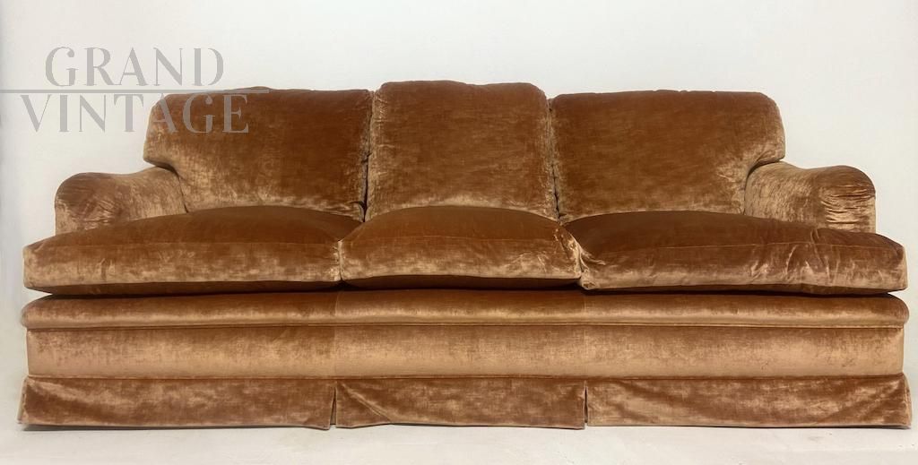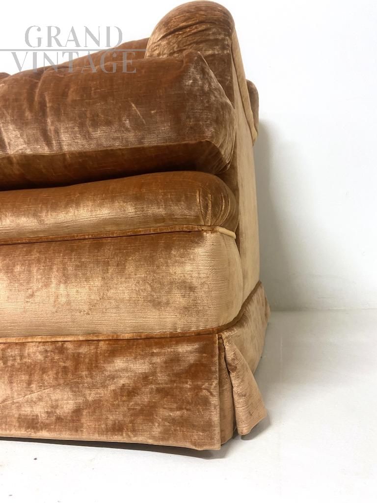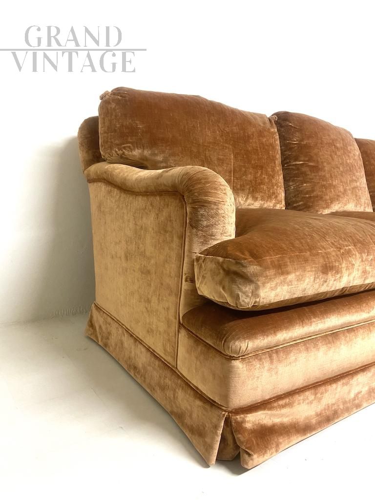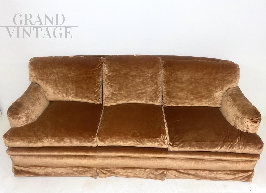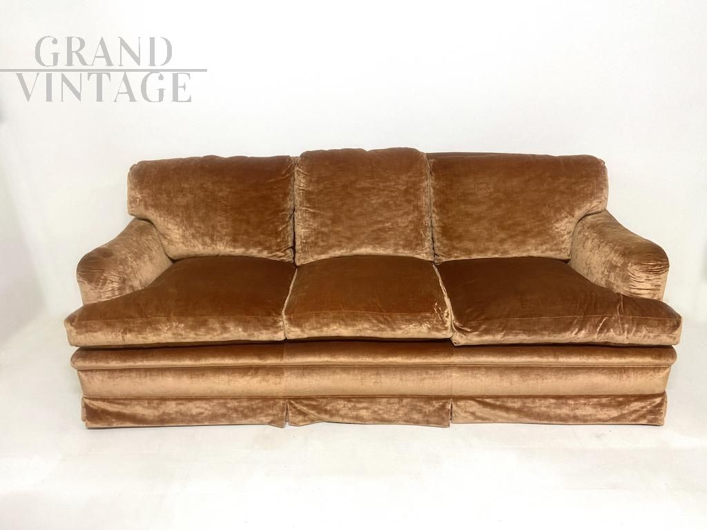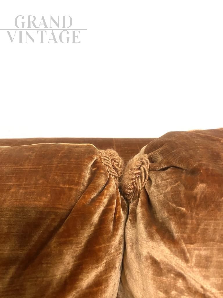 Raffinato divano vintage italiano con struttura classica interamente fabbricato e confezionato a mano, con rivestimento in velluto nobile di seta color tawny brown (fulvo) con tocchi di luce.