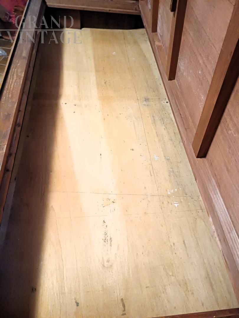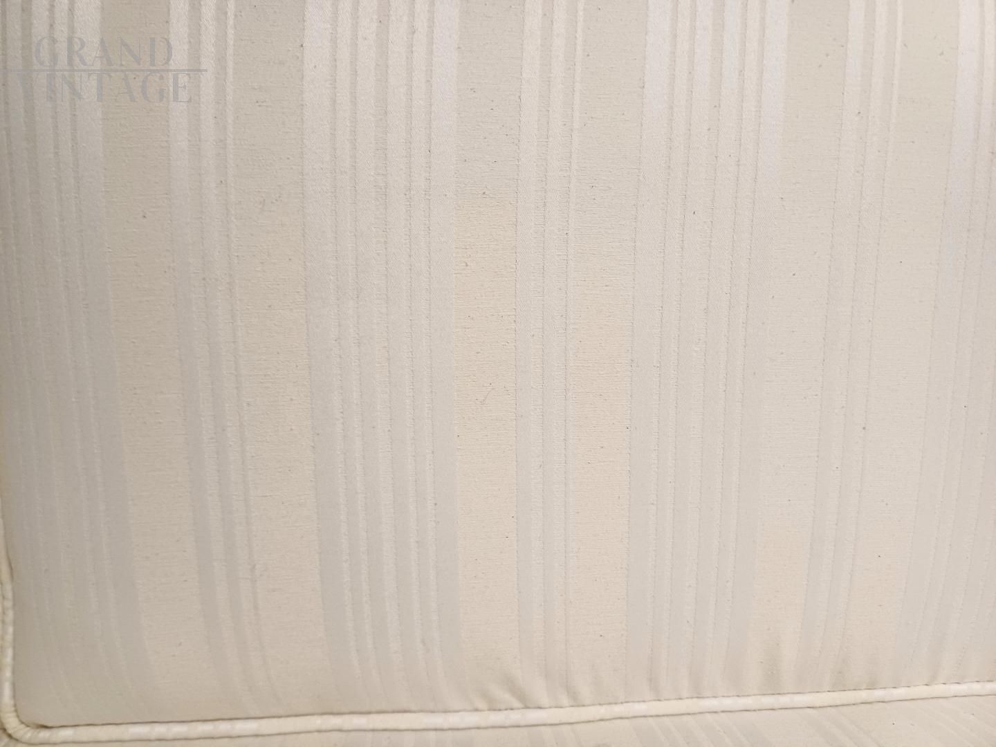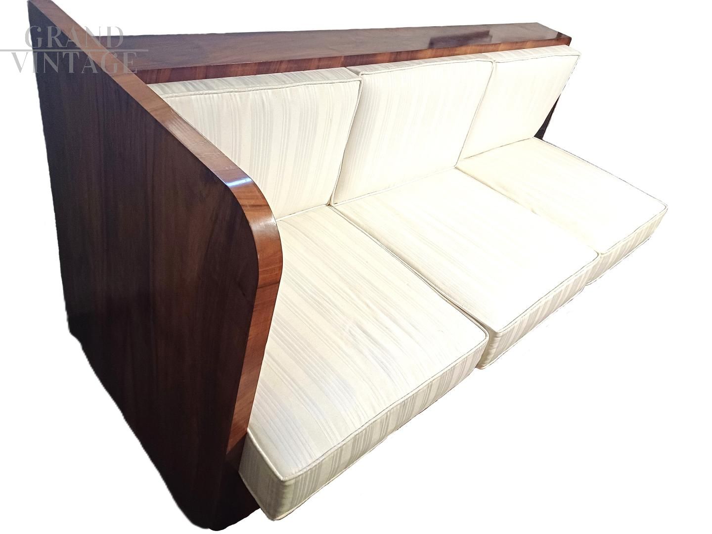 Divano letto a 3 posti in radica di noce, del periodo bellico/post-bellico. Design geometrico con linee essenziali e funzionali. Struttura robusta con vano contenitore sottostante e cuscini completamente rifoderati in tessuto colore chiaro. Condizioni ottime, può presentare lievi segni dell’età.