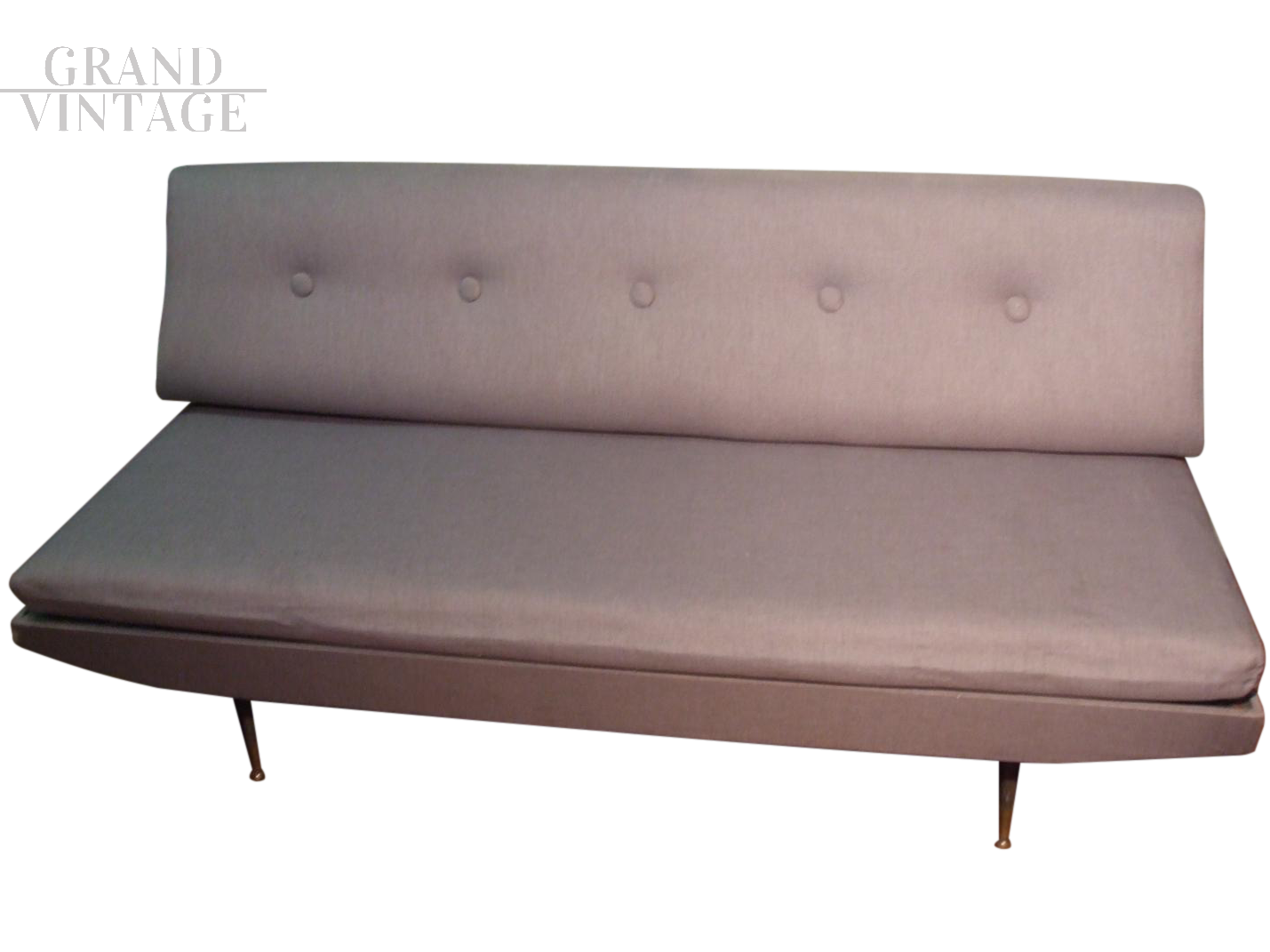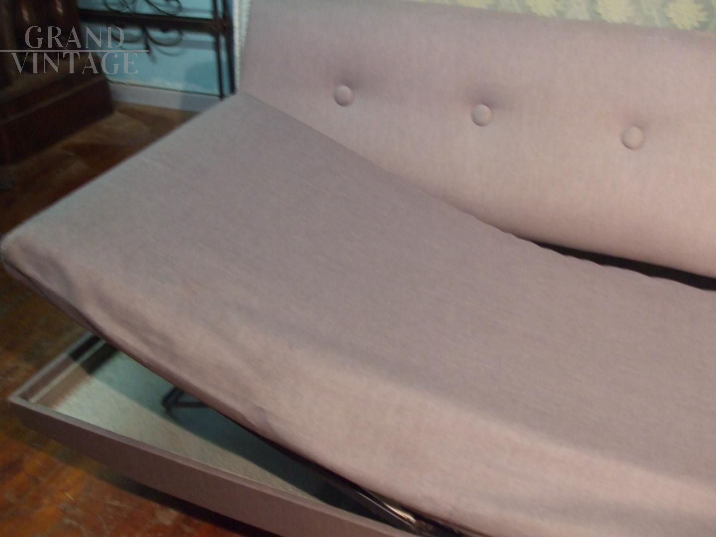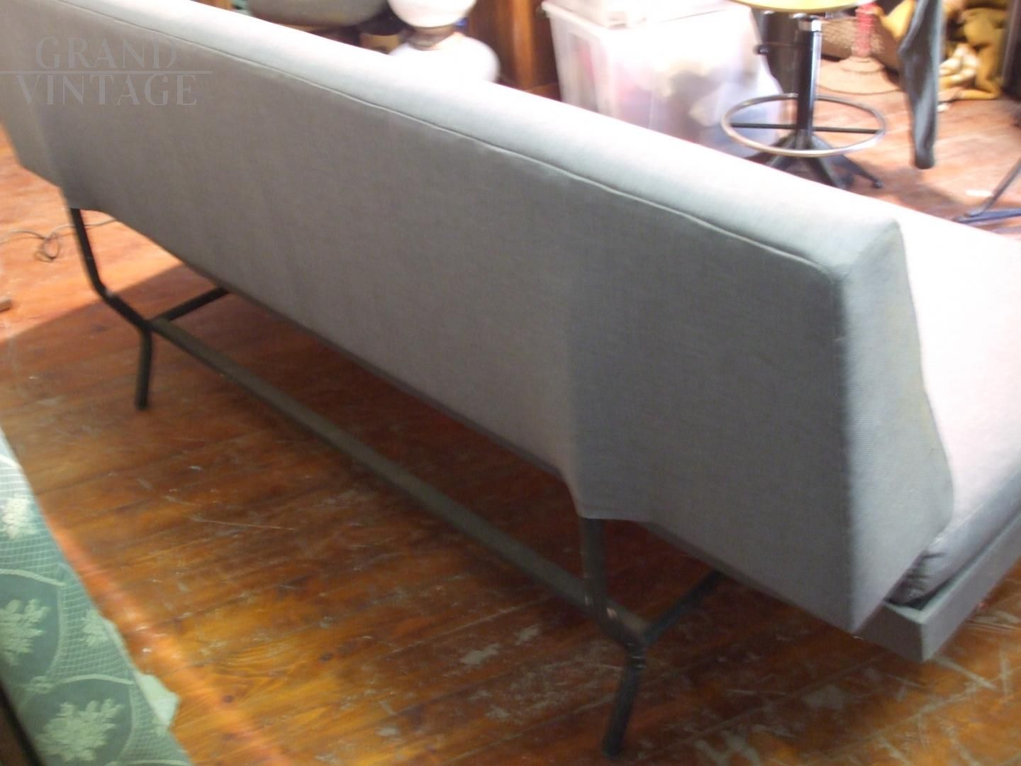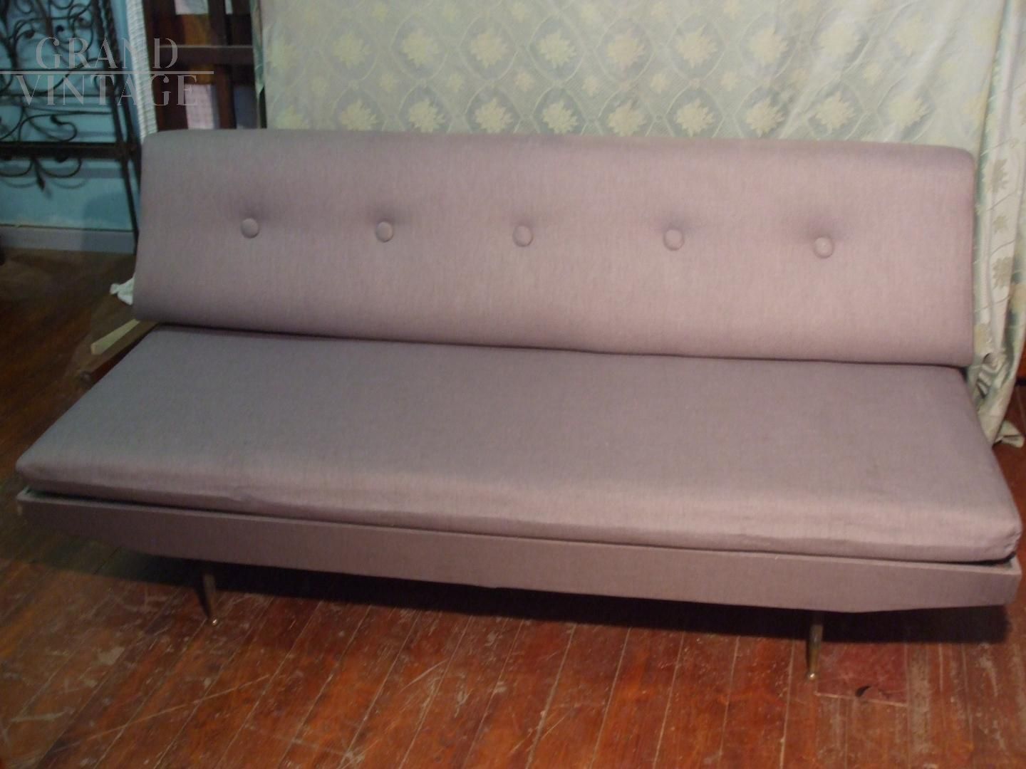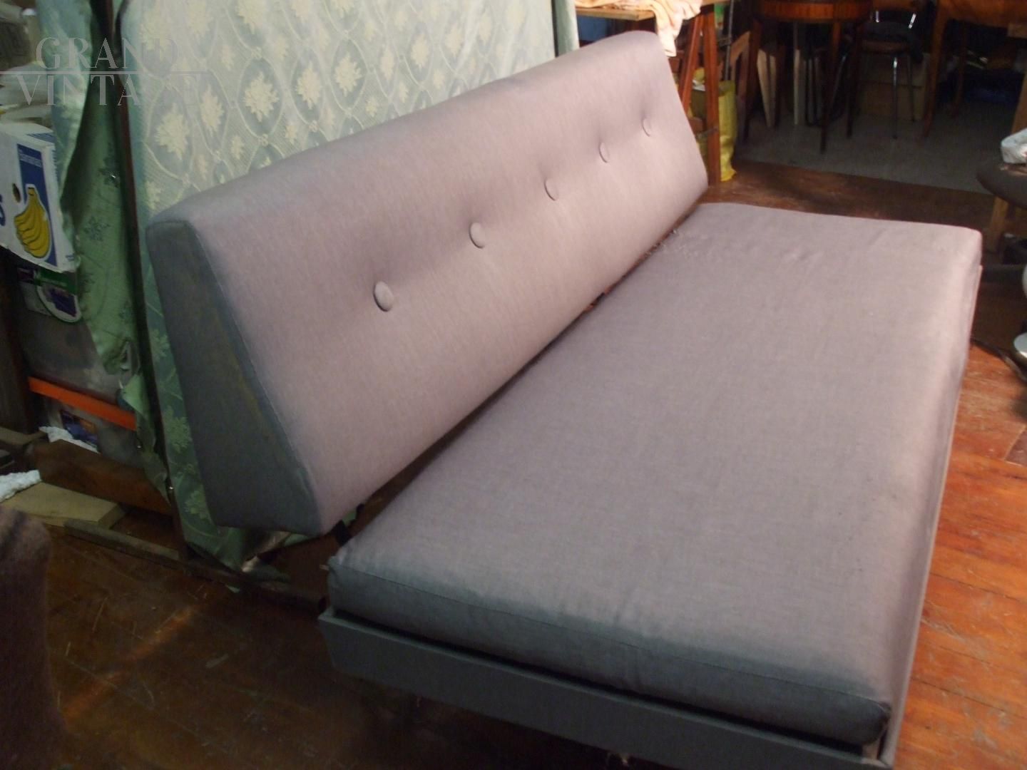 Divano letto - Divano trasformabile a letto o chaise longue, in tessuto grigio originale e materasso sfoderabile. Struttura in metallo, puntali anteriori in ottone.