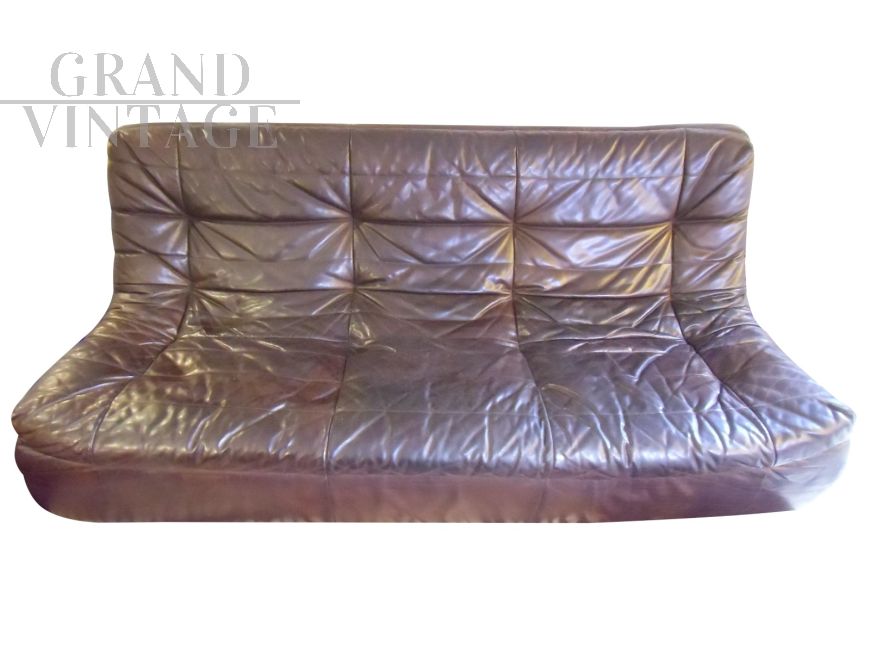 Bellissimo ed elegante divano del 1972 attribuito a Michel Ducaroy, in pelle color cioccolato.