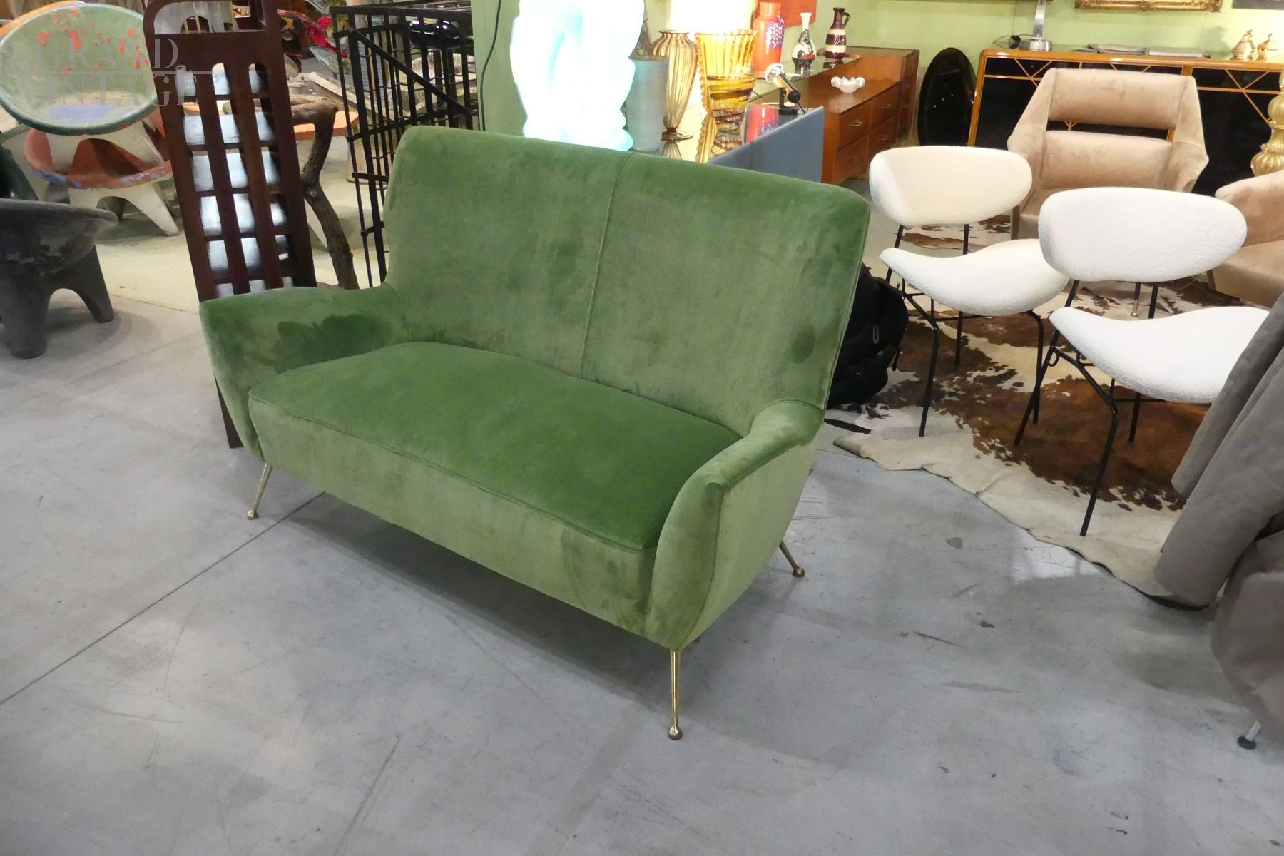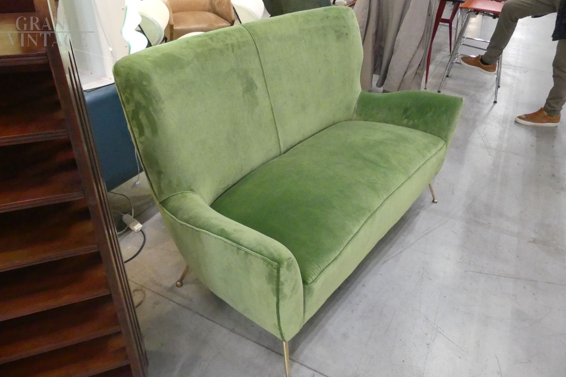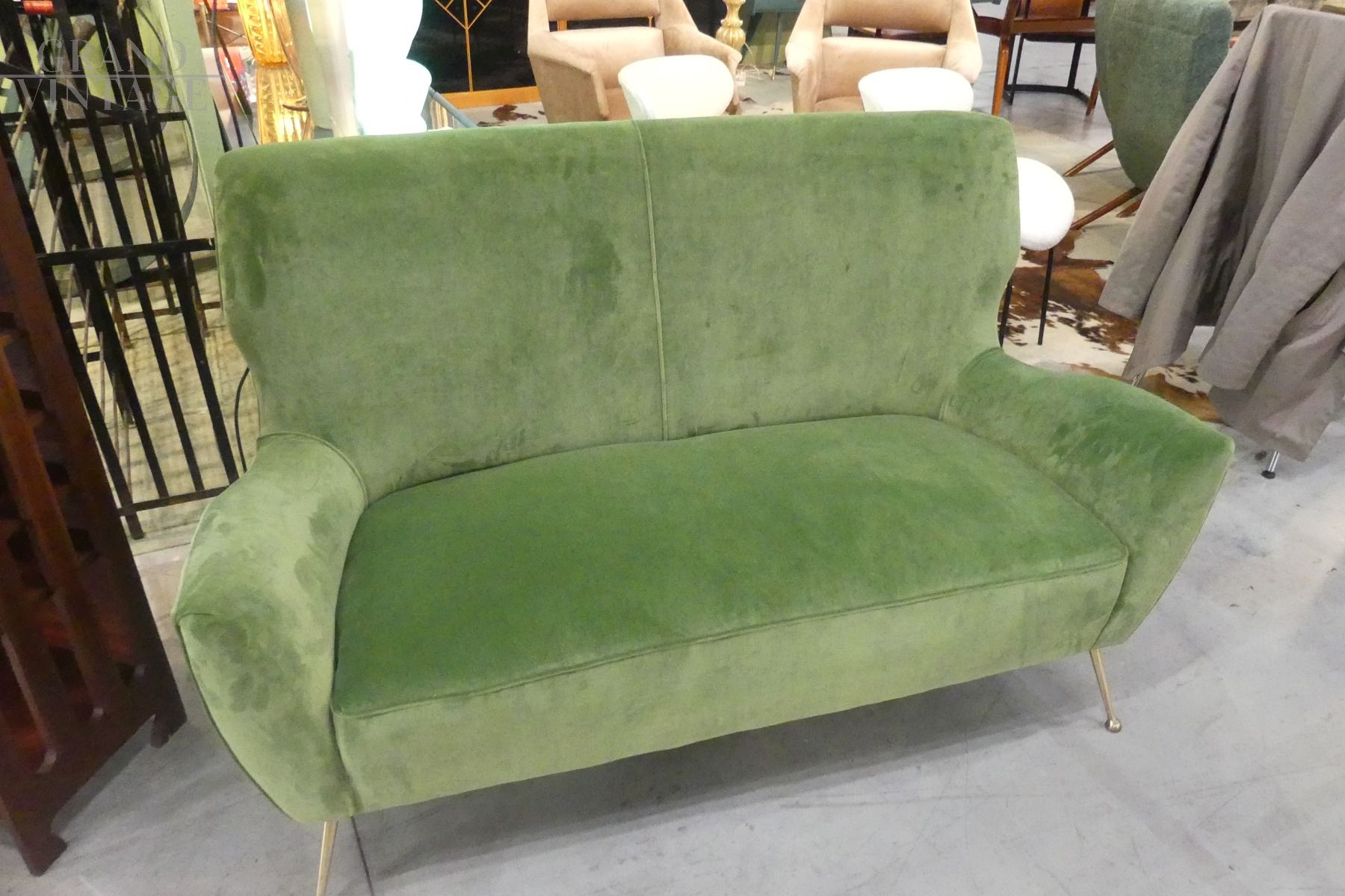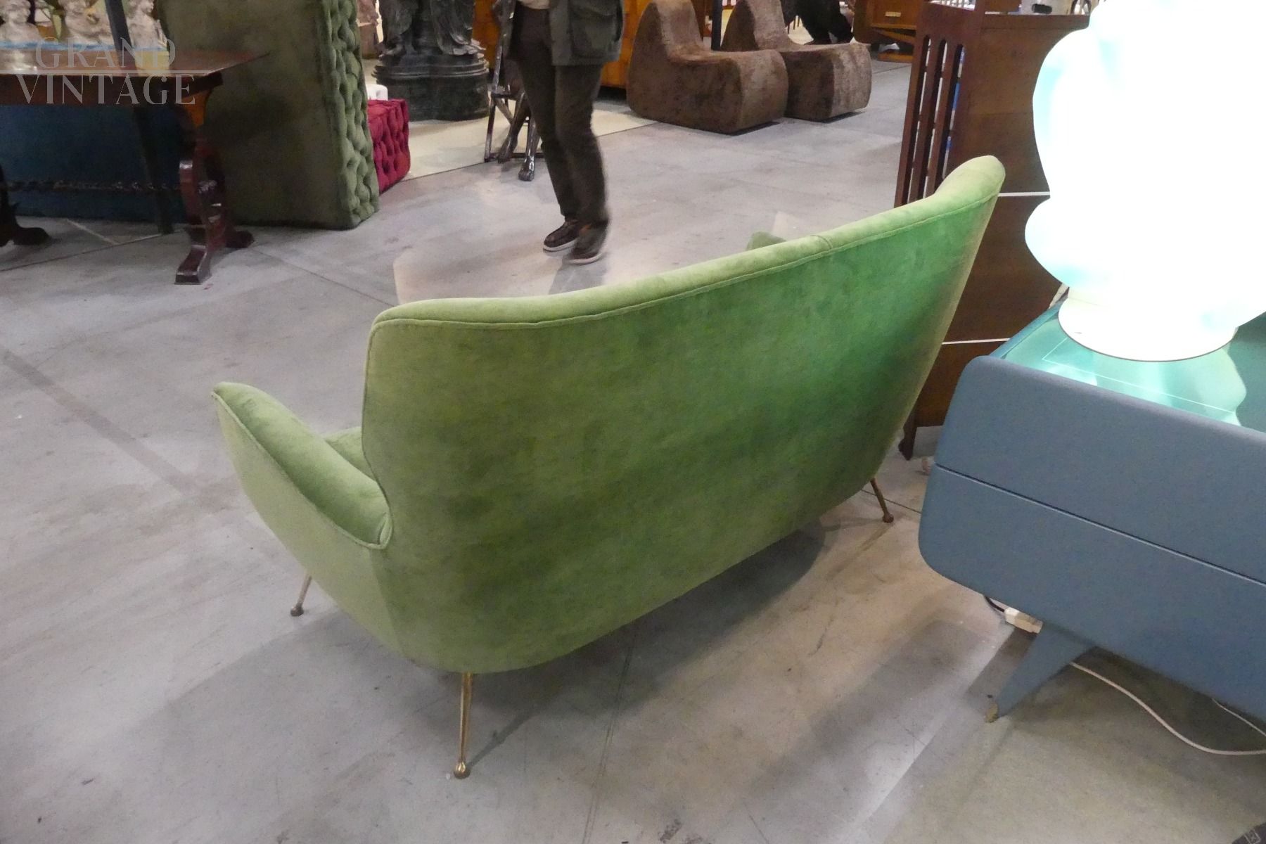 Divano classico di modernariato italiano in velluto verde salvia con piedi in ottone, in ottime condizioni, ritappezzato a nuovo.