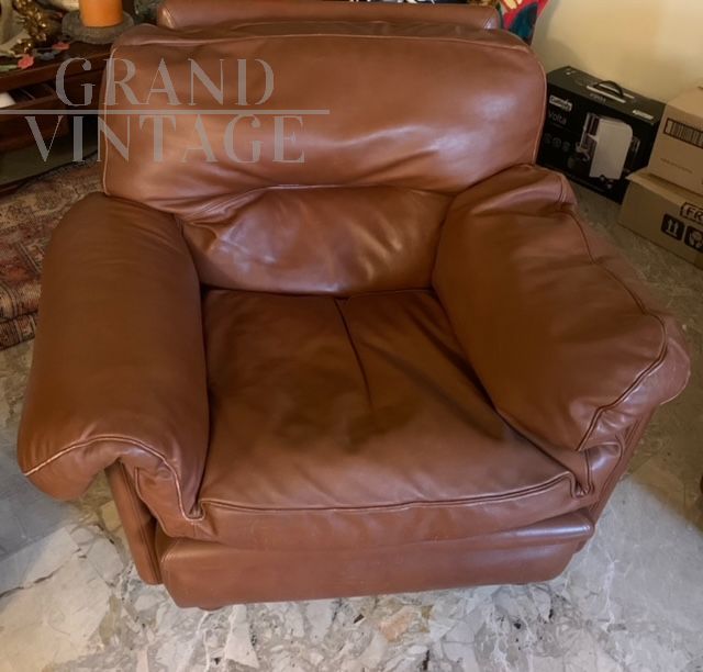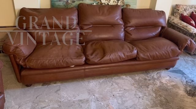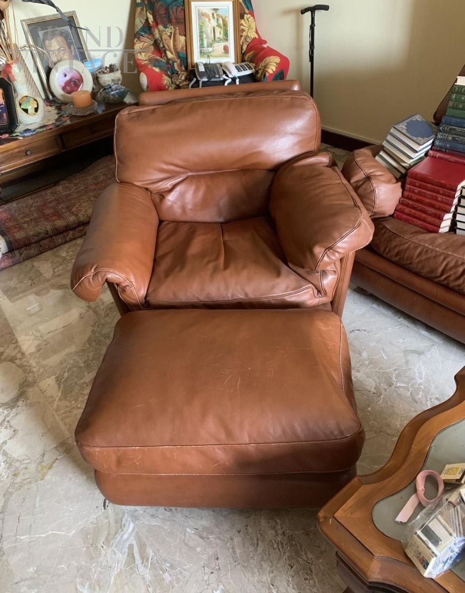 Set da salotto Poppy, design di Tito Agnoli per Poltrona Frau, composto da divano 3 posti, 2 poltrone e pouf in pelle marrone color cognac.