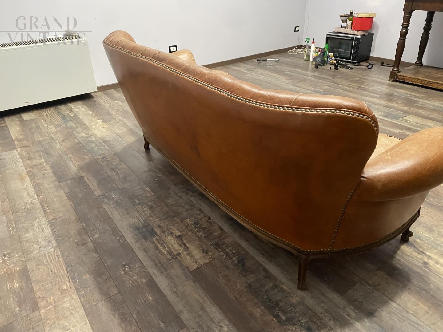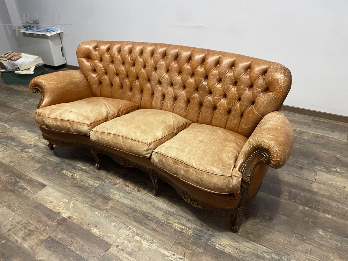 Divano vintage in pelle marrone con schienale capitonné, modernariato anni '50, proveniente da una casa italiana. È in buone condizioni pur presentando i segni del tempo. Ha una struttura in legno ed è in stile Chippendale.