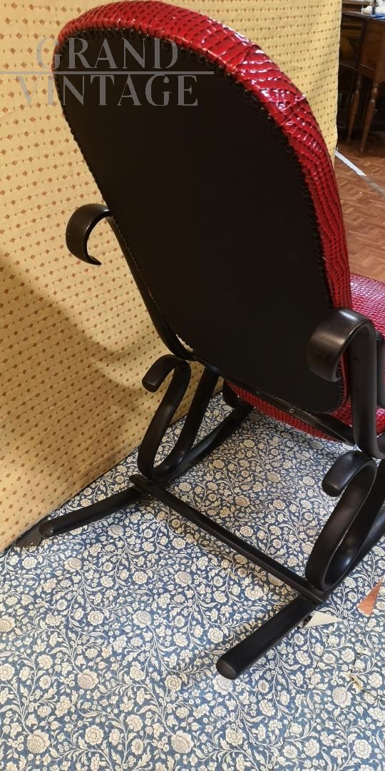 Dondolo thonet vintage anni '30 in faggio curvato a vapore ebanizzato, rivestito in pelle rossa.
