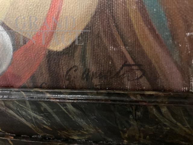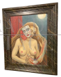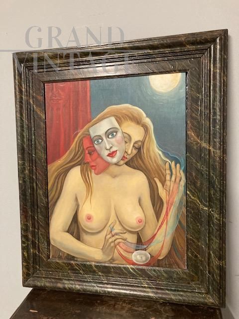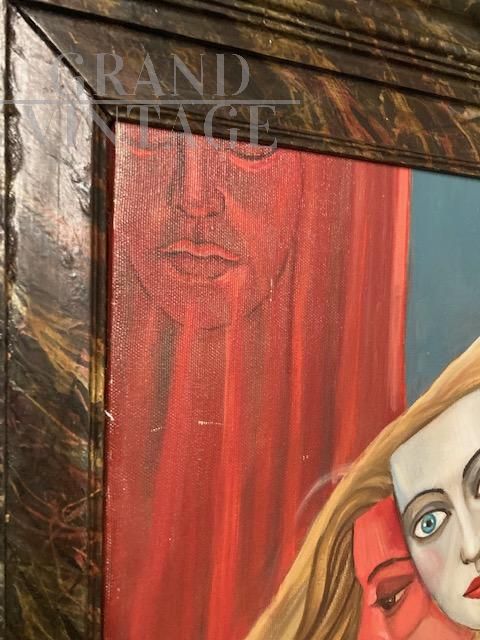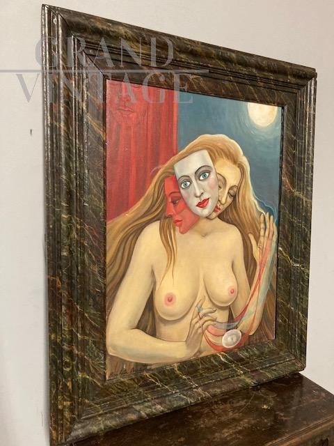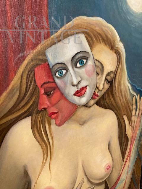 Dipinto surrealista contemporaneo di Conchita Amata raffigurante donna con maschere, olio su tela del XX secolo, con la sua cornice marmorizzata.