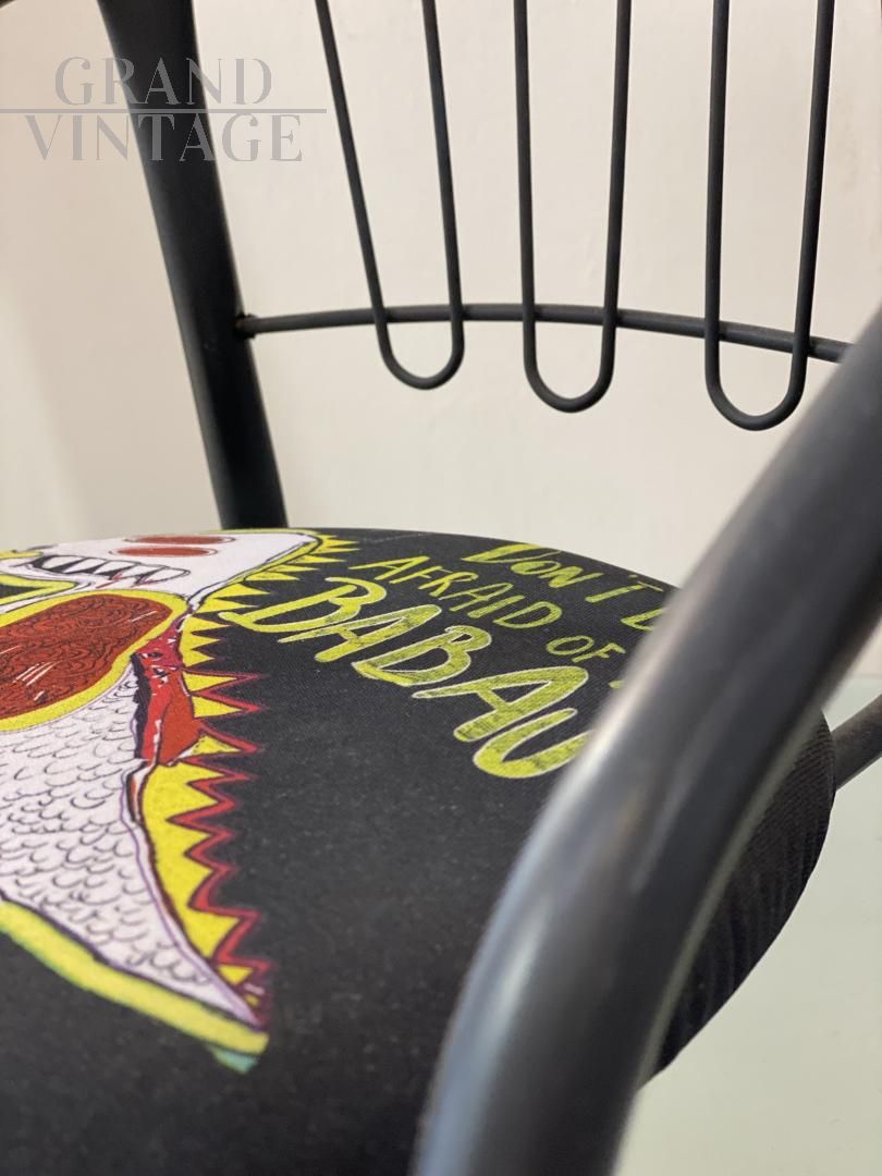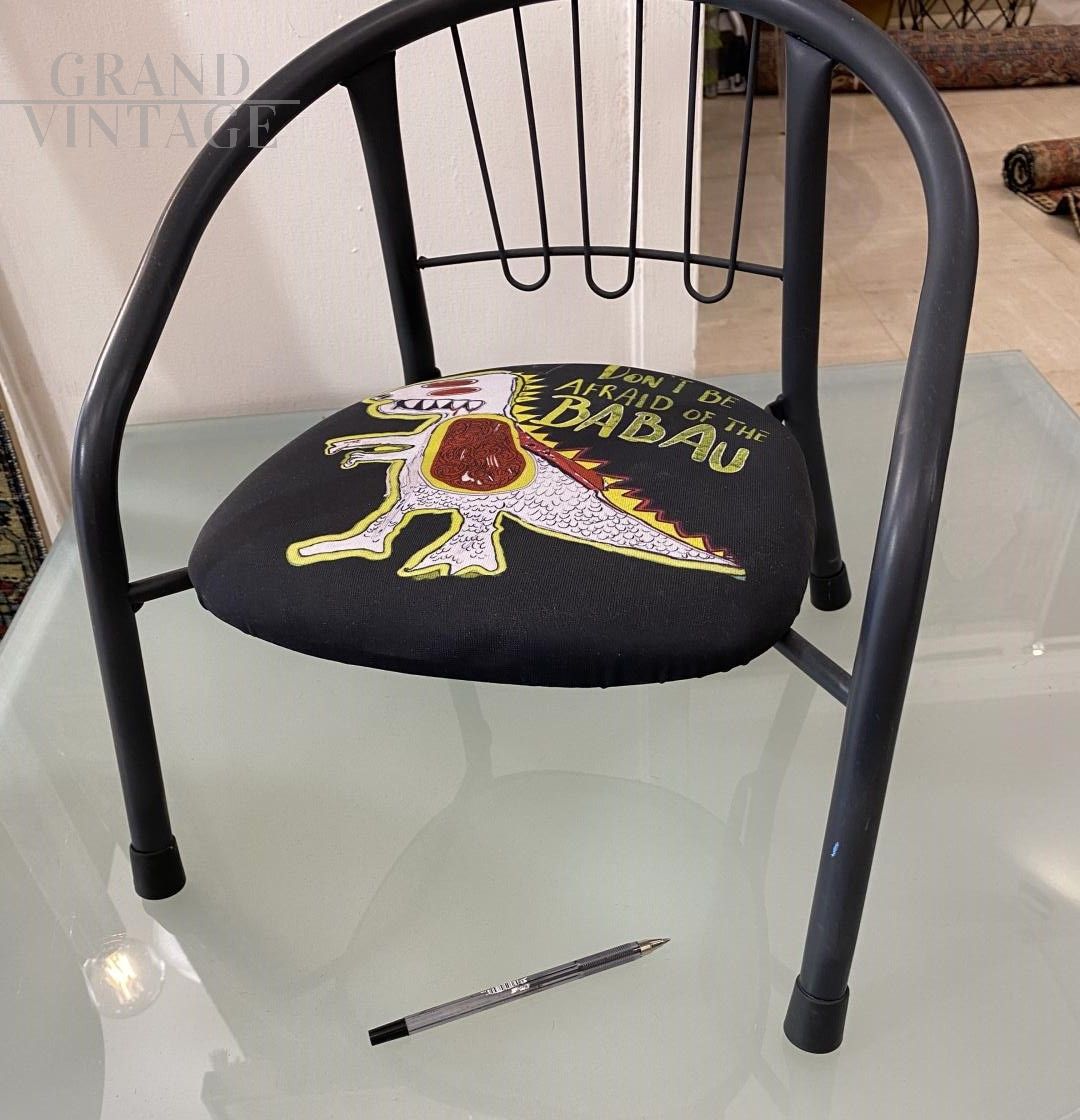 Piccola seduta per bambini rielaborata, con struttura in metallo e seduta in stoffa.