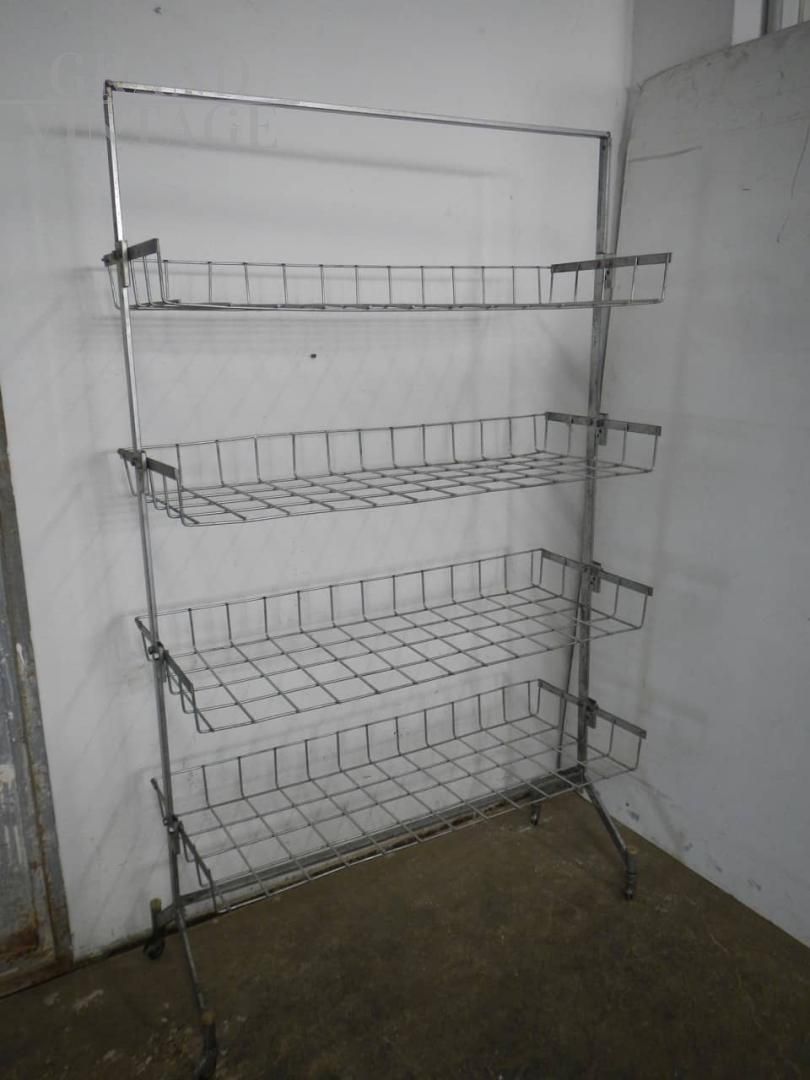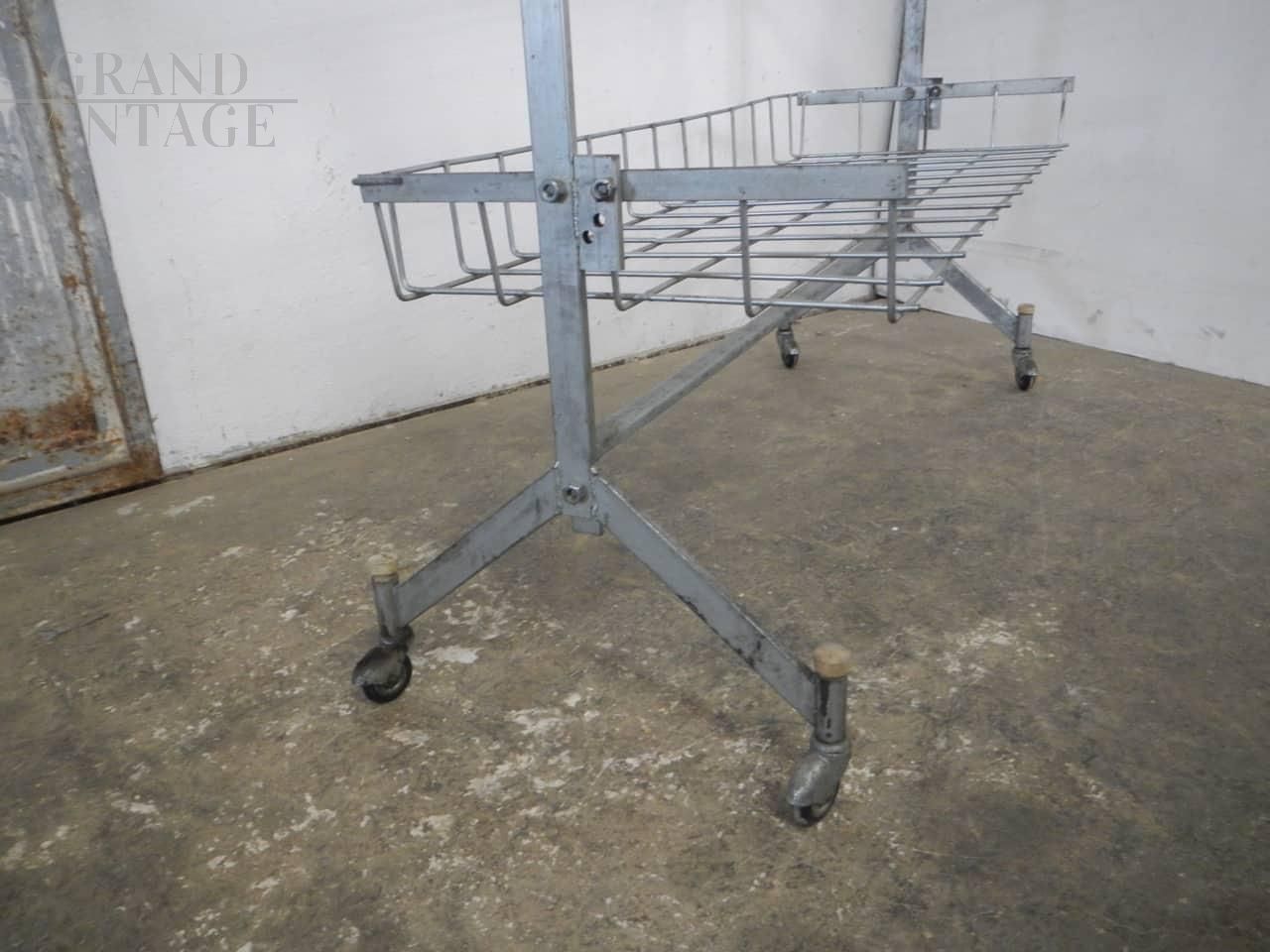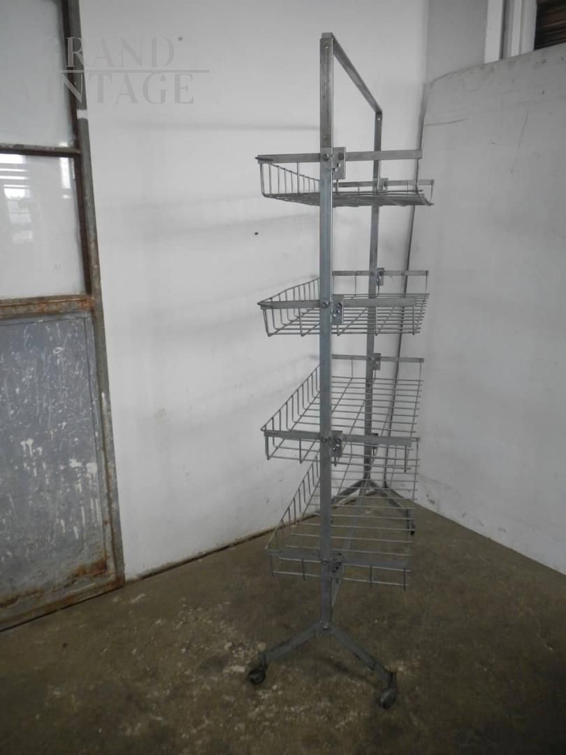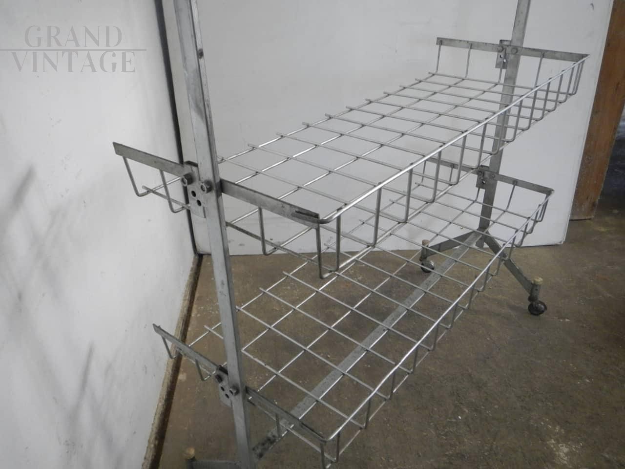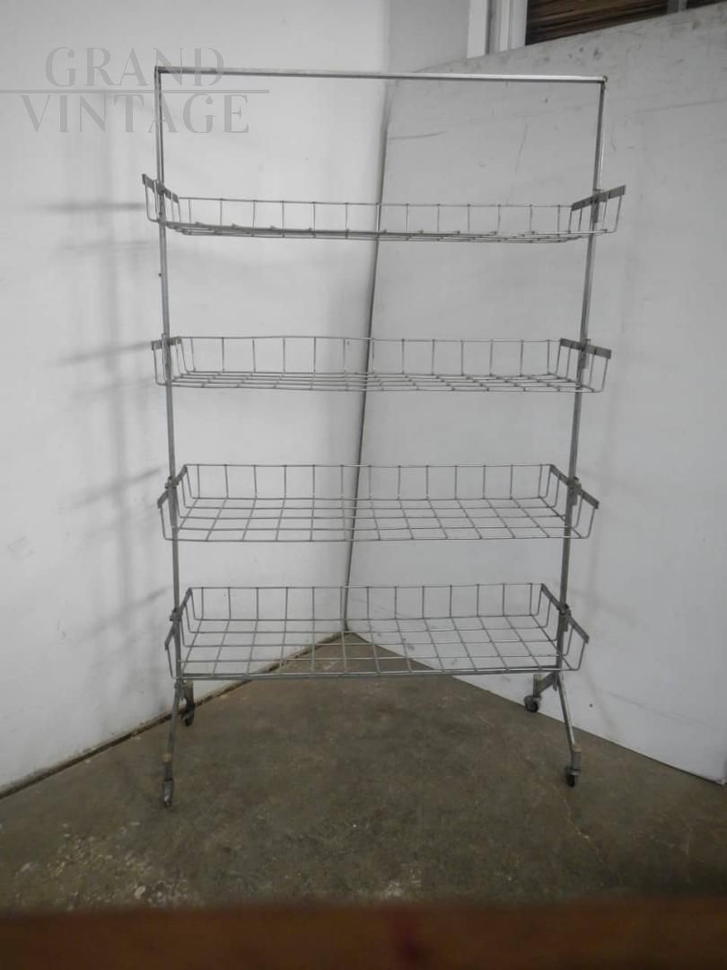 Carrello espositore da negozio in ferro laccato grigio con 4 ripiani in rete di ferro con misure 40 x 101 cm, 10 cm in altezza. In buone condizioni, con segni d’uso. Dotato di ruote.