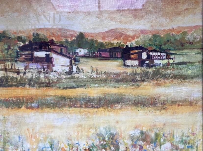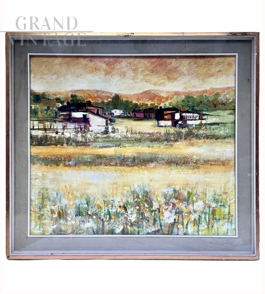 Dipinto di Giorgio Chiarini Boddi raffigurante un paesaggio estivo con case di campagna intitolato Estate, olio su tela degli anni '60. Misure 94 x 86 cm.