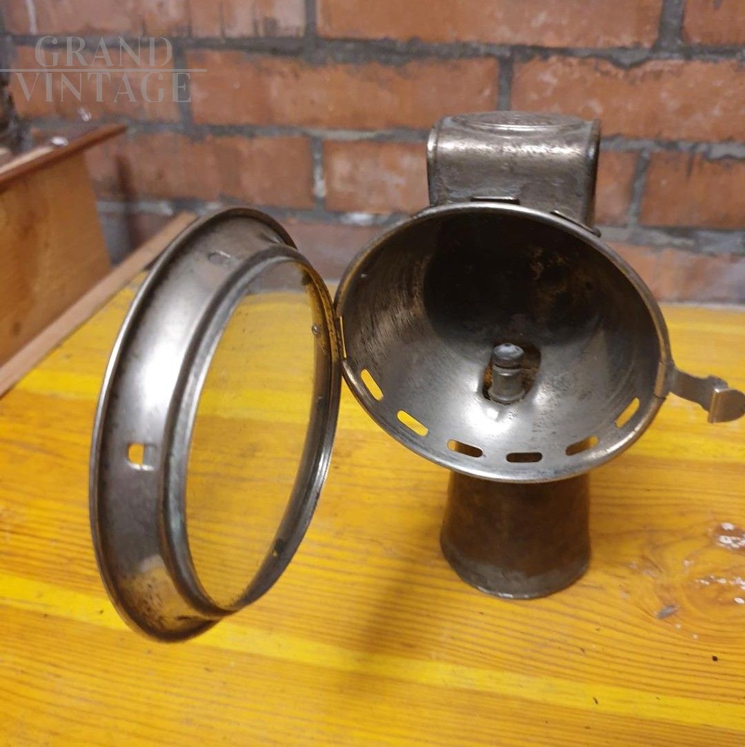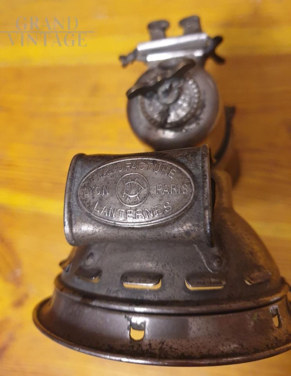 Fanale a carburo da motocicletta, prodotto da Manufactures Lanternes di Lione e Parigi, Francia, periodo primi '900. Il proiettore anteriore è coperto da un vetro montato su uno sportello che si apre per facilitare l'accensione.