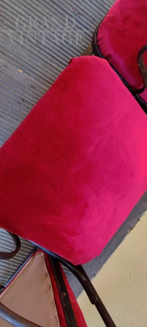 Queste poltroncine sono originali anni '30, provenienti da un teatro italiano, he hanno una struttura in metallo e seduta e schienale imbottiti in velluto rosso a nuovo.