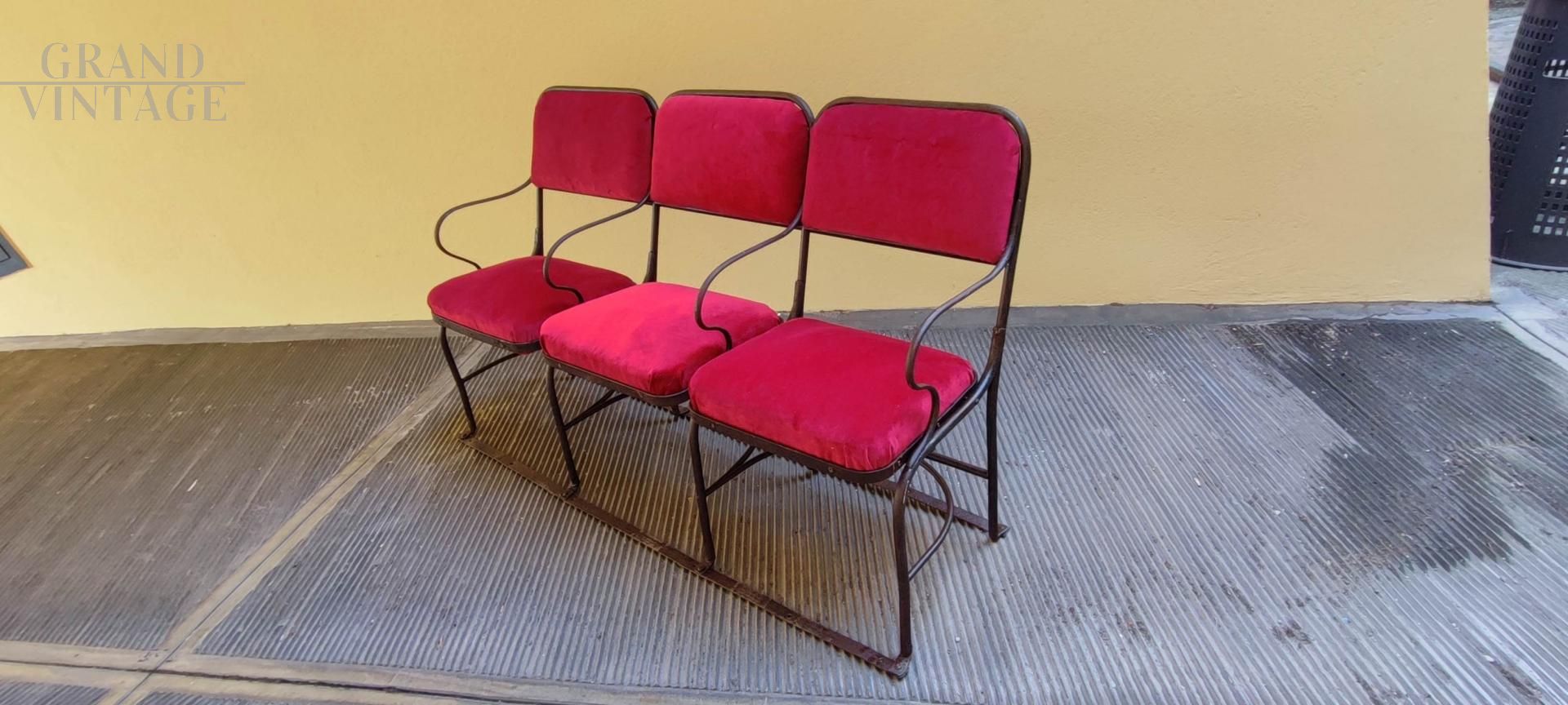 Fila di 3 sedie da teatro italiane in velluto rosso anni '30