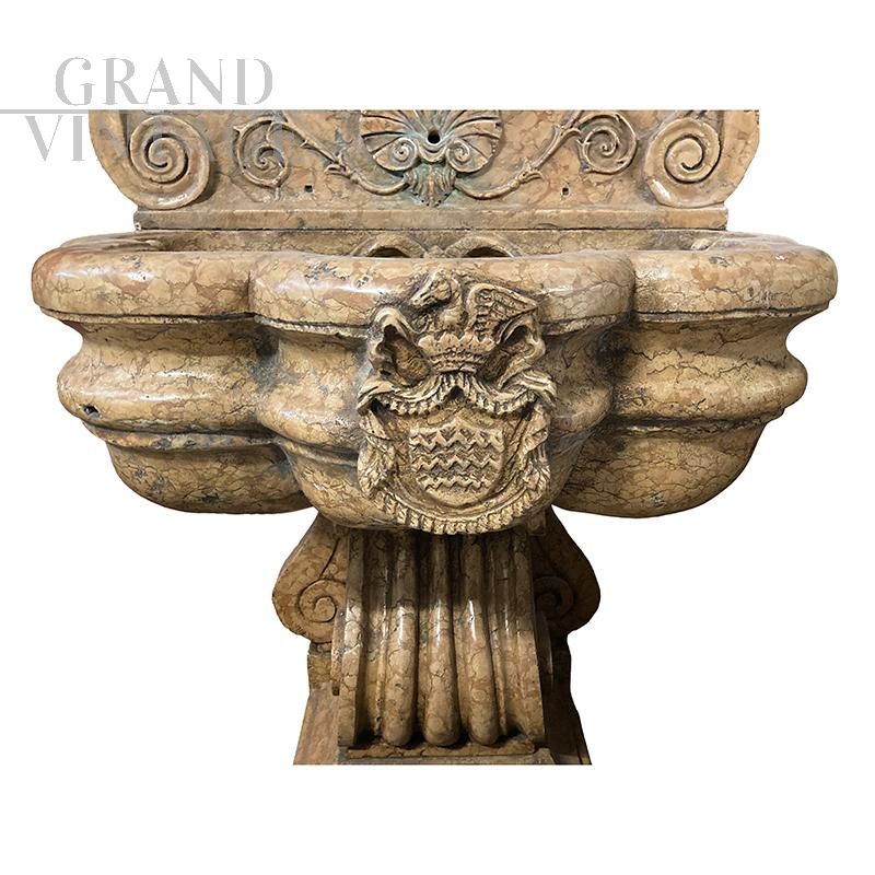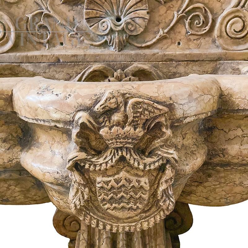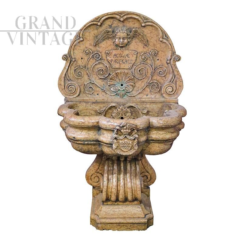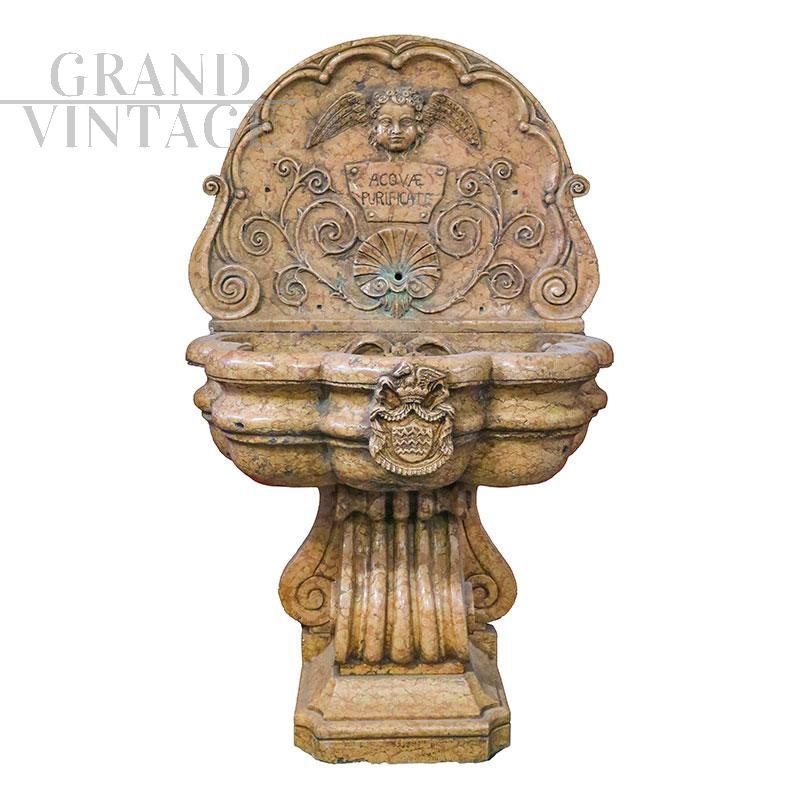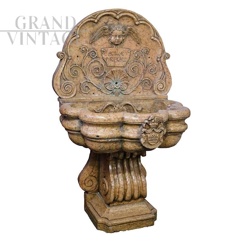 Fontana a muro in marmo rosso di Verona, composta da tre moduli: piedistallo bacellato, vasca con stemma e frontale con putto, motivi vegetali e scritta latina “ACQUAE PURIFICATE”. Questa fontana a muro è ideale per arredare giardini e cortili con un vezzo elegante e ricercato.