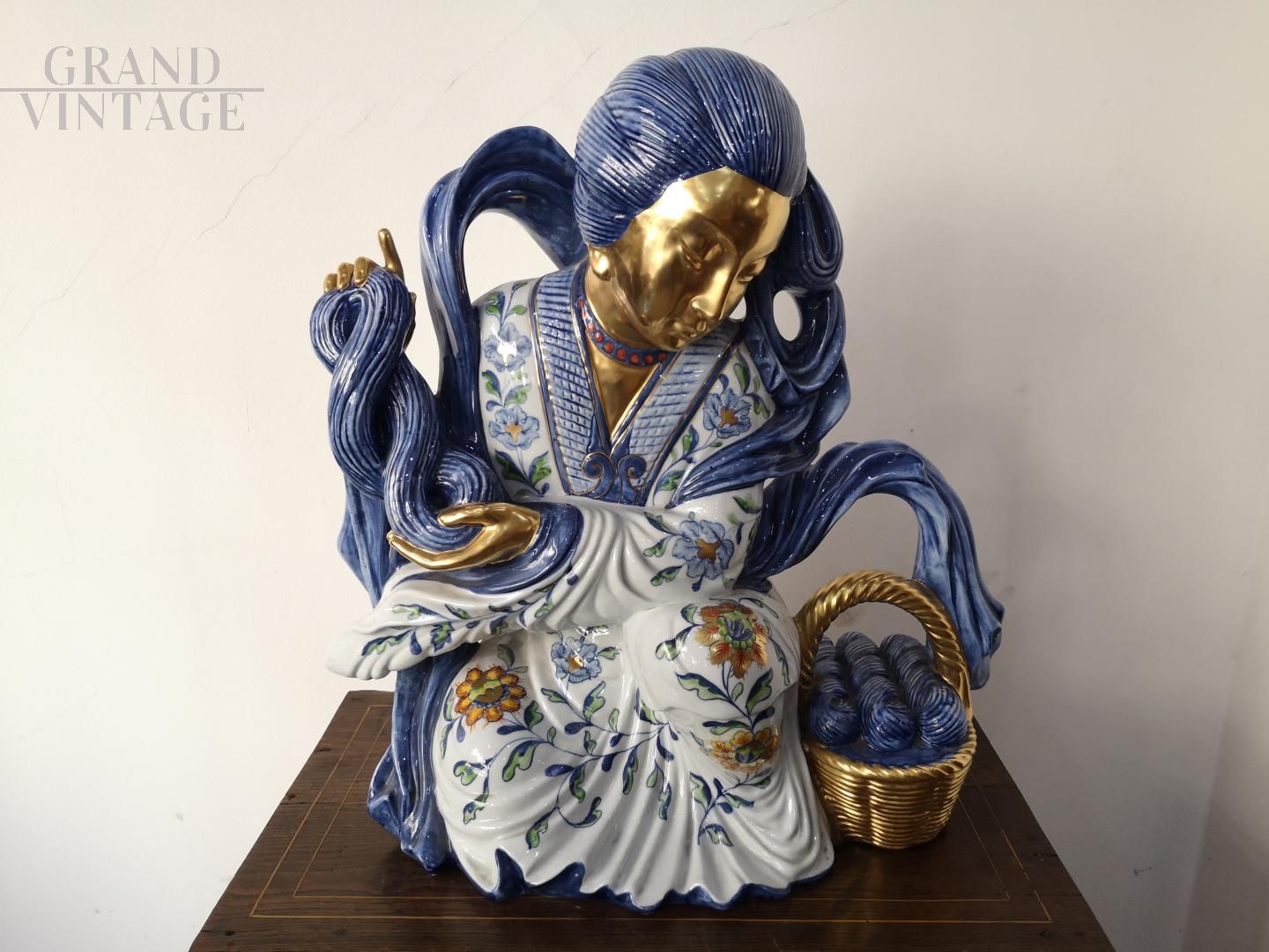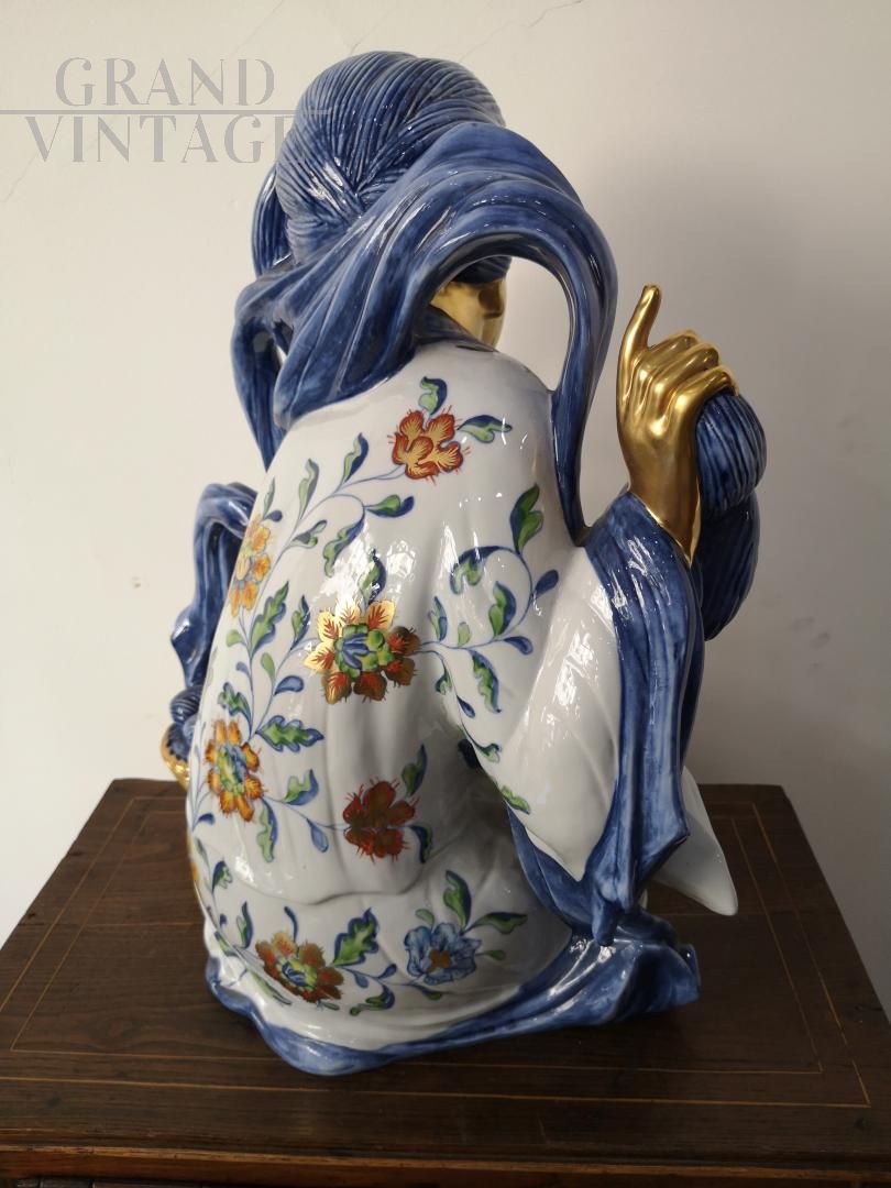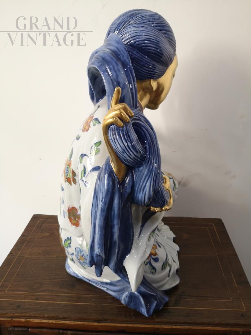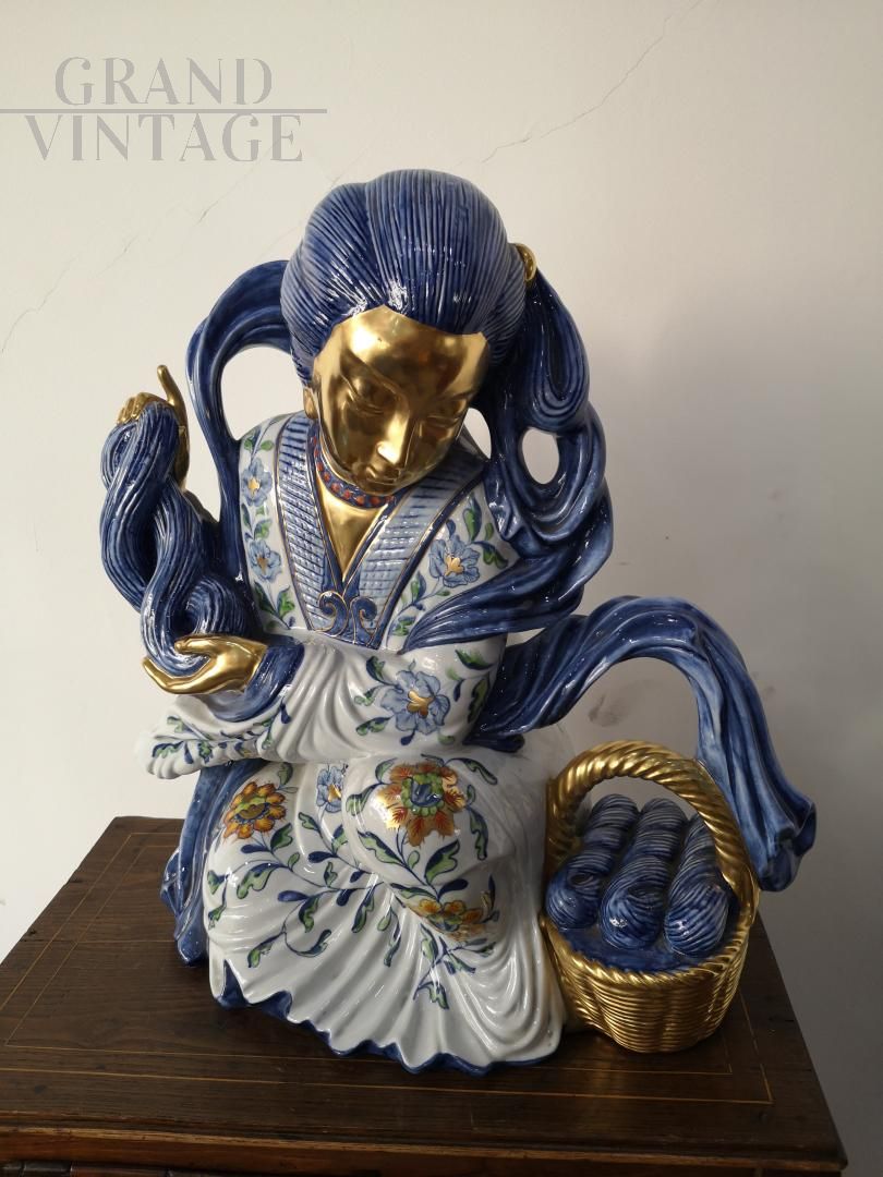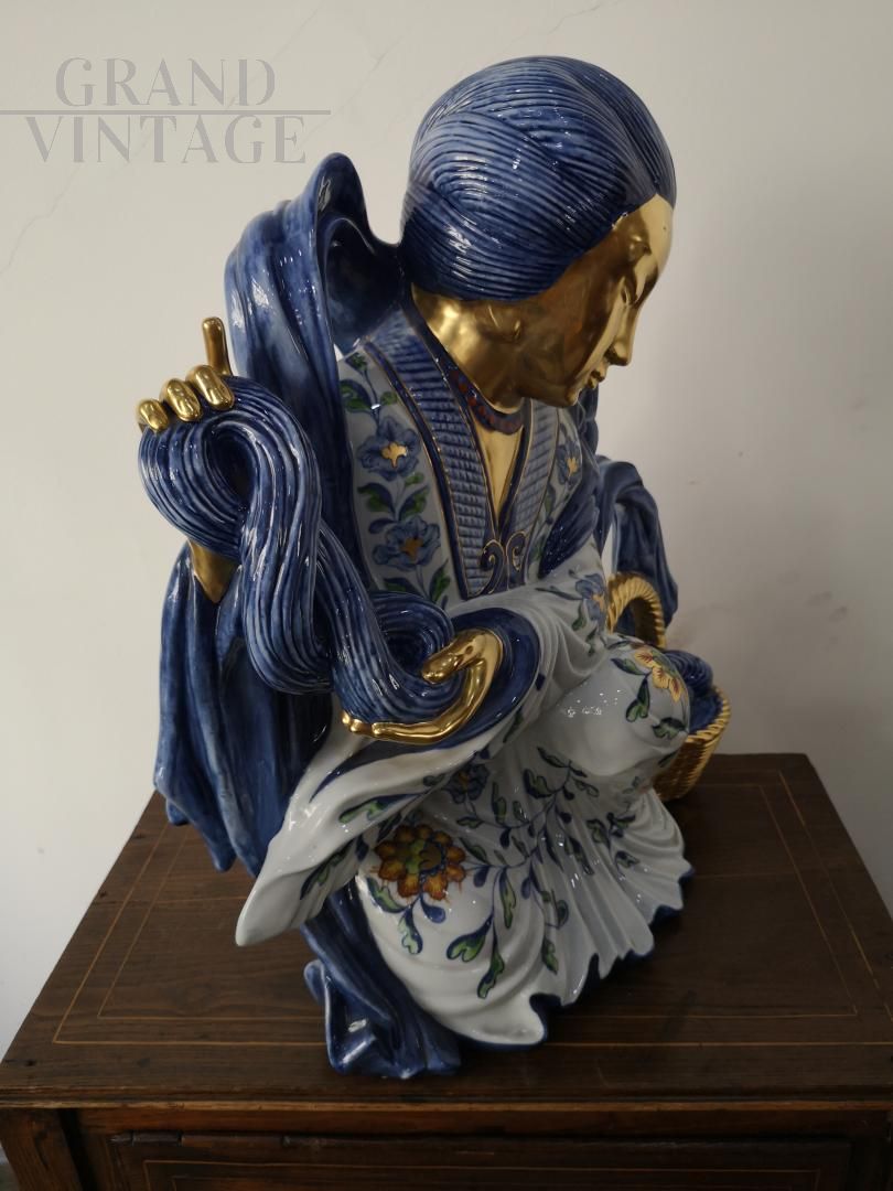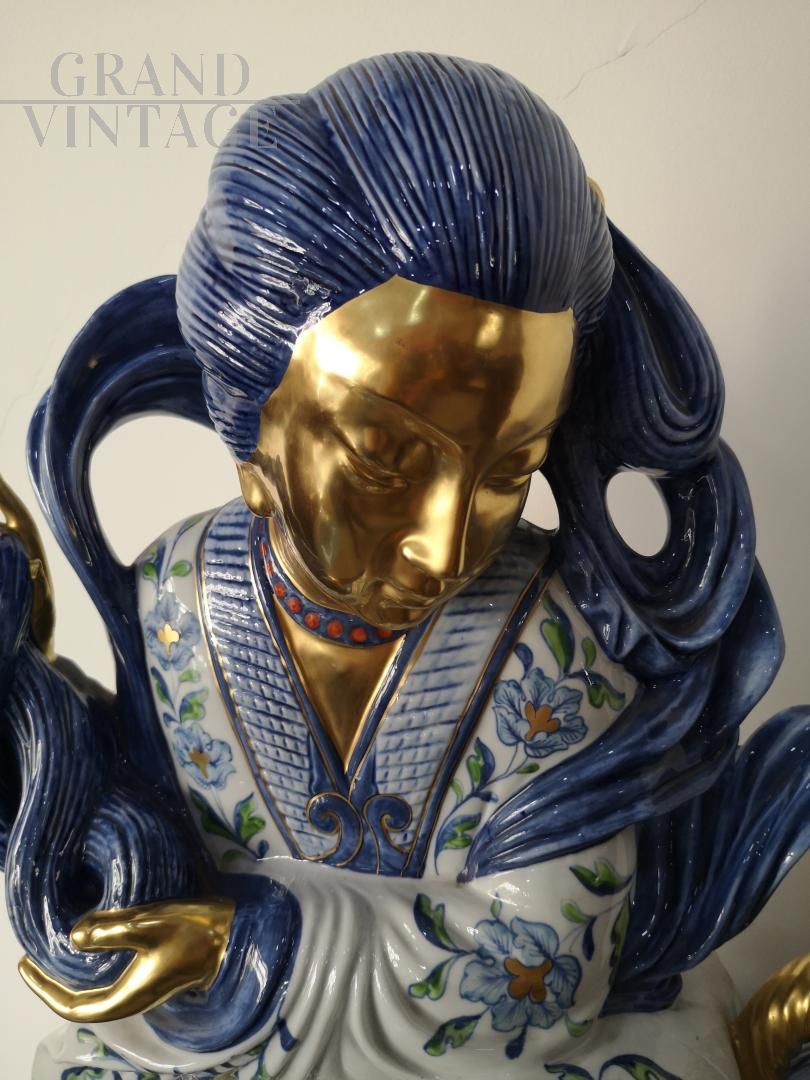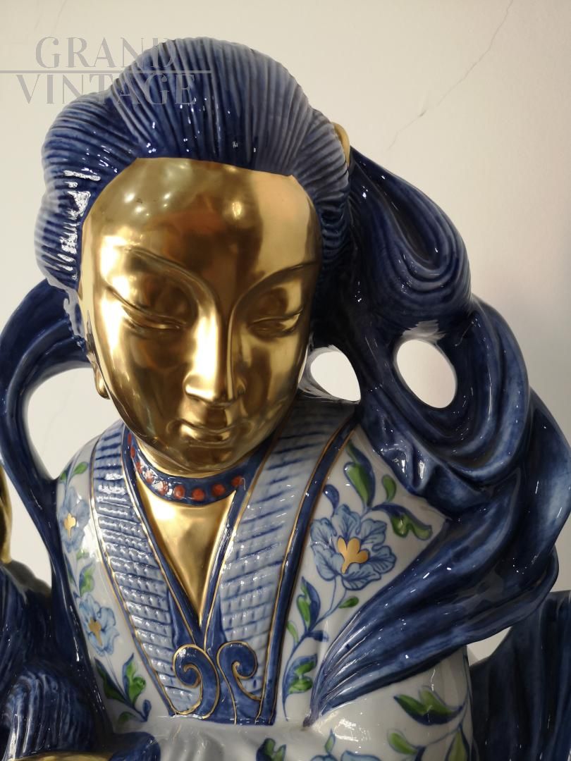 Bellissima scultura di porcellana anni '50 che rappresenta una Geisha, una realizzazione della Manifattura Artistica Le Porcellane di Firenze, dipinta a mano con decori in oro zecchino. La scultura è imponente, del peso di circa 10 kg, ed è un oggetto di arredo di grande fascino ed effetto.