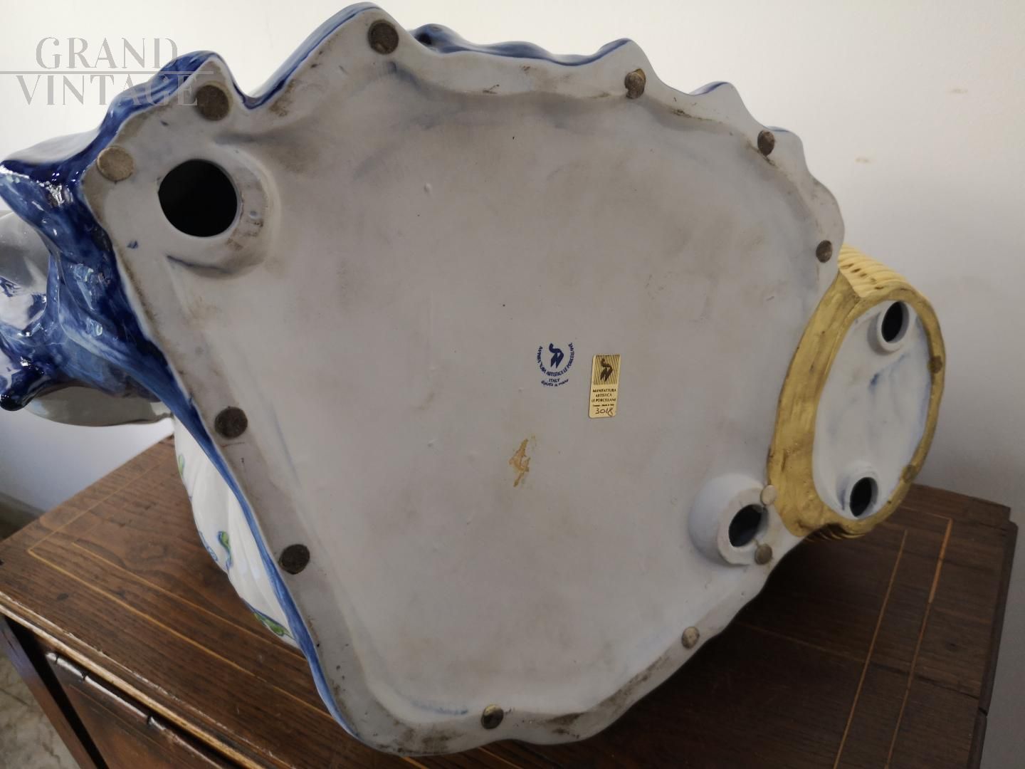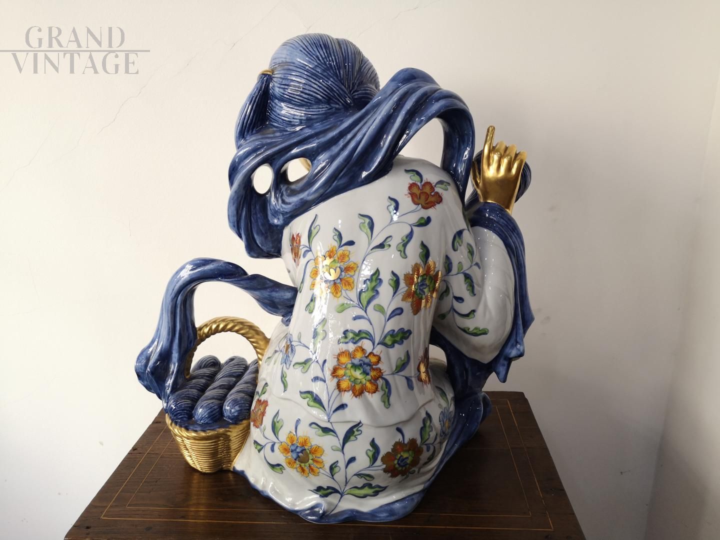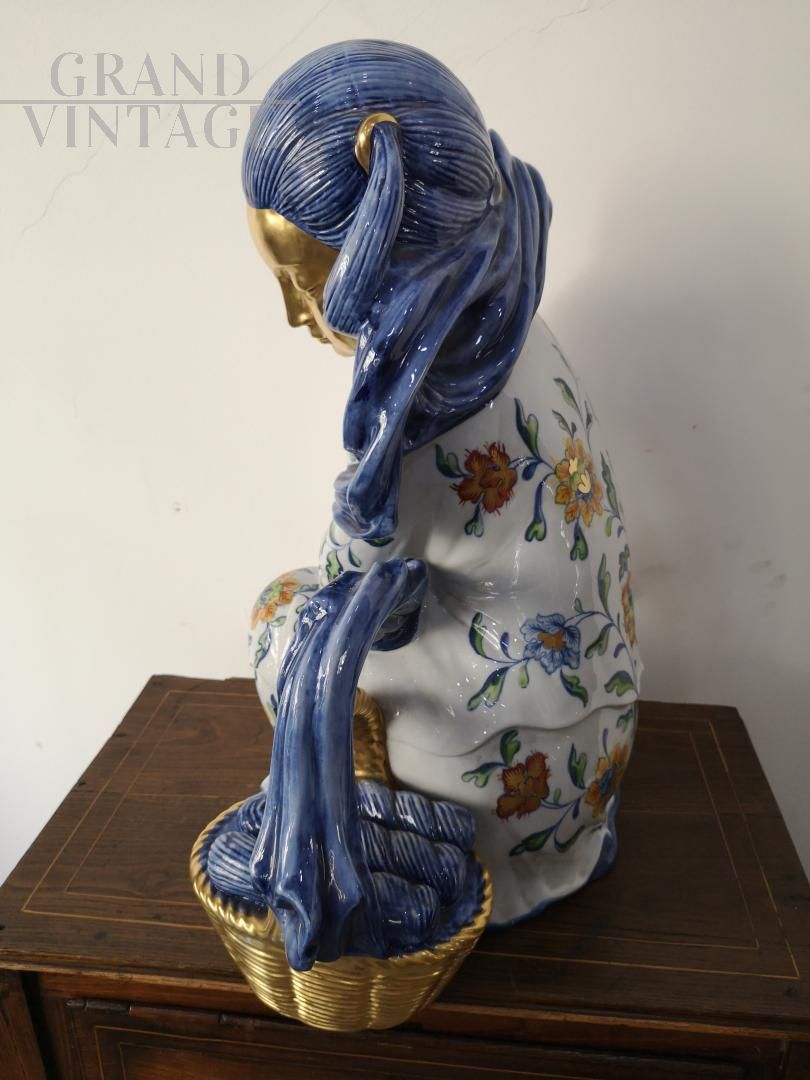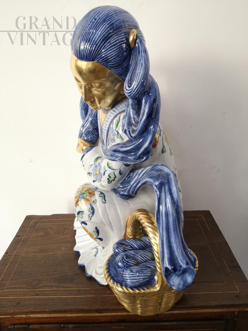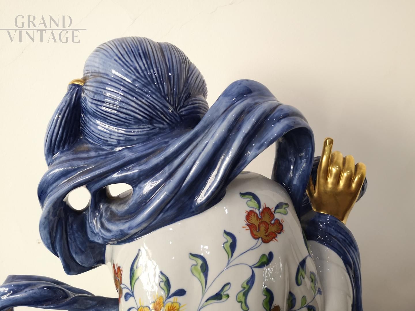 Bellissima scultura di porcellana anni '50 che rappresenta una Geisha, una realizzazione della Manifattura Artistica Le Porcellane di Firenze, dipinta a mano con decori in oro zecchino. La scultura è imponente, del peso di circa 10 kg, ed è un oggetto di arredo di grande fascino ed effetto.