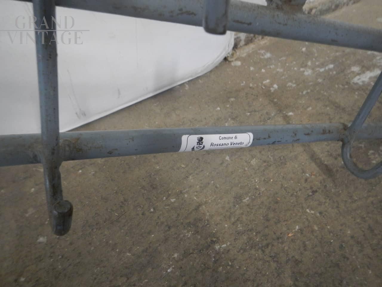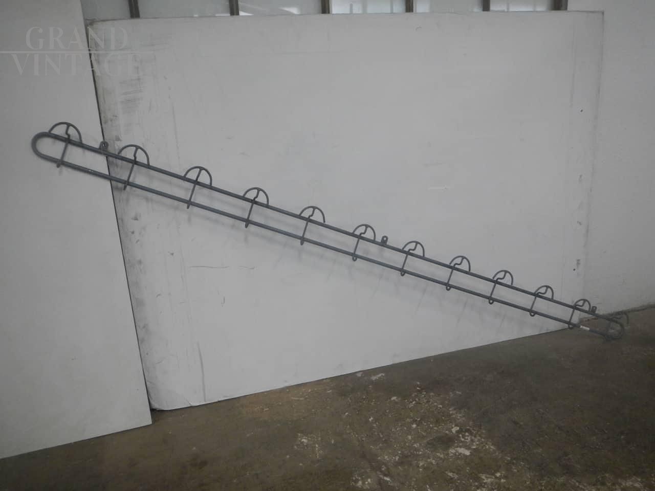 Grande attaccapanni vintage da parete a 12 posti in ferro colorato grigio, in buone condizioni, con i naturali segni dell'uso. Disponibili 2 pezzi, il prezzo si riferisce al singolo pezzo.