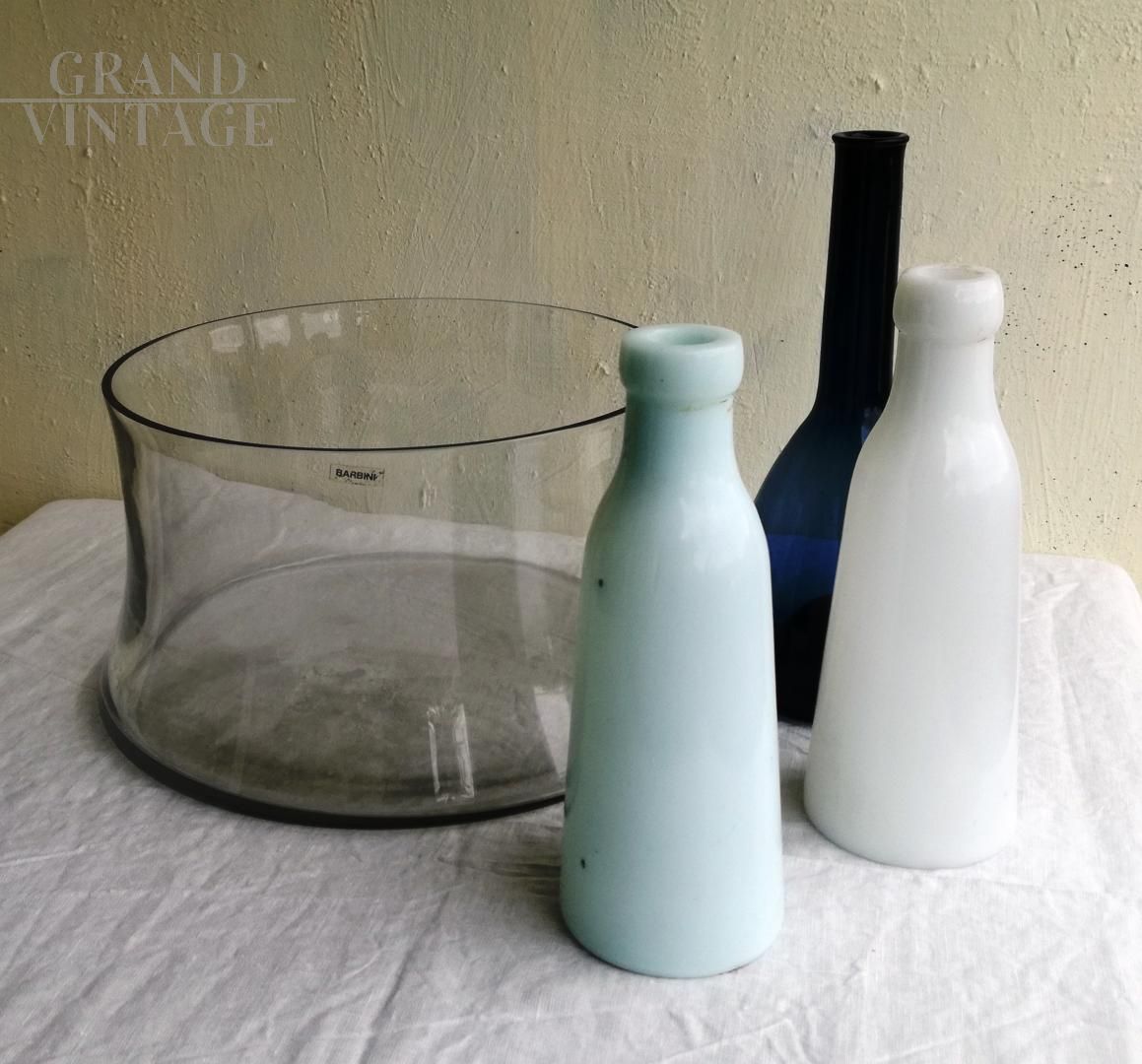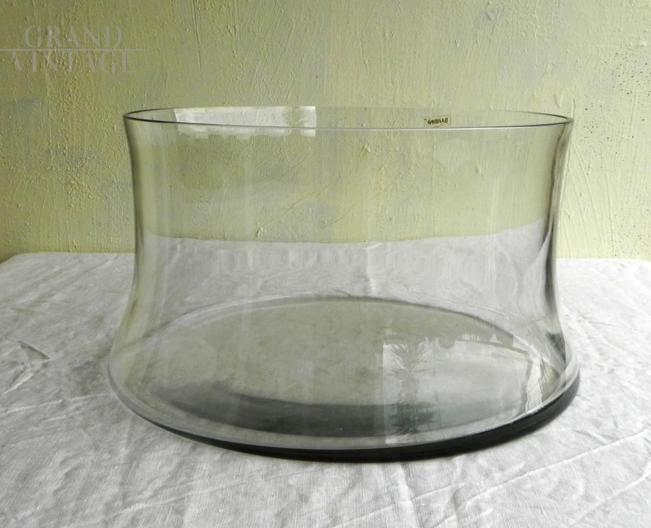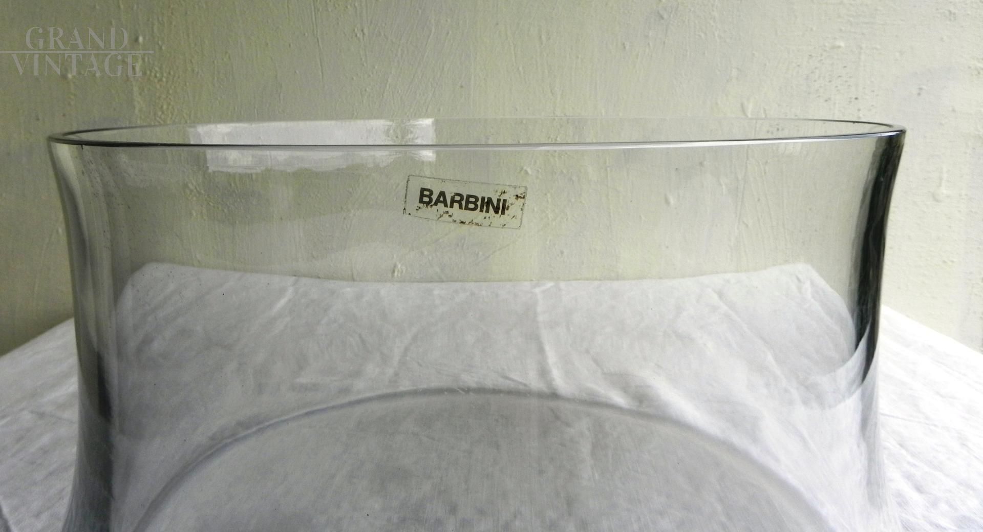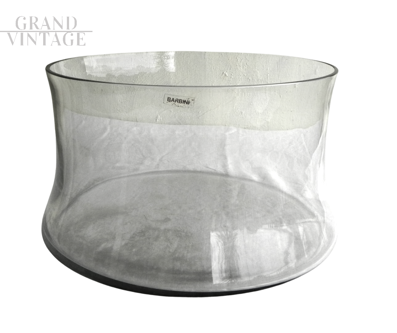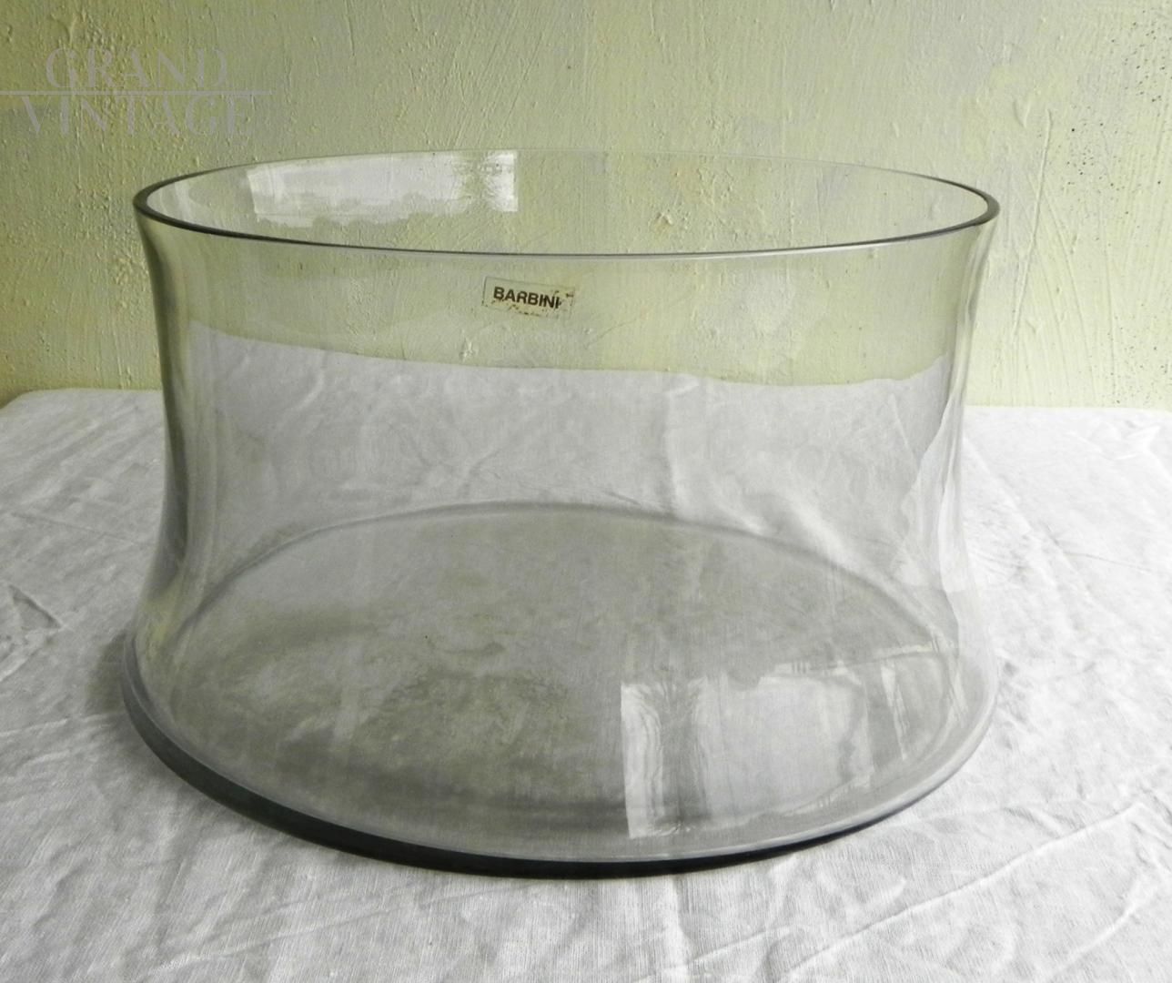 Grande ciotola centrotavola design Barbini in vetro di Murano degli anni '70, di grosso diametro e realizzata in vetro pesante, sagomata nella forma e assottigliata sui fianchi, con adesivo originale del marchio. Produzione Barbini, Murano, Venezia.