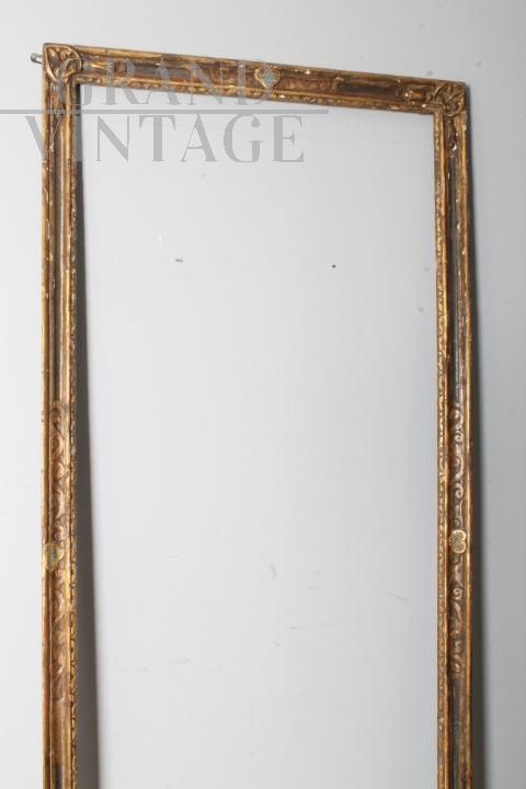 Antica splendida e grande cornice del XVIII secolo, realizzata nel 1750 circa in legno dorato e dipinto con intagli, misure esterne: 215 x 98 cm. Misure interne utili luce: 205 x 86,5 cm.