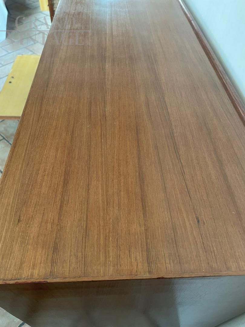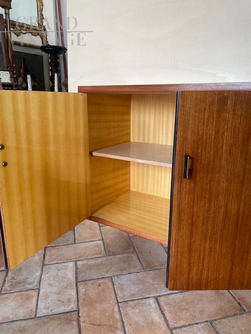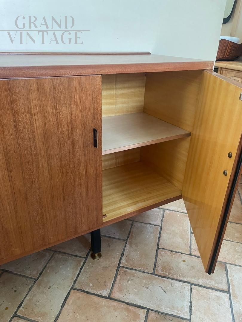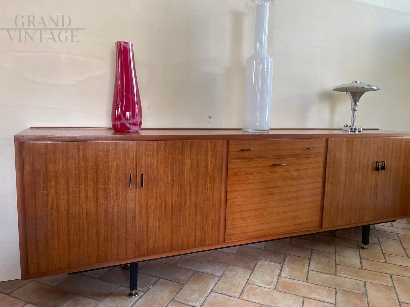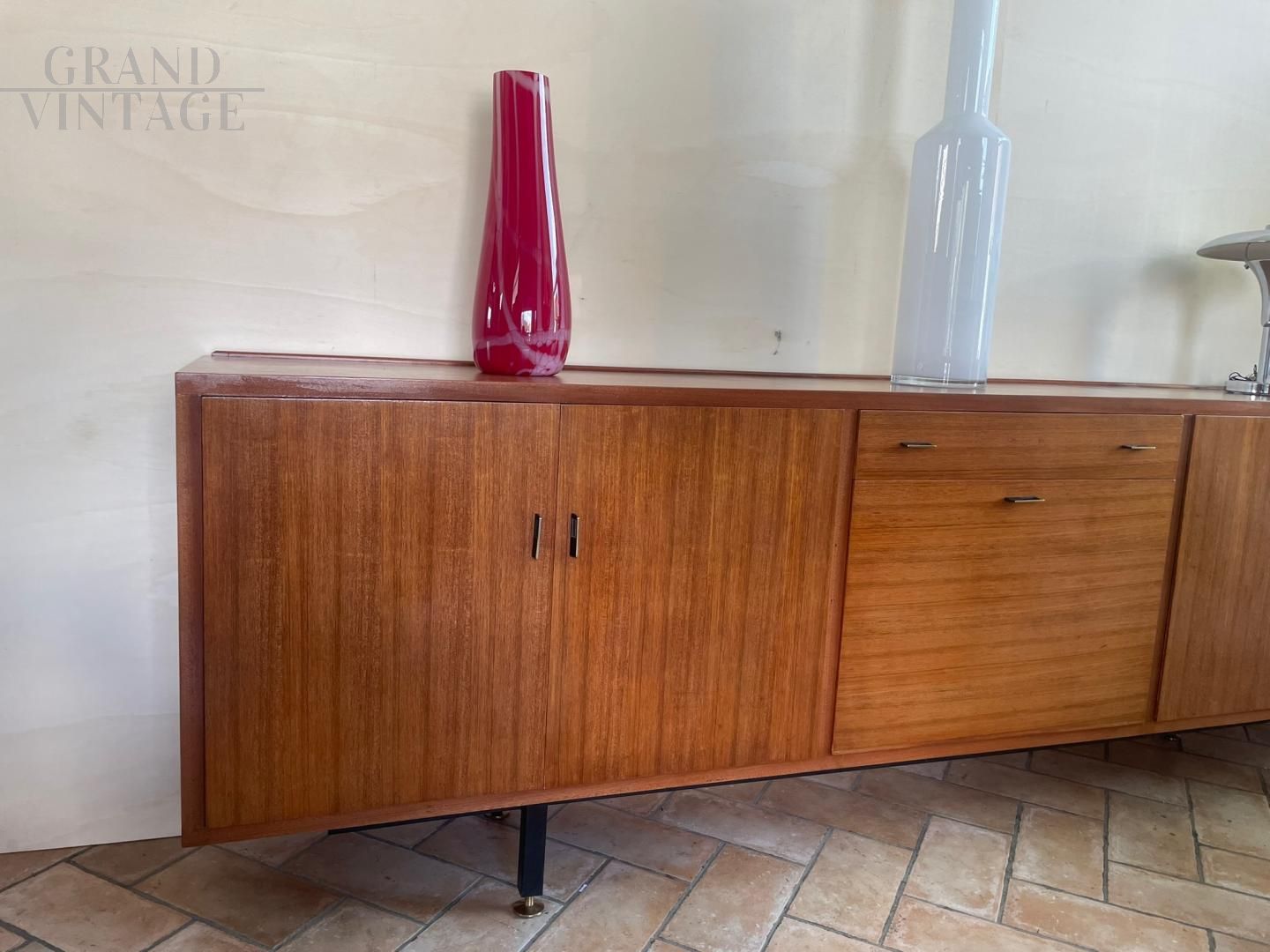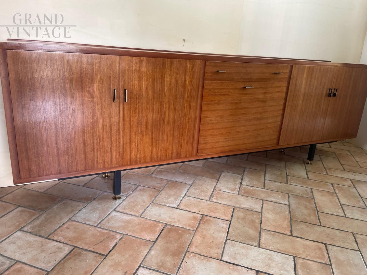 Grande credenza bassa sideboard anni '60 in mogano naturale con maniglie originali, composto da quattro ante, un vano a ribalta e un cassetto, le gambe sono in metallo nero opaco e terminano con quattro piedi regolabili in ottone. In ottime condizioni, il mobile è stato rilucidato.