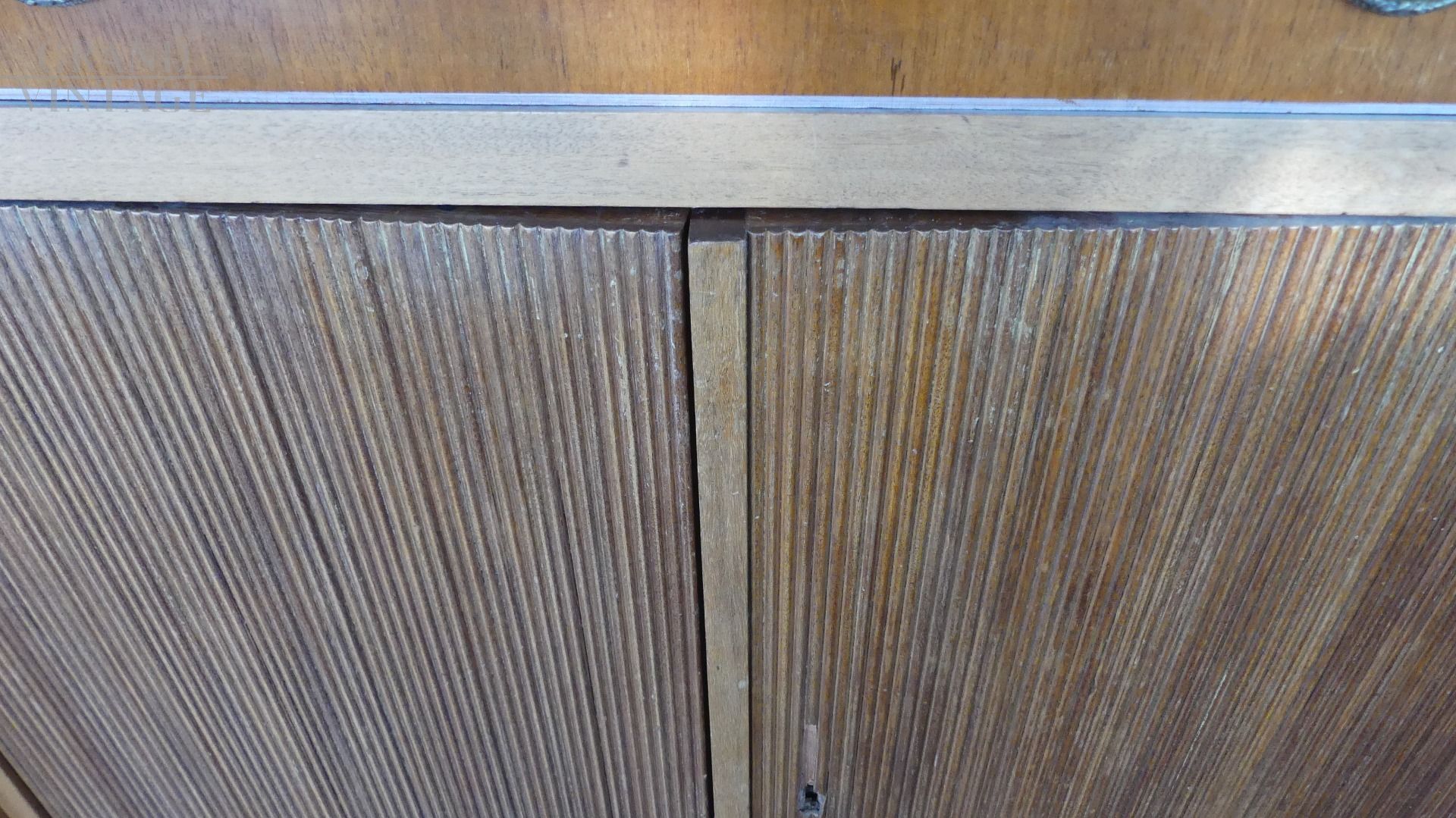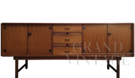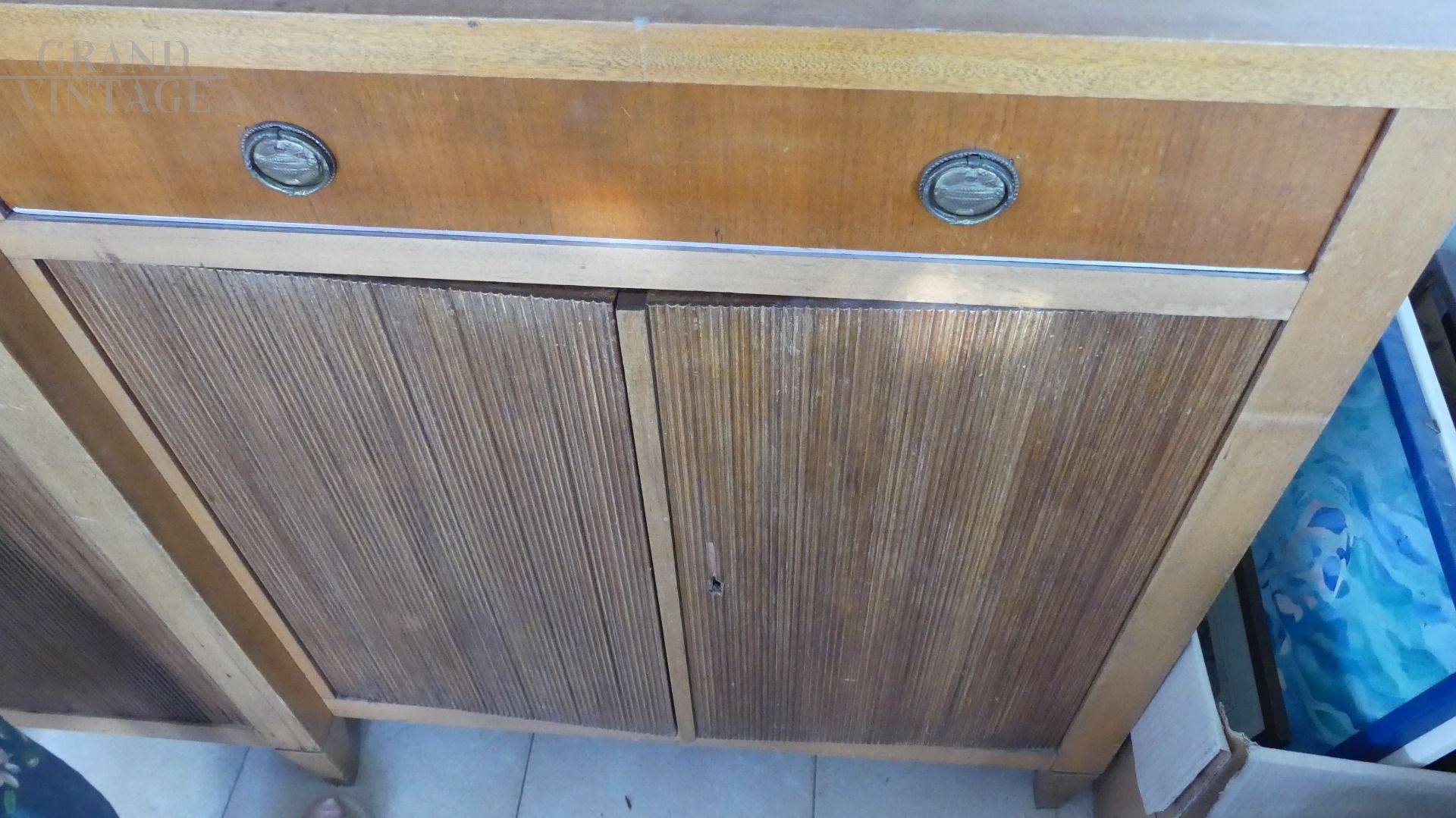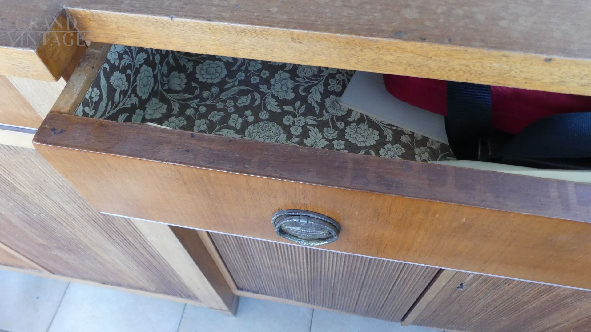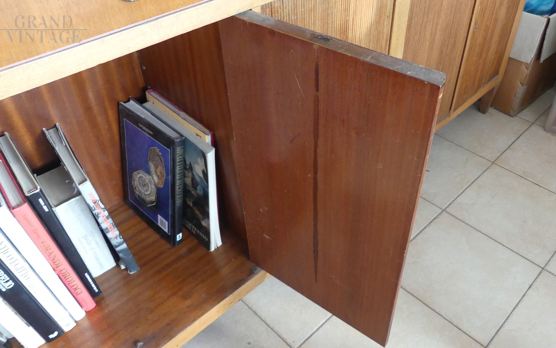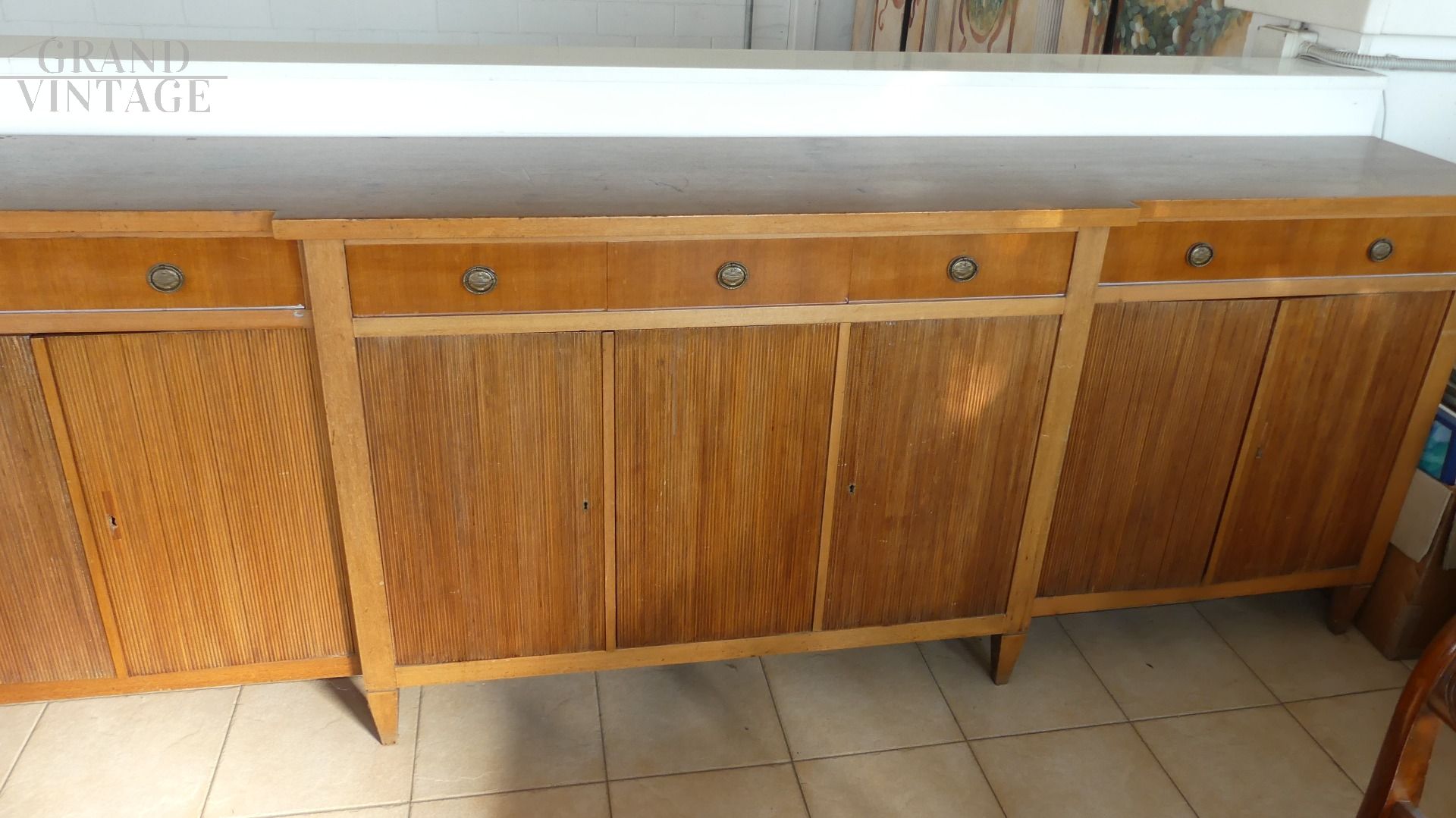 Credenza vintage di grandi dimensioni, modernariato italiano anni '60, in legno di mogano, composta da 7 ante decorate da una bellissima zigrinatura. In condizioni originali, presenta i naturali segni del tempo, con qualche macchia sul piano, come da foto.