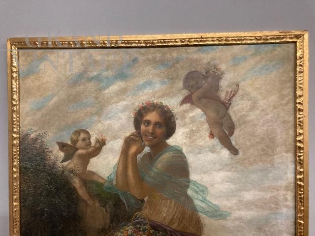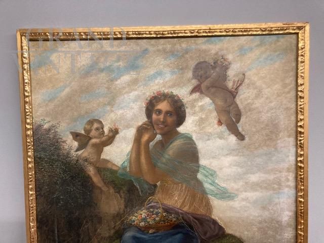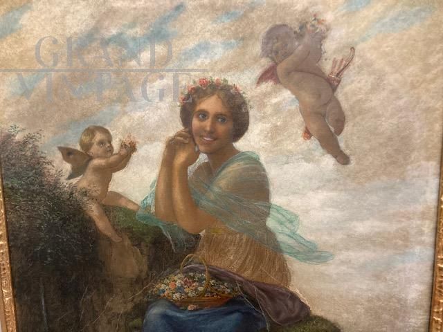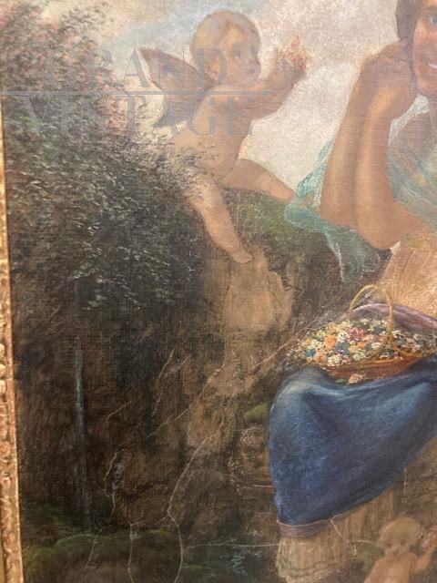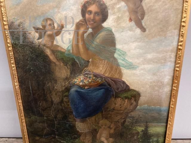 Grande dipinto Liberty art nouveau con contadina e putti, 1930