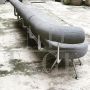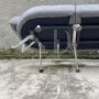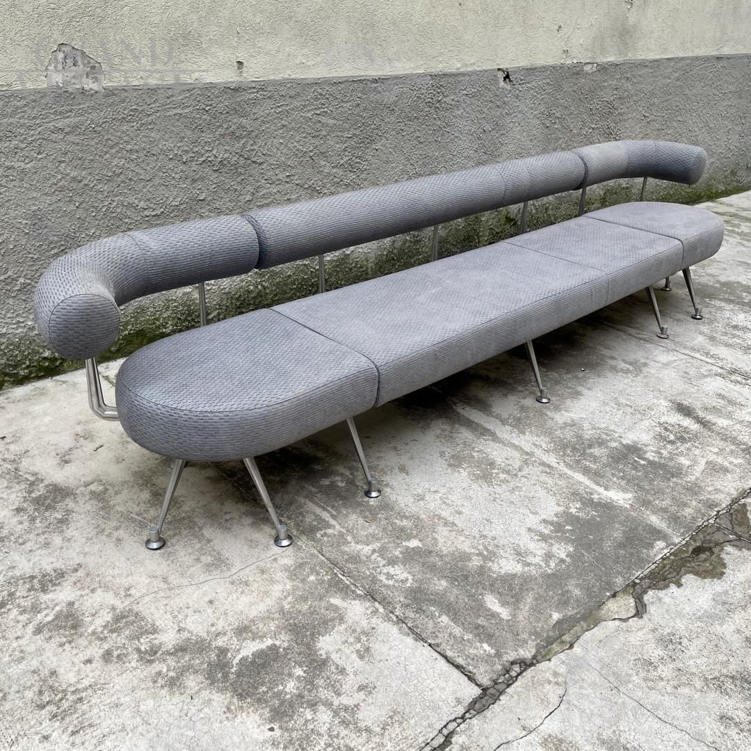 Grande divano anni '80 composto da un elemento centrale dritto e due elementi ai lati con forma stondata e schienale curvo. Ogni parte tappezzata è sfoderabile, i piedi sono regolabili e il reggischienale è in alluminio pressofuso. Non presenta parti lise, tagli o strappi. Disegno ispirato a grandi nomi del Design Italiano.