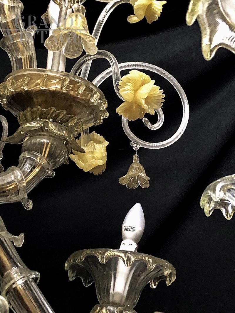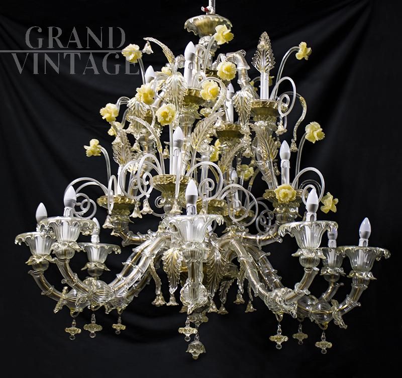 Grande e sontuoso lampadario in vetro di Murano con architettura a triplo palco configurata con 16 luci, telaio metallico rivestito in vetro con finiture e dettagli in oro e bianco. Allestimento con elementi floreali e roselline di colore giallo. Impianto luci perfettamente funzionante.
