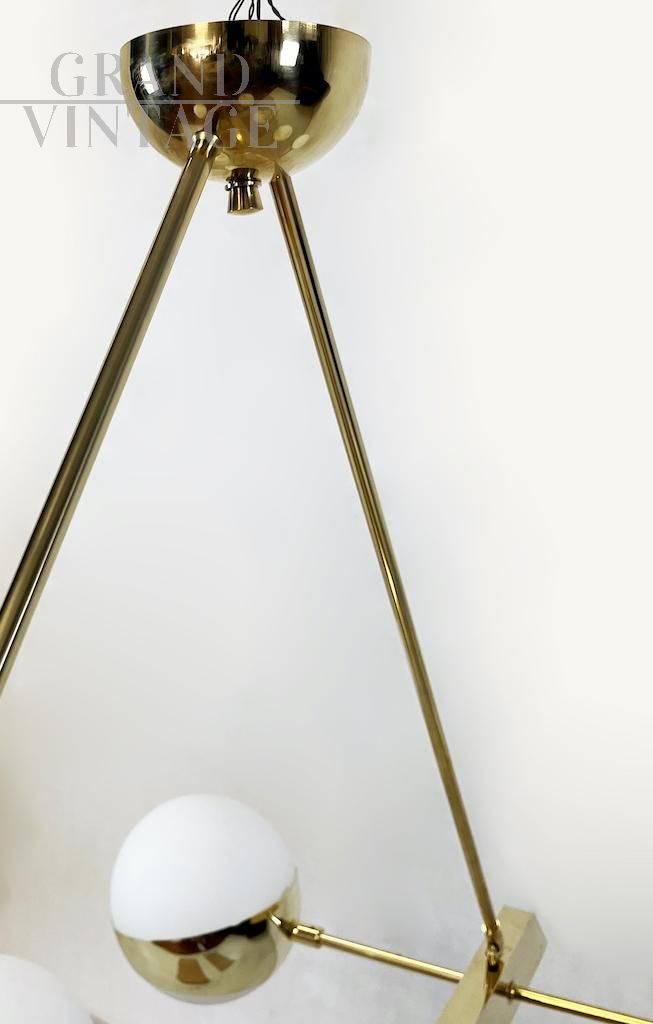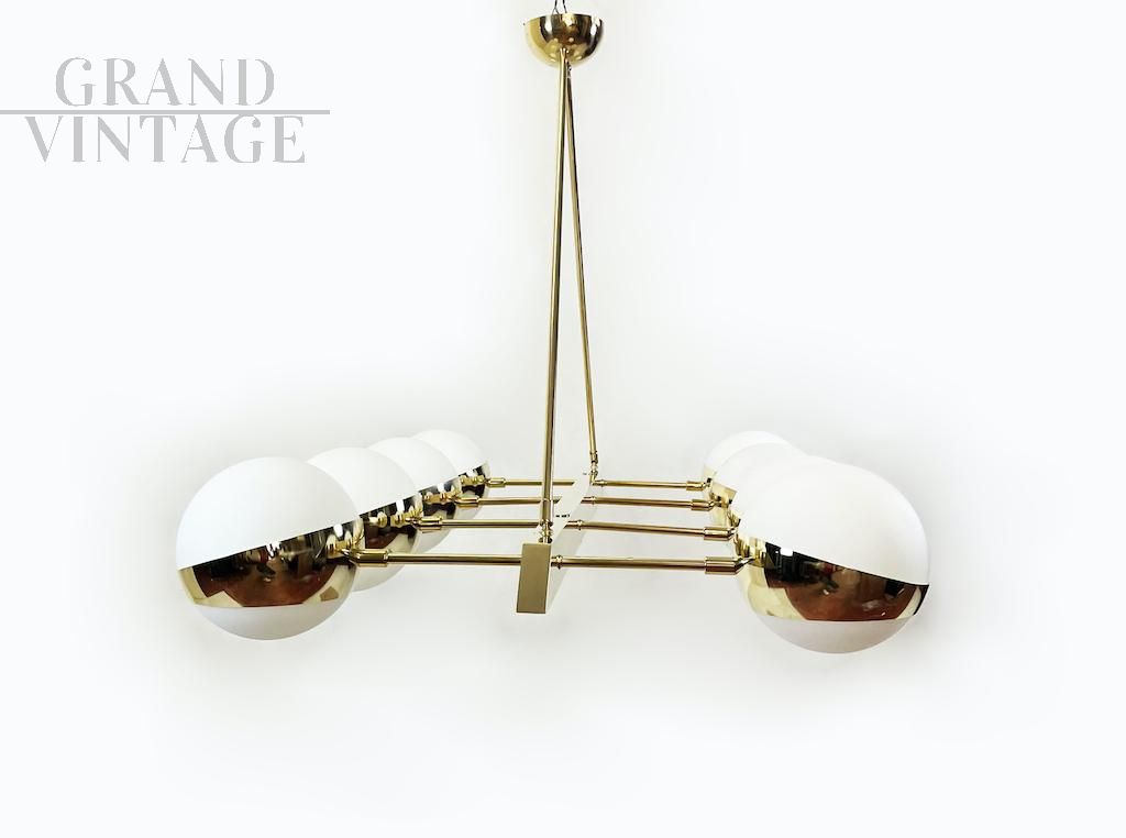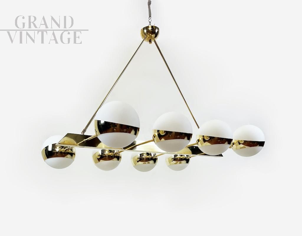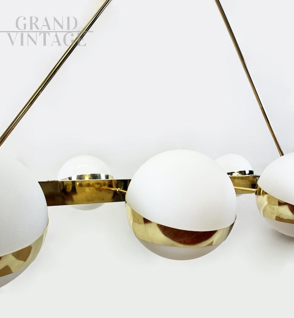 Elegante lampadario orizzontale vintage luxury degli anni '70 con struttura in ottone e otto punti luce a sfera in vetro opalino bianco disposti simmetricamente, perfetto per illuminare un grande tavolo.