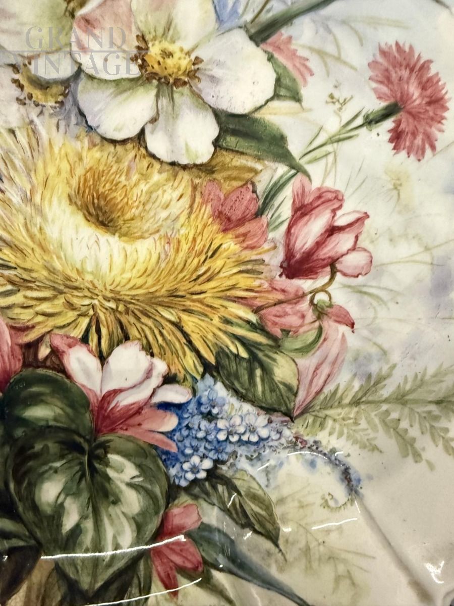 Grande piatto da portata antico in maiolica della fine dell'800 di manifattura Nove di Bassano, con magnifica forma a fazzoletto e finemente dipinto con motivi florali e farfalle, diametro 60 cm. Di splendida qualità pittorica, il piatto è in stato molto buono. Firmato sul retro.