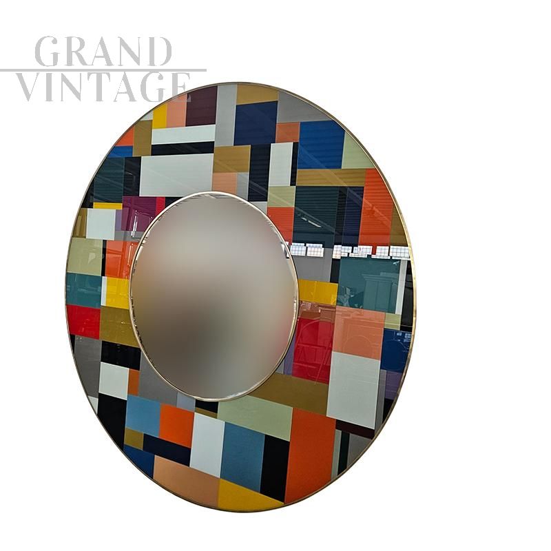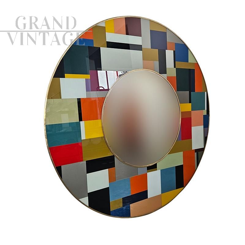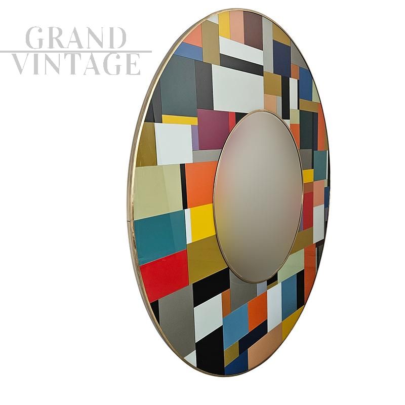 Specchiera con struttura in legno rotonda, rivestita in tessere di vetro, interamente realizzata a mano, profili in ottone dorato.
