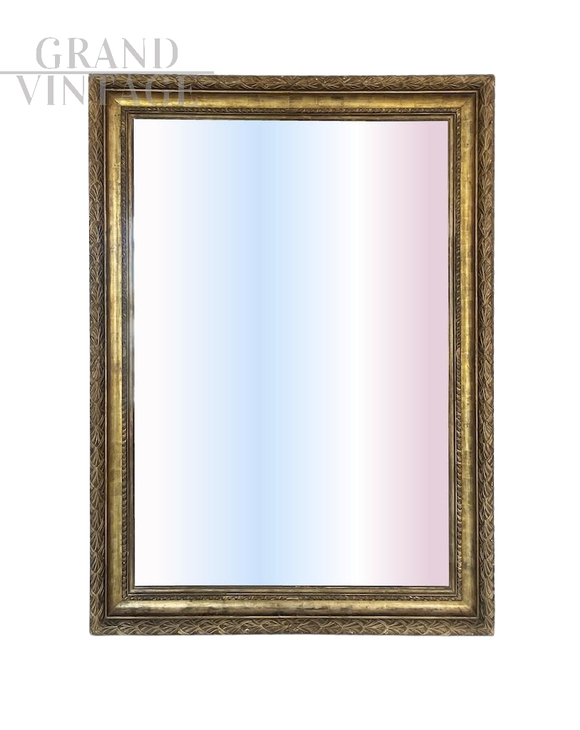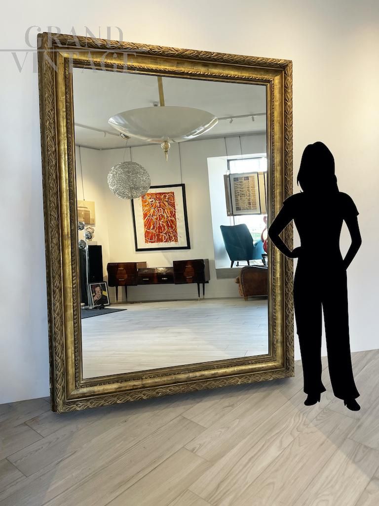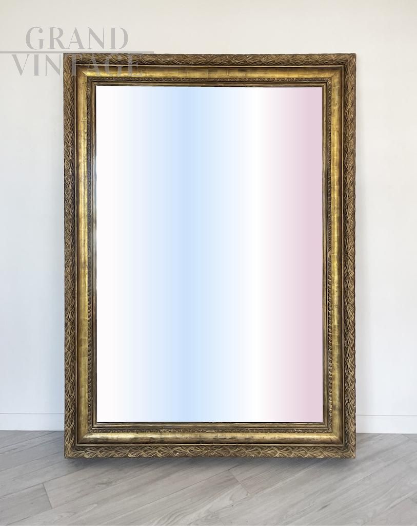 Elegante specchiera di fine XIX - inizio XX secolo caratterizzata da una cornice di legno dorata finemente lavorata. La spessa cornice presenta alcuni segni d’usura dovuti al tempo in quanto mantenuta nel suo stato originale. Effetto d’arredamento particolare ottenuto sia dal posizionamento sul pavimento sia appesa alla parete.
