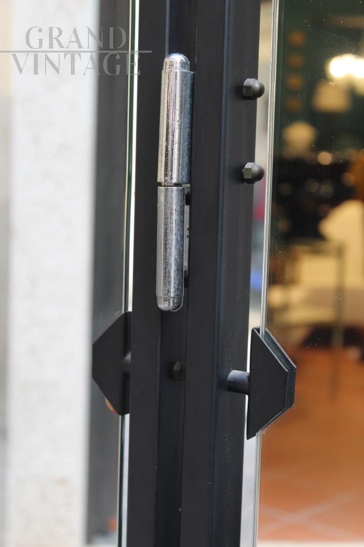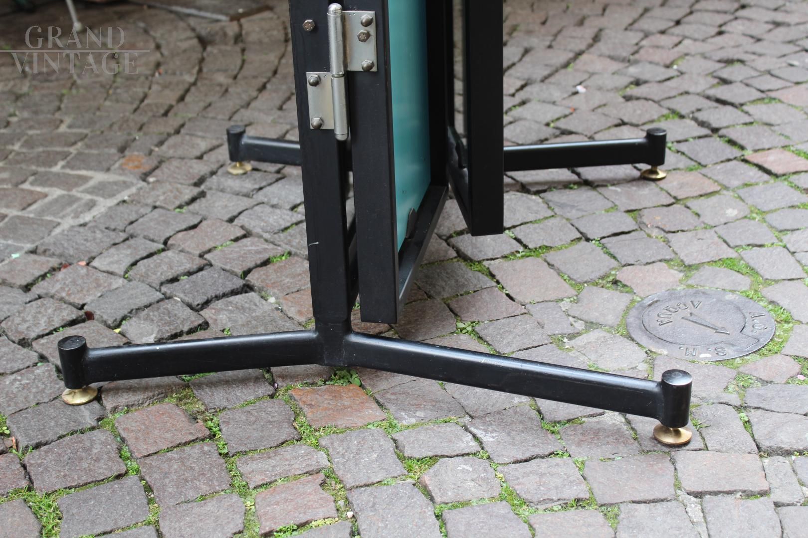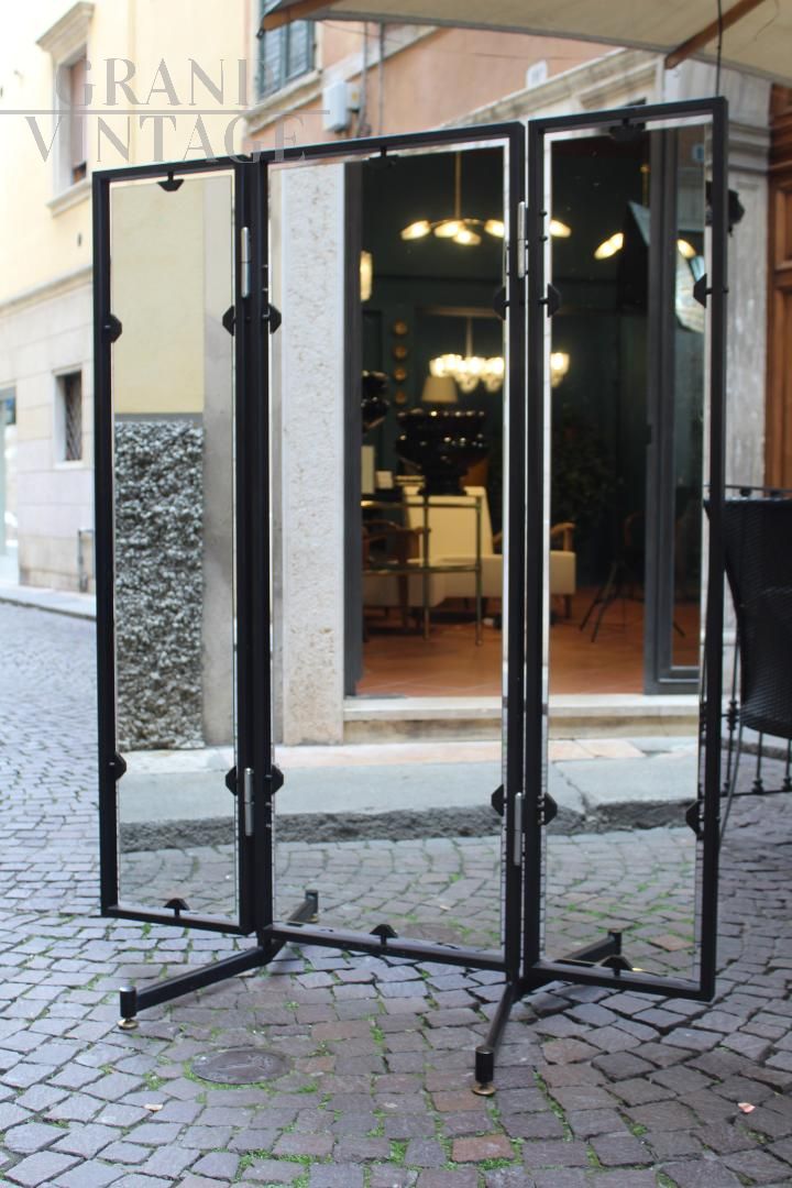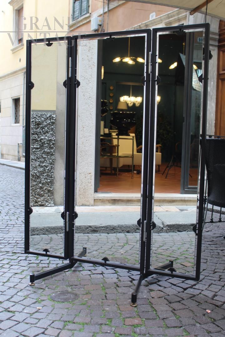 Specchio da atelier vintage pieghevole, Italia anni '70, composto da 3 specchi separati direzionabili su struttura in metallo laccato nero con piedini in ottone, apparteneva ad un importnte atelier della città di Verona. In ottimo stato di conservazione.