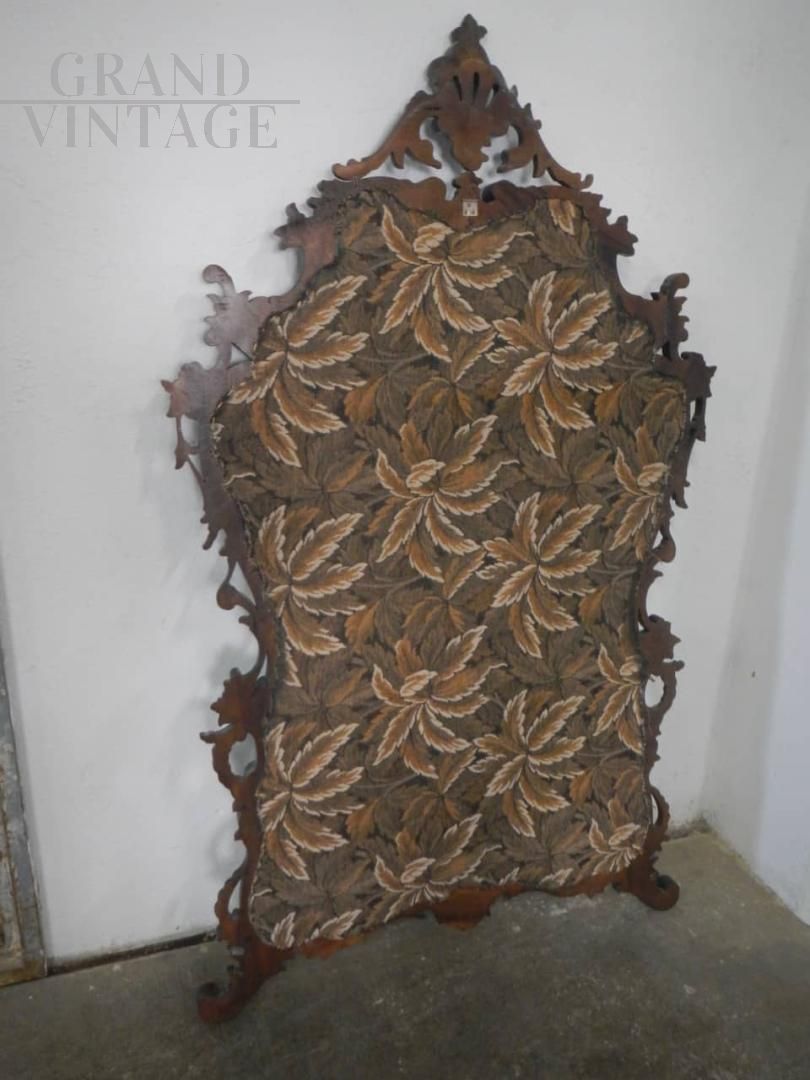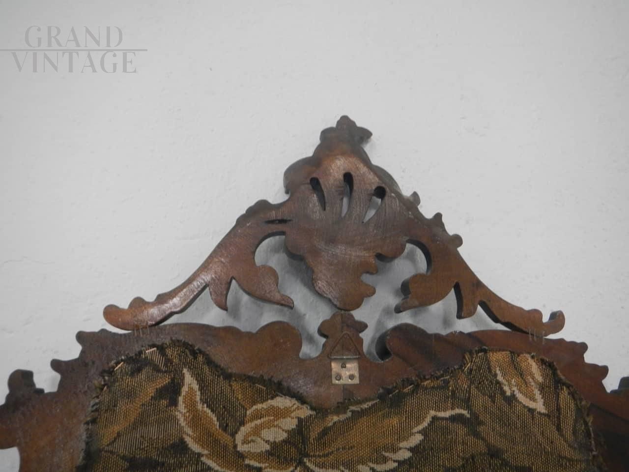 Specchio in stile barocco in legno di tiglio in pittura marrone, finemente intagliato a riccioli e volute, completo di ganci per appenderlo. Il retro è ricoperto di stoffa con fantasia floreale. In buone condizioni, il prezzo è complessivo di un imballo con cassa in legno.