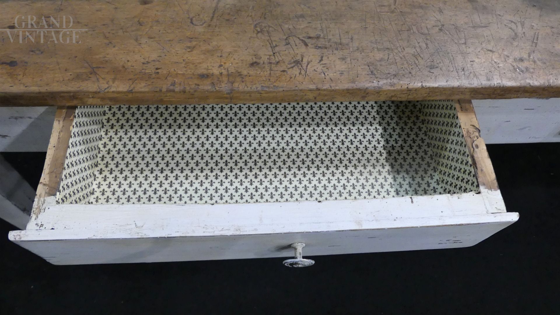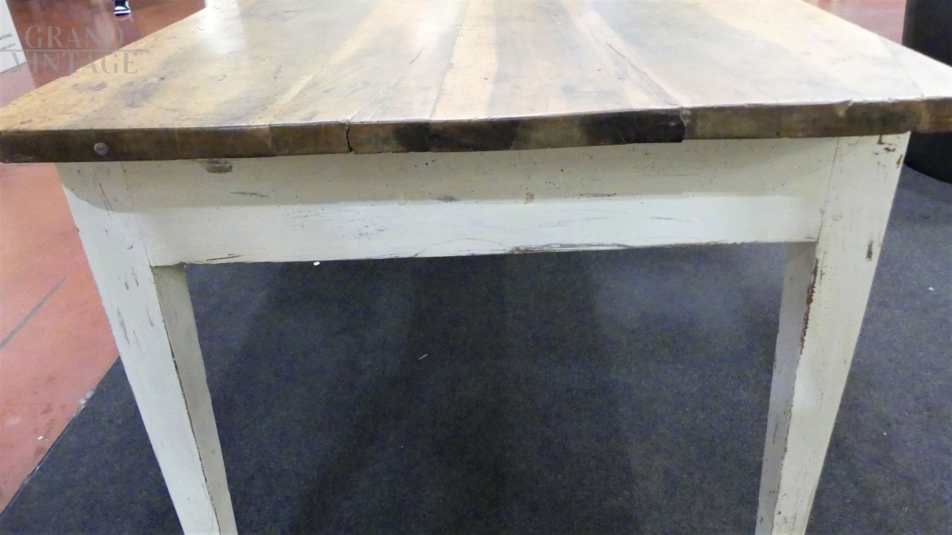 Grande tavolo da cucina toscano della fine del '700 / Inizio '800, tutto originale, con struttura in legno di castagno laccato bianco e piano in massello di noce, completo di due cassetti.